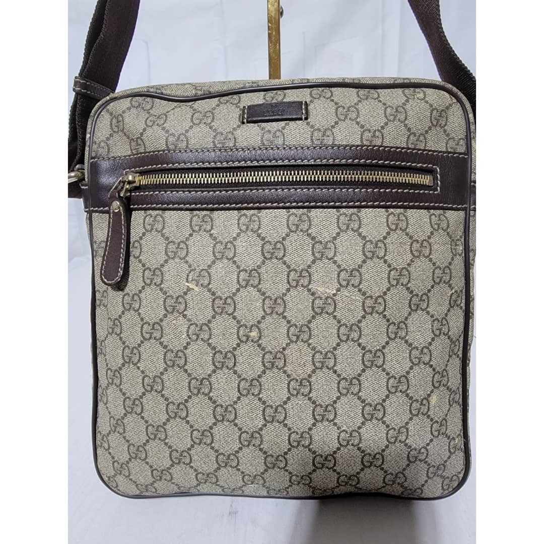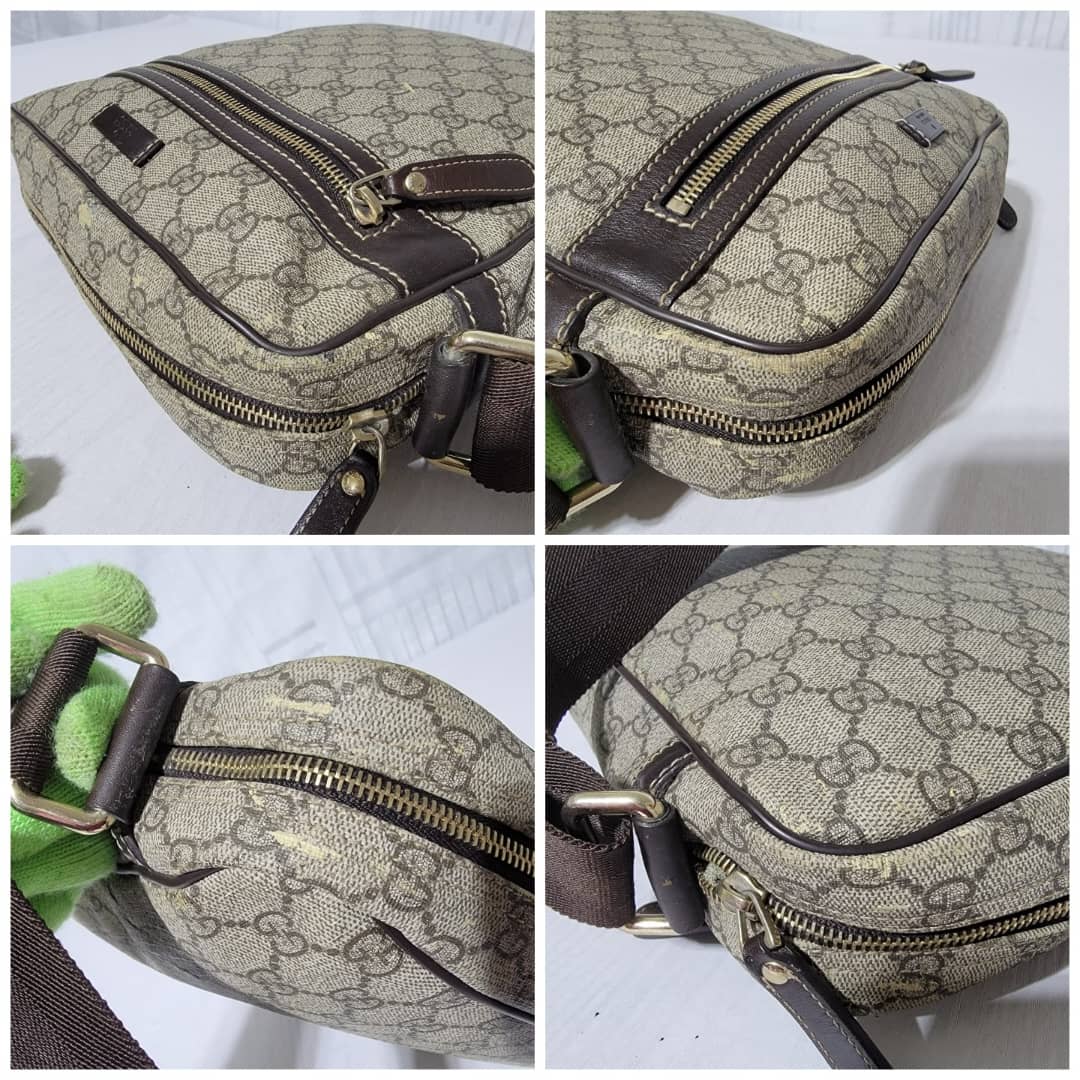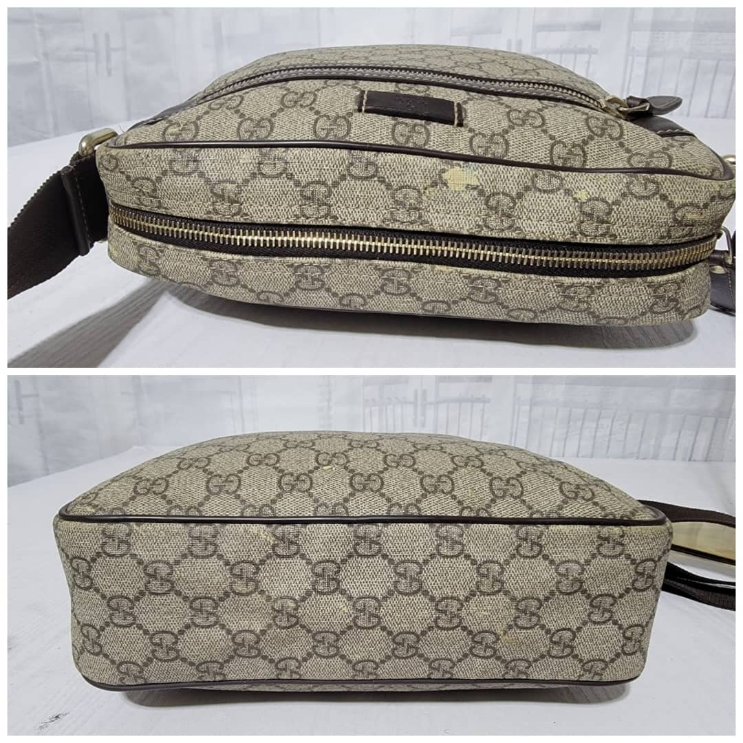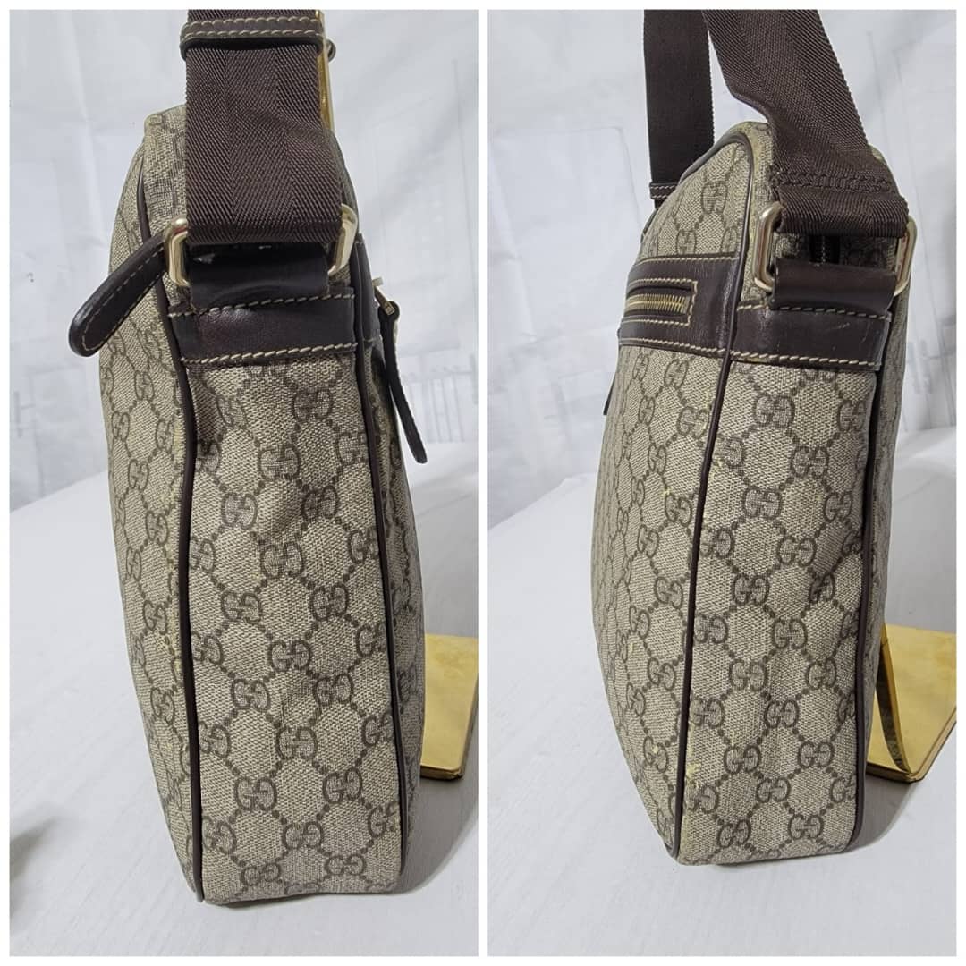 This authentic GUCCI GG Supreme Messenger/Crossbody Bag PVC Leather Beige/Brown is in it’s pre-owned condition. The exterior is clean however, it shows some little leather peel. Kindly look at pictures for all the little scuffing and peel on the bag. Interior is clean.