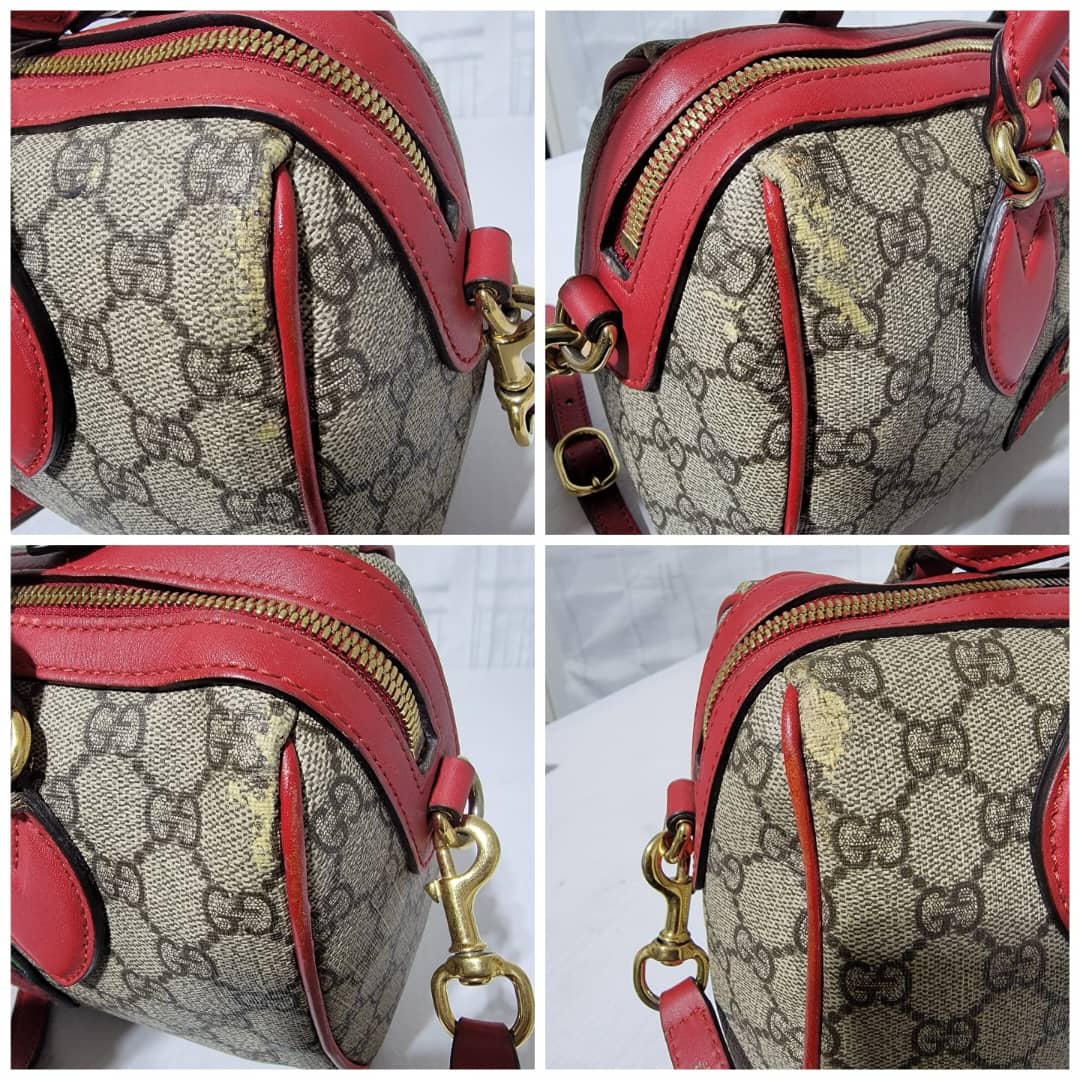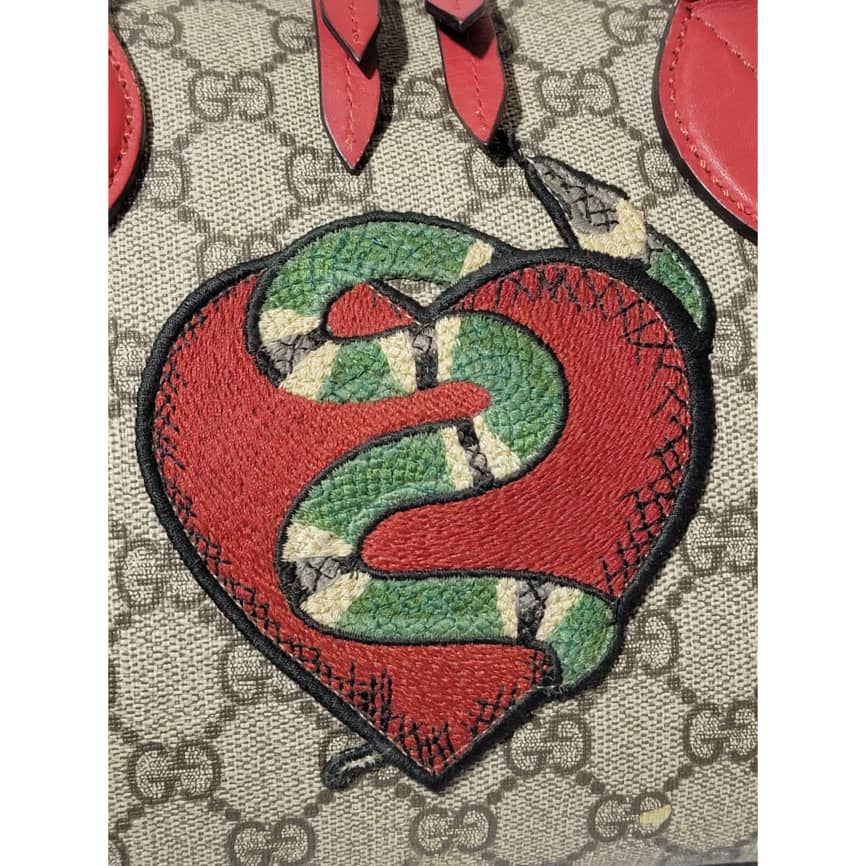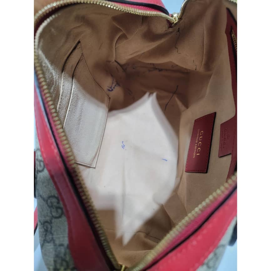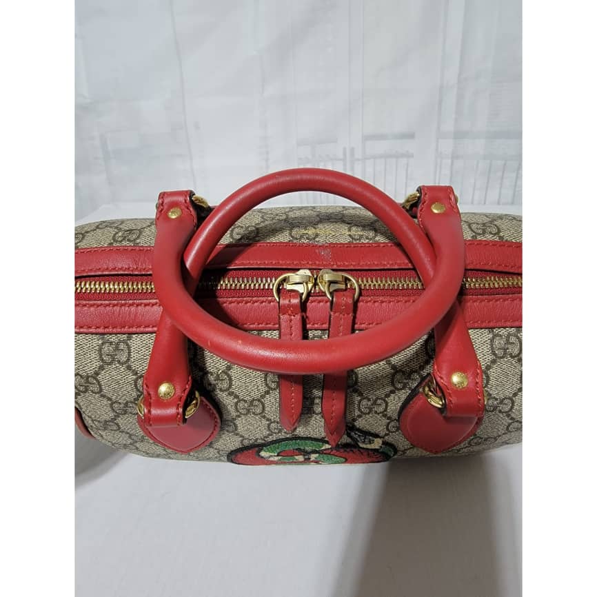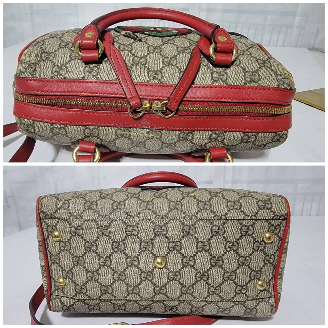 This authentic GUCCI GG Supreme Monogram Kingsnake Heart Embroidered Small Boston Bag Red is in it’s pre-owned condition. The exterior is clean however, it shows some dent by the side of the bag, dent on the GG canvas. There is a little peeling at the top edge of the bag and by the top edge and side of the back ( Kindly look at pictures for all visible wears on this bag). Interior is clean, however it shows pen mark in the interior lining. Comes with a long strap.