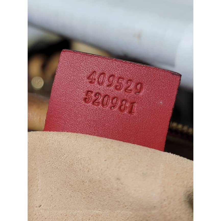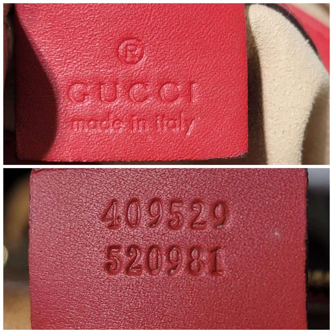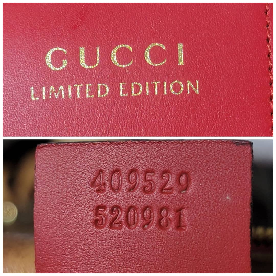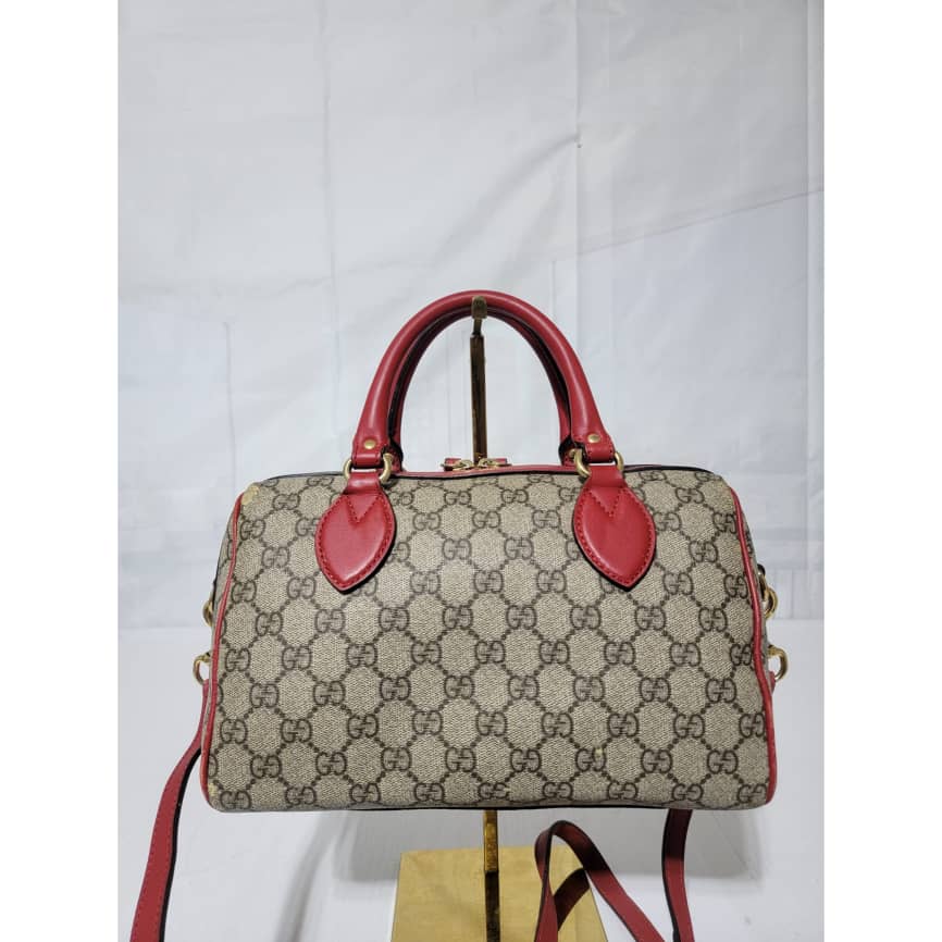 This authentic GUCCI GG Supreme Monogram Kingsnake Heart Embroidered Small Boston Bag Red is in it’s pre-owned condition. The exterior is clean however, it shows some dent by the side of the bag, dent on the GG canvas. There is a little peeling at the top edge of the bag and by the top edge and side of the back ( Kindly look at pictures for all visible wears on this bag). Interior is clean, however it shows pen mark in the interior lining. Comes with a long strap.