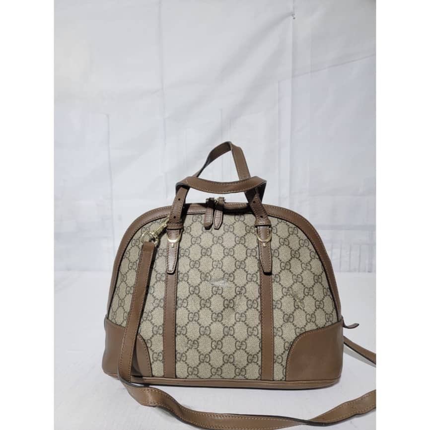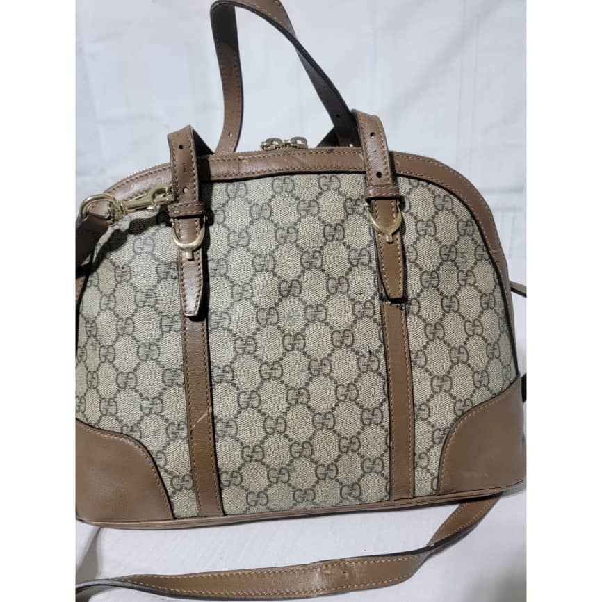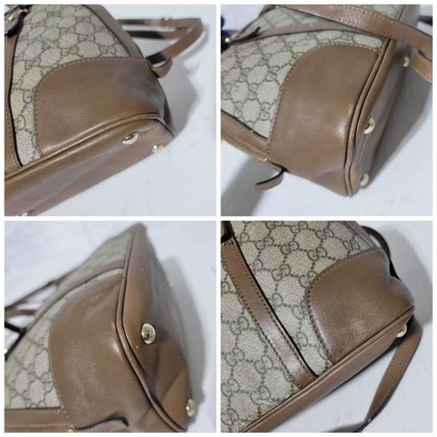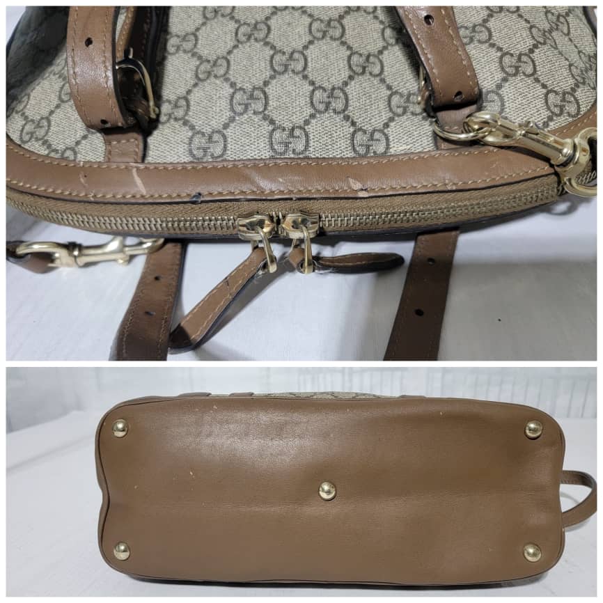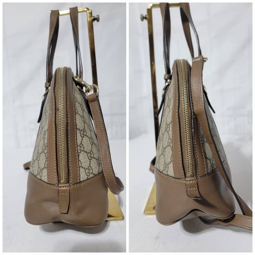 This authentic GUCCI GG Supreme Monogram Small Nice Top Handle Dome Bag Maple Brown/Beige is in it’s pre-owned condition. The exterior coated canvas shows sign of some peeling on the GG print and scratches to the leather trim on the bag (Kindly look at pictures above). Interior is clean.