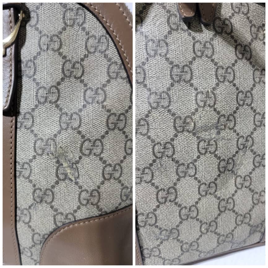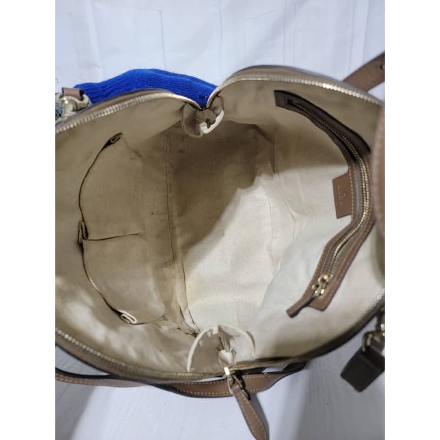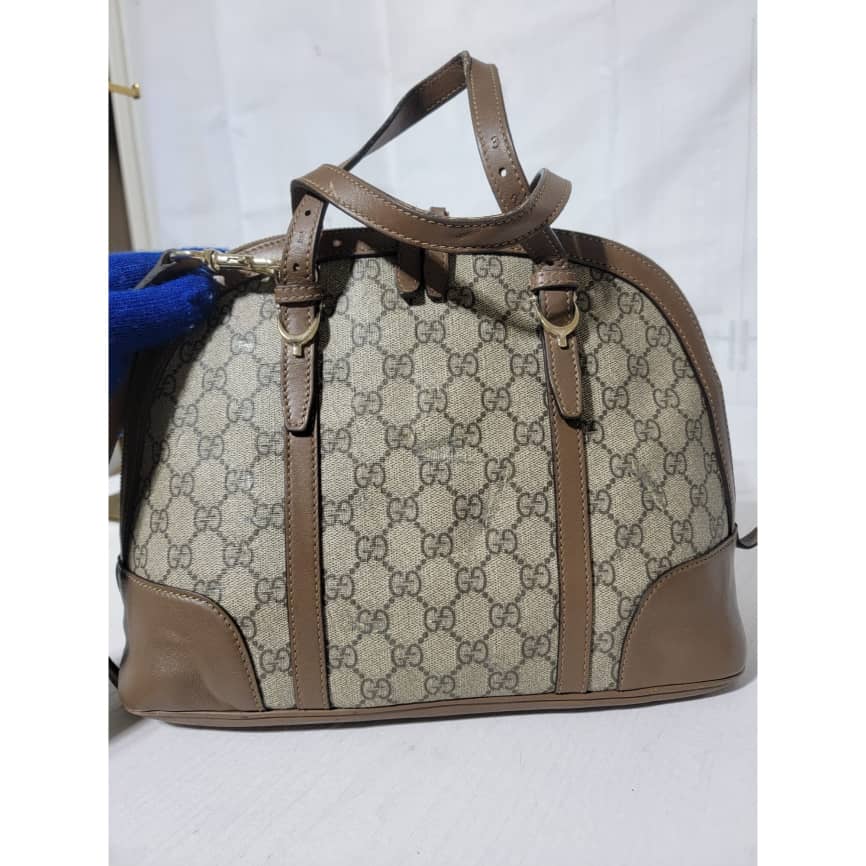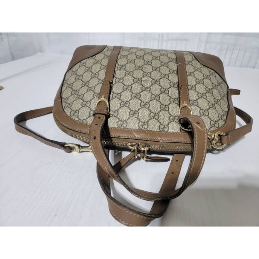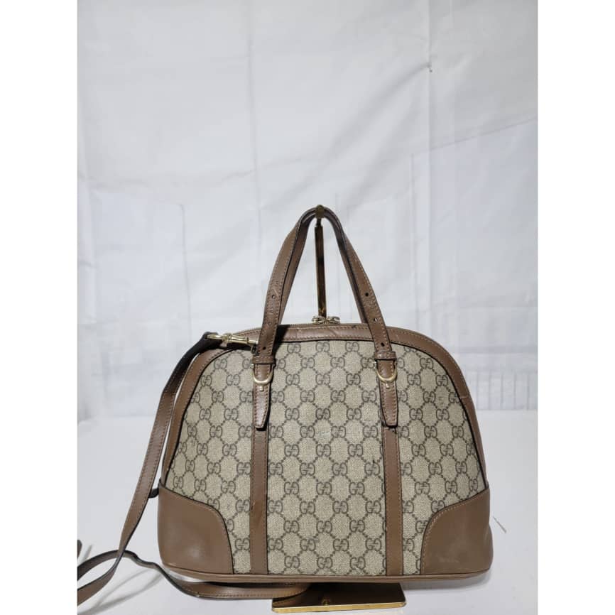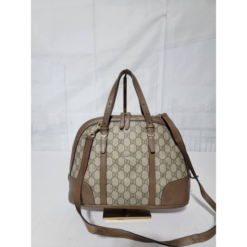 This authentic GUCCI GG Supreme Monogram Small Nice Top Handle Dome Bag Maple Brown/Beige is in it’s pre-owned condition. The exterior coated canvas shows sign of some peeling on the GG print and scratches to the leather trim on the bag (Kindly look at pictures above). Interior is clean.
