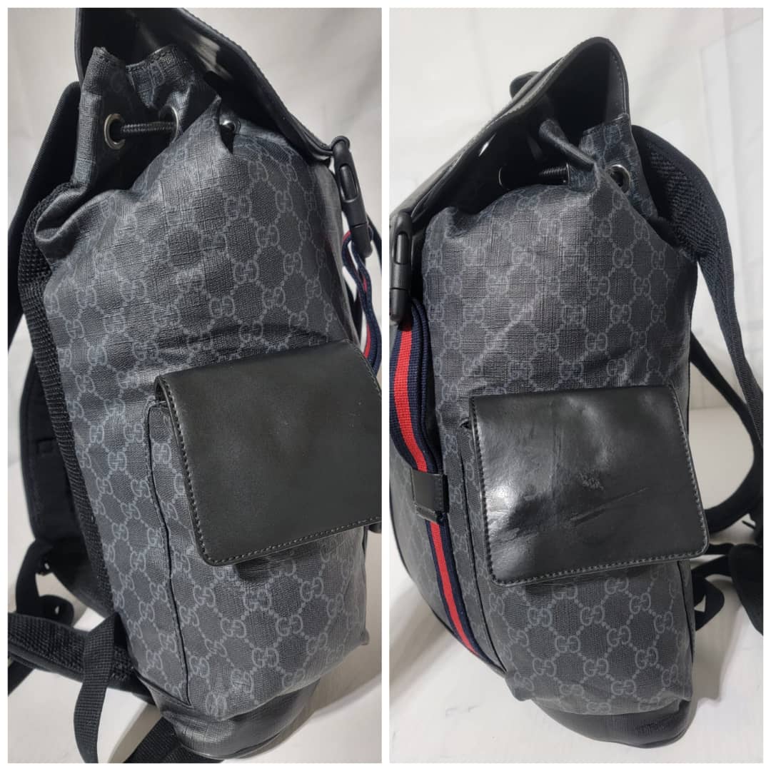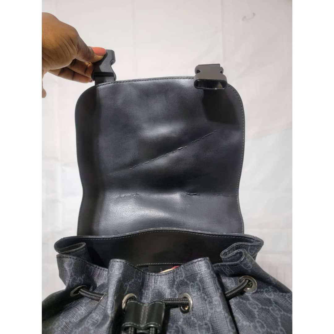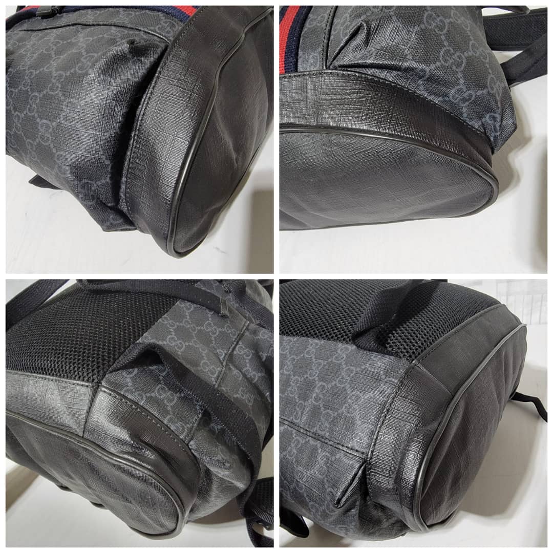 This authentic Gucci GG Supreme Web Backpack Black/Grey is in it’s good pre-owned condition. The exterior coated canvas is clean and beautiful. Interior is clean. It is a very great backpack.