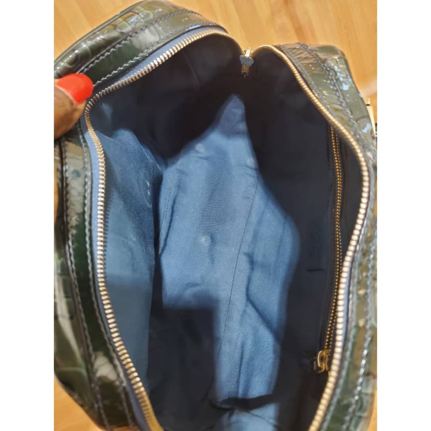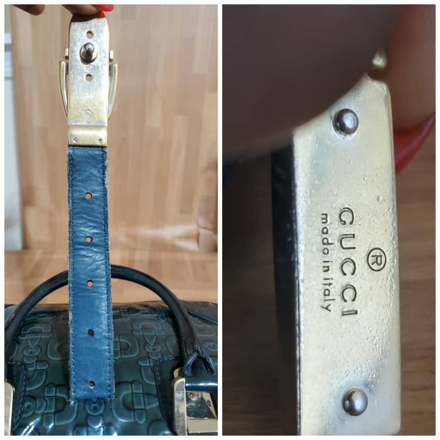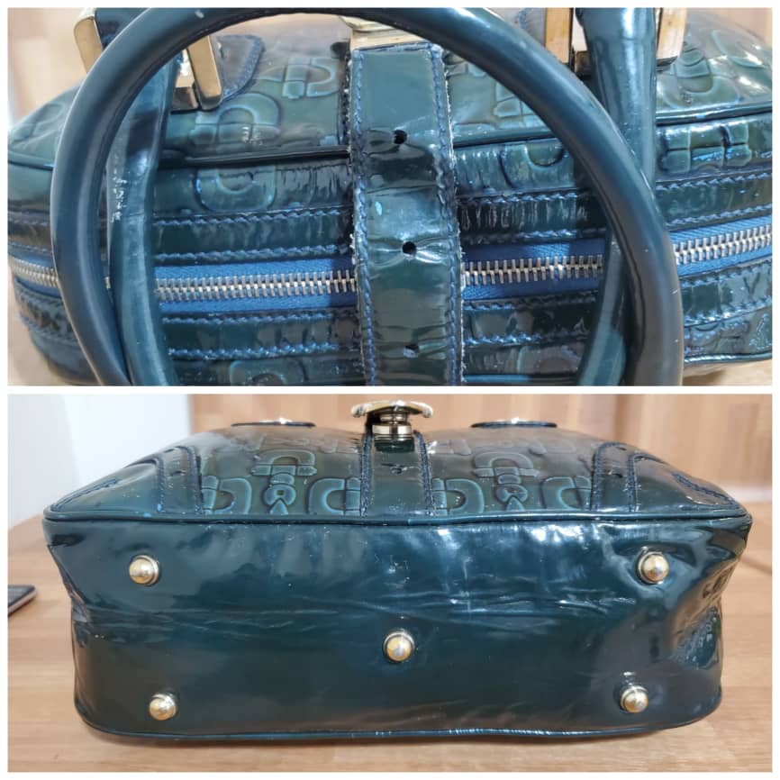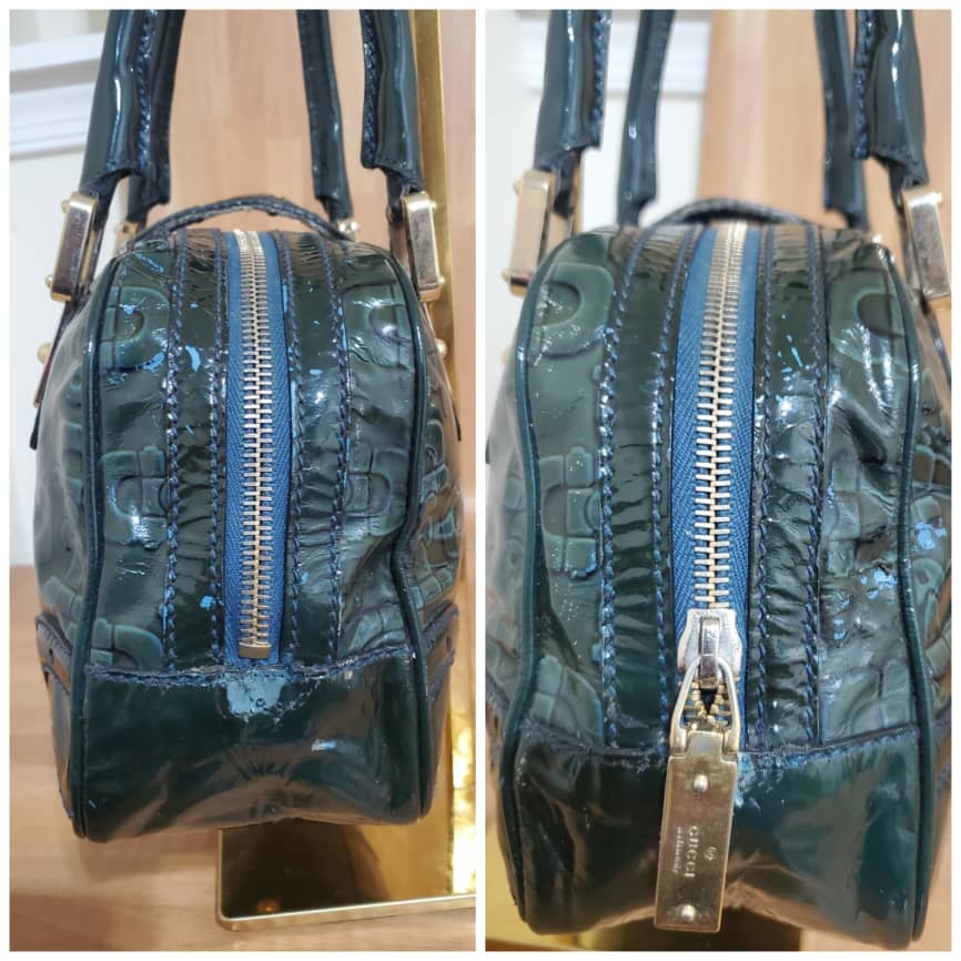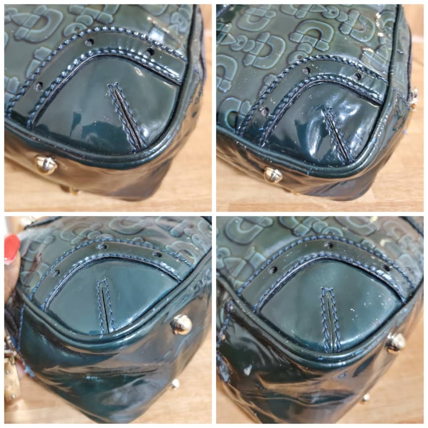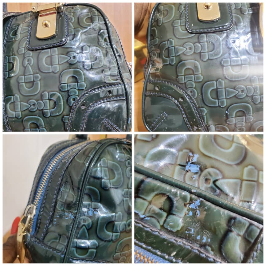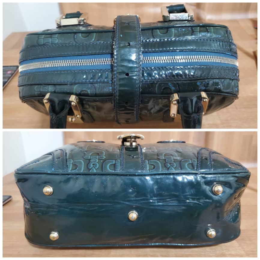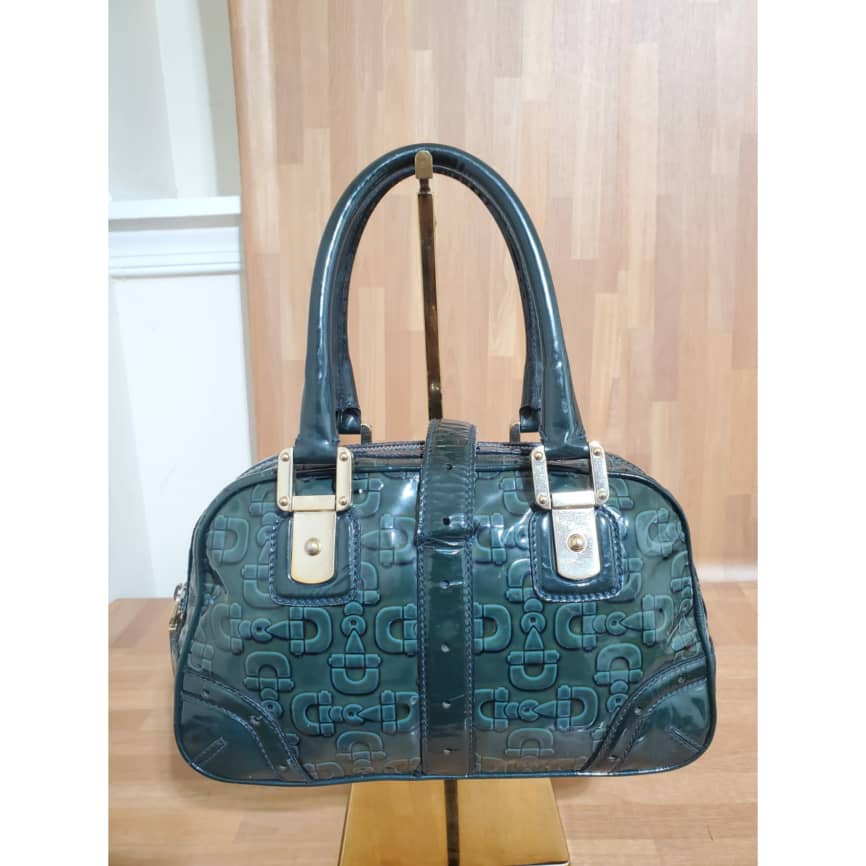 This authentic Gucci Green Patent Leather Leather Horsebit Shoulder Bag is in it’s pre-owned condition.has sign of use . Has some tiny little white on the leather patent leather. Interior is clean.