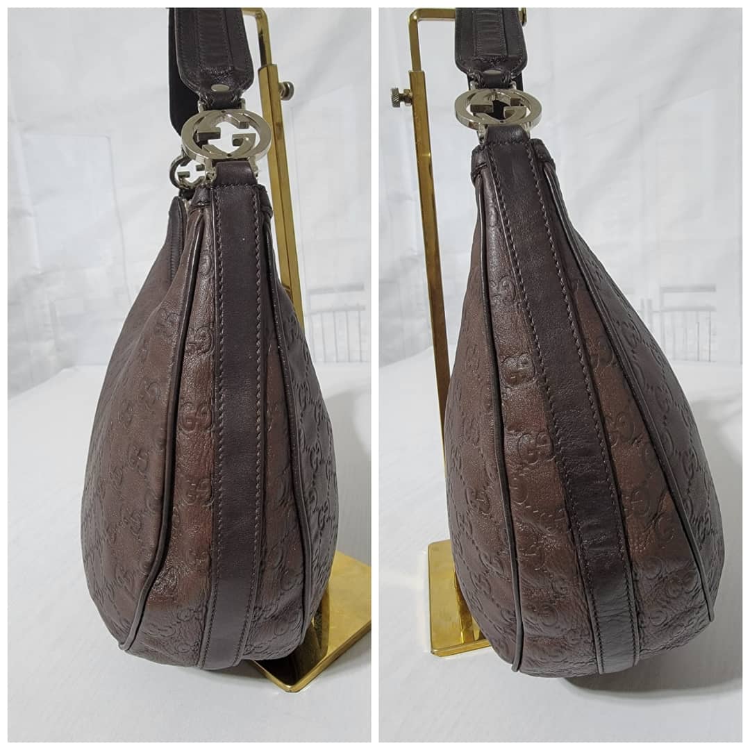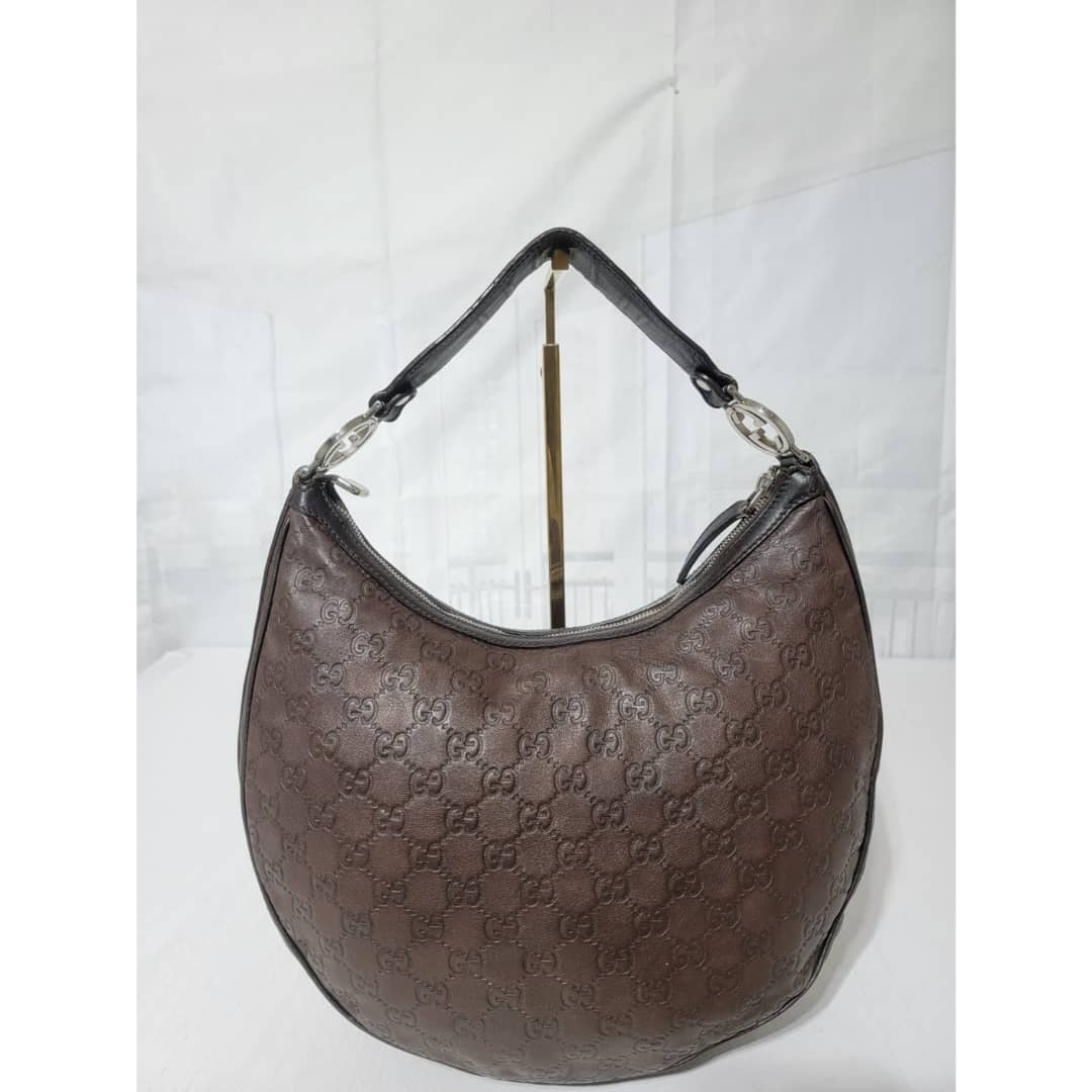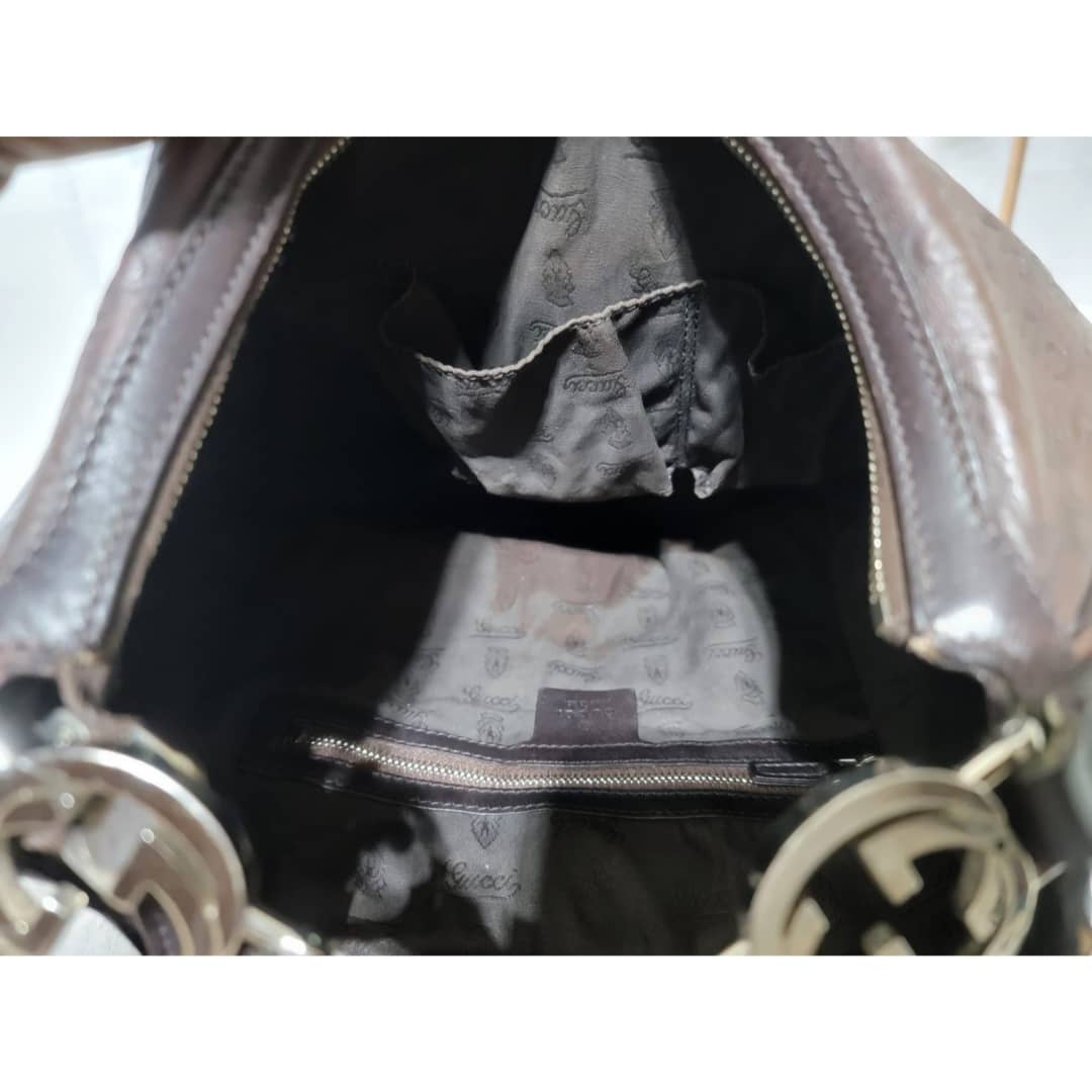 This authentic Gucci Guccissima Twins Hobo Dark Brown Bag is in it’s good pre-owned condition. The exterior leather is clean and beautiful. Interior is clean. Silver hardware with a GG logo at the hobo handle.