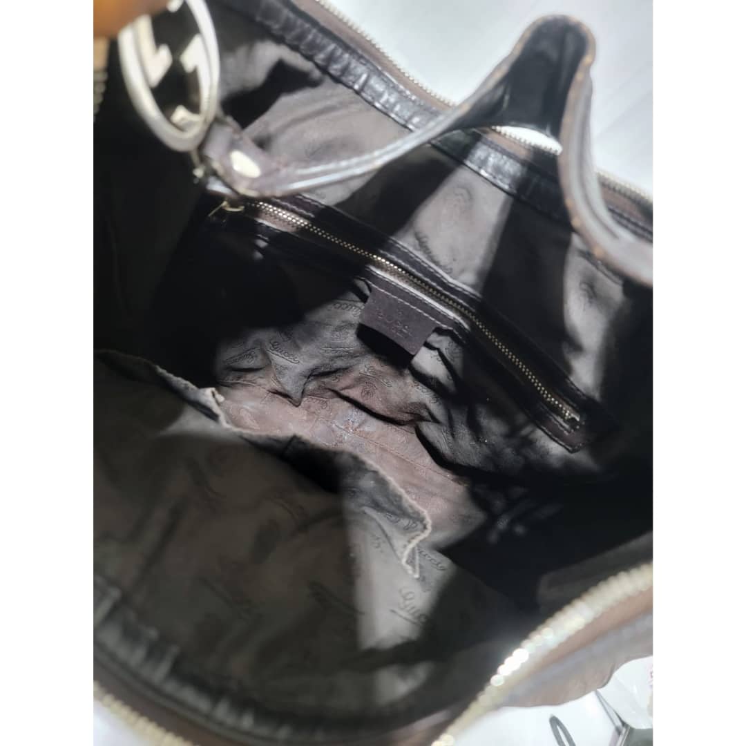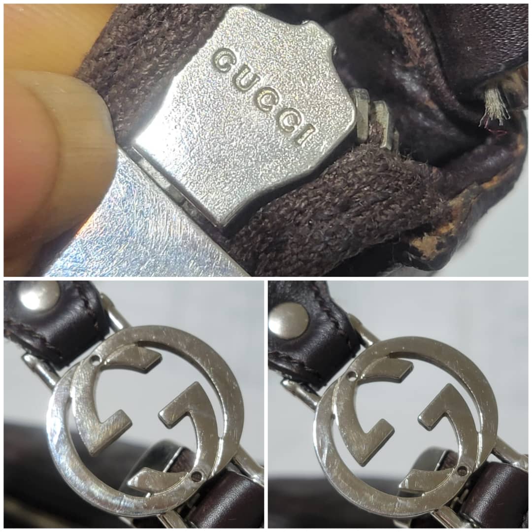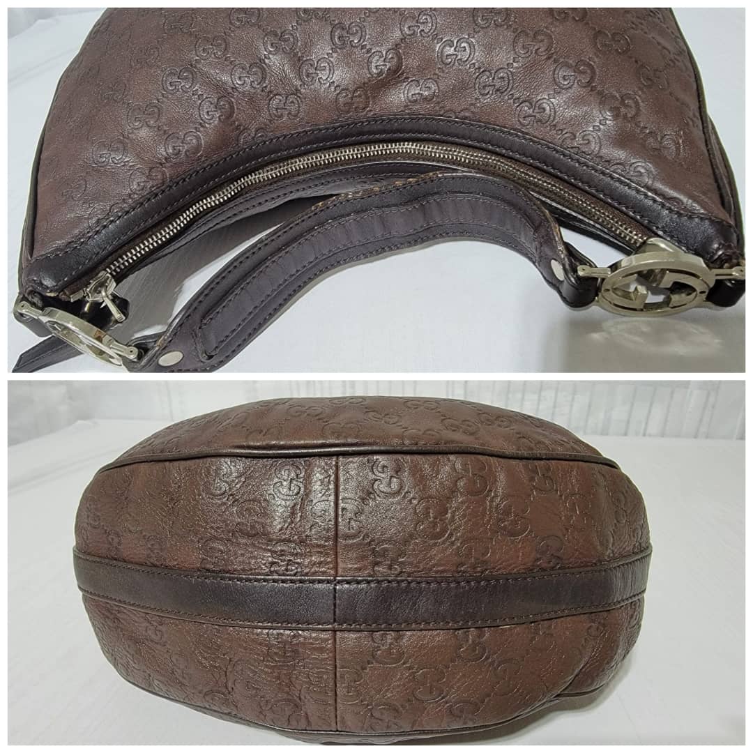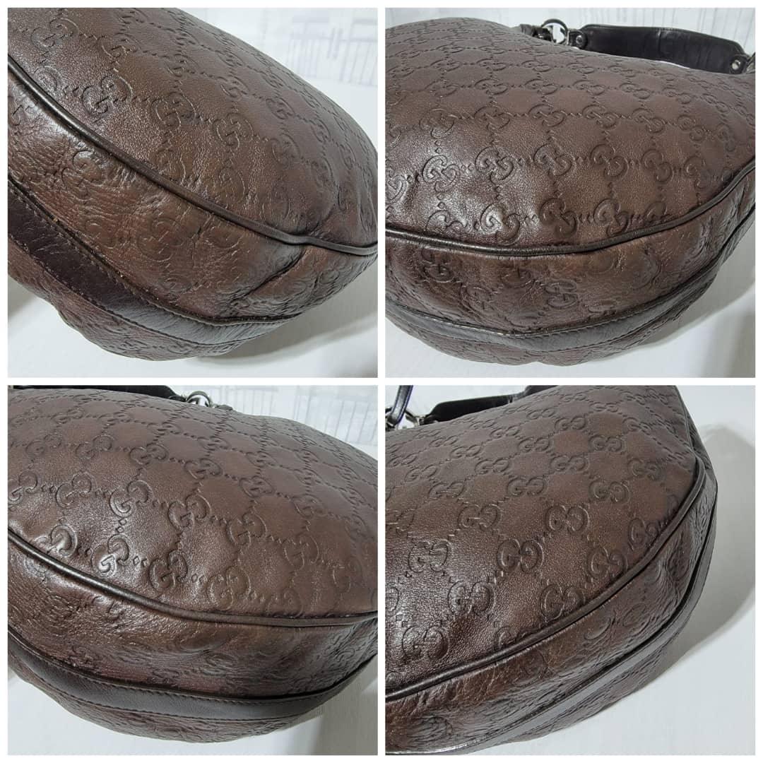 This authentic Gucci Guccissima Twins Hobo Dark Brown Bag is in it’s good pre-owned condition. The exterior leather is clean and beautiful. Interior is clean. Silver hardware with a GG logo at the hobo handle.