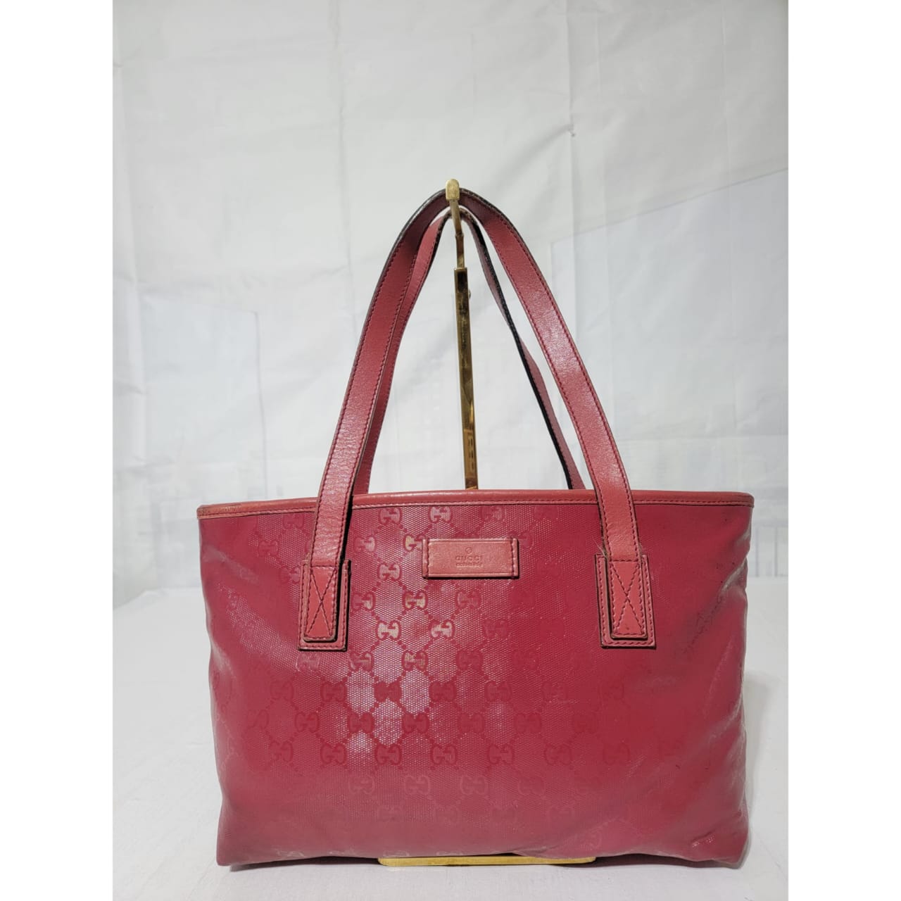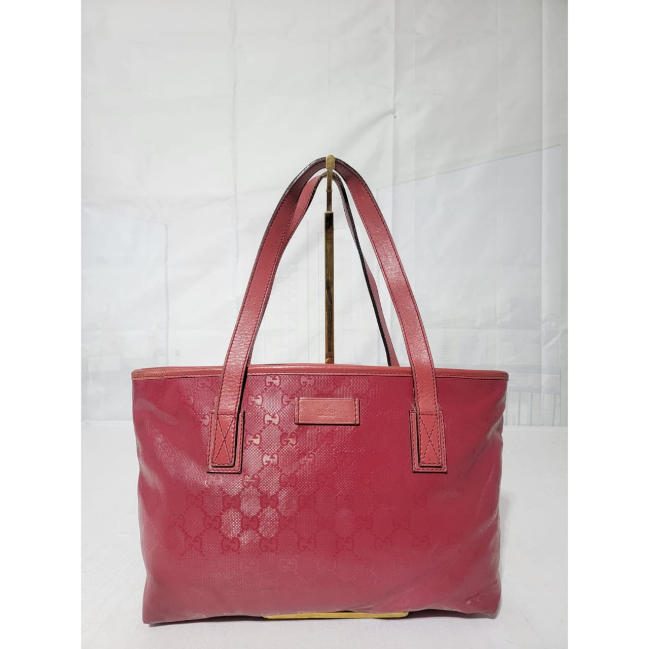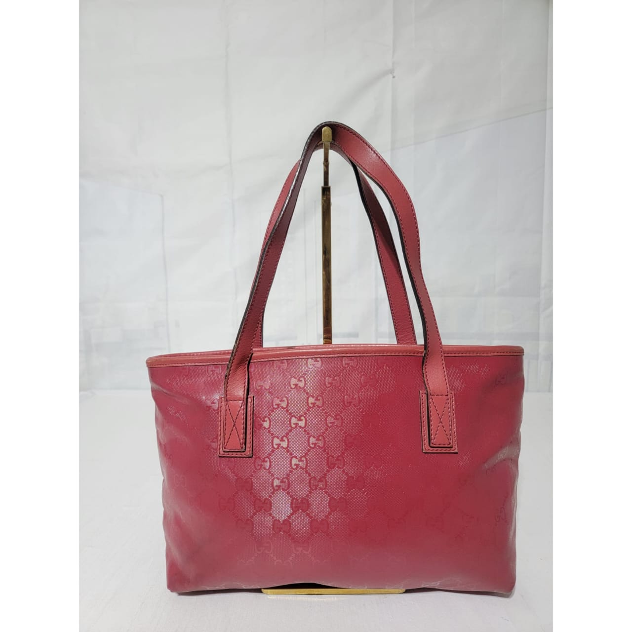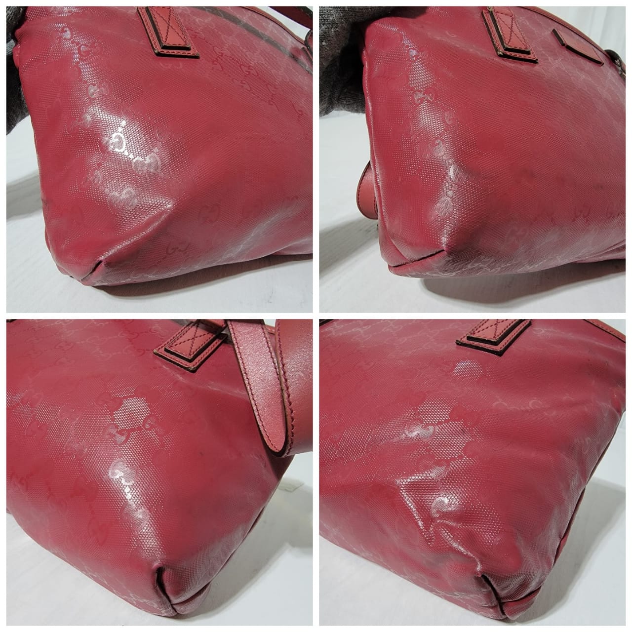 This authentic GUCCI Imprime Monogram Small Joy Tote Bag Rose Blush is in it’s pre-owned condition. The exterior is clean. Interior is clean. The leather trim that runs on the handle of the bag and the top trim shows some scratches. The base edges shows some scuffing (Kindly look at pictures above).
