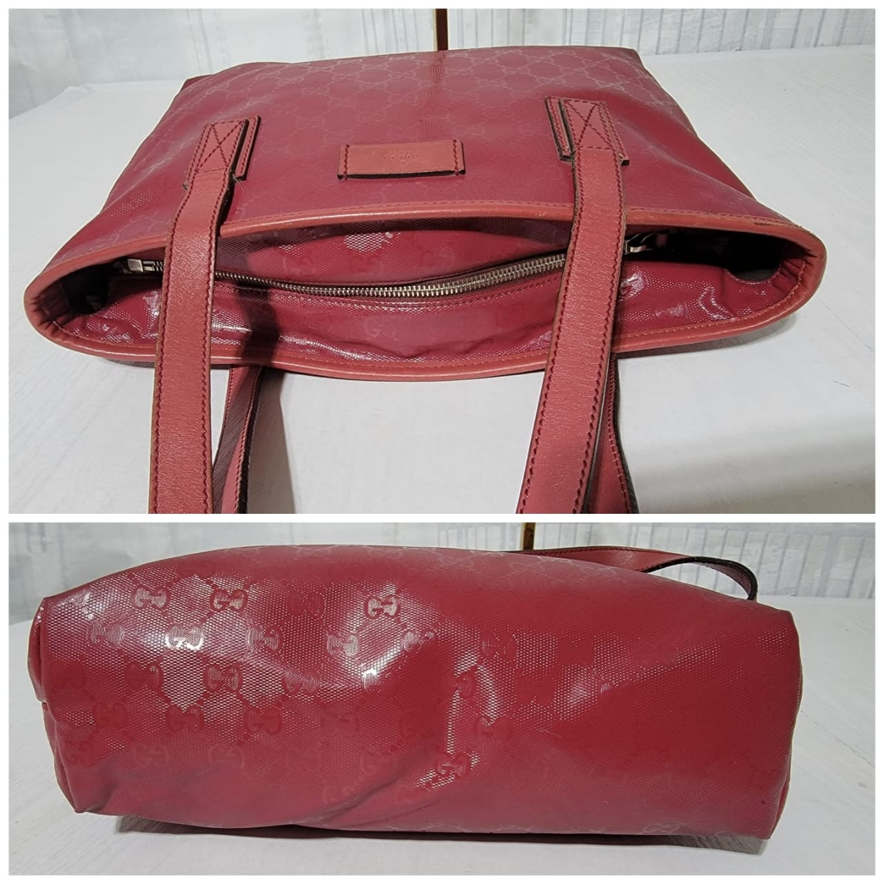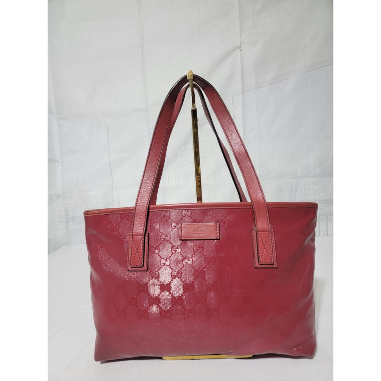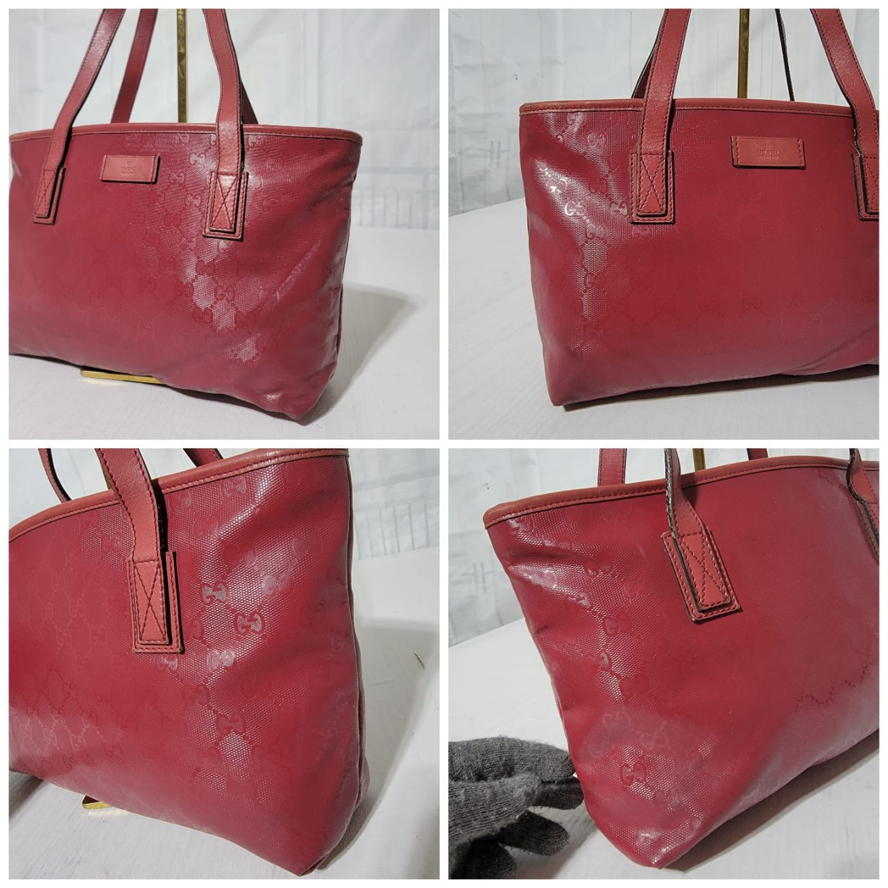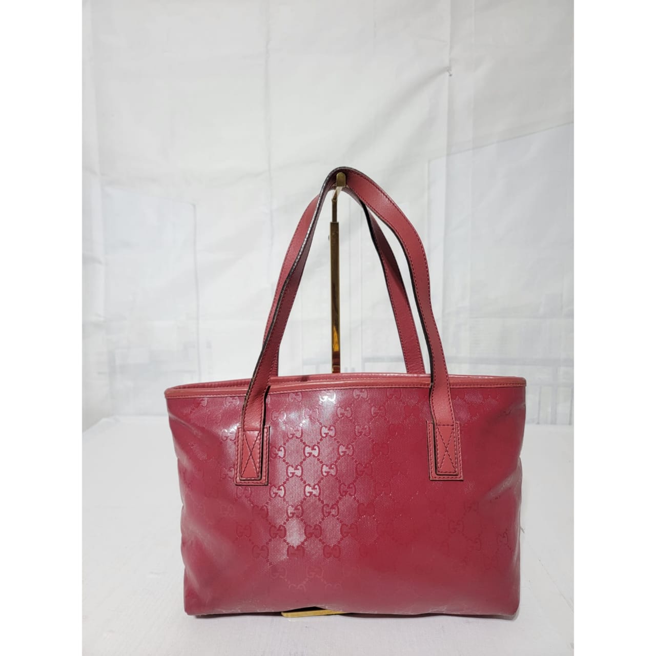 This authentic GUCCI Imprime Monogram Small Joy Tote Bag Rose Blush is in it’s pre-owned condition. The exterior is clean. Interior is clean. The leather trim that runs on the handle of the bag and the top trim shows some scratches. The base edges shows some scuffing (Kindly look at pictures above).