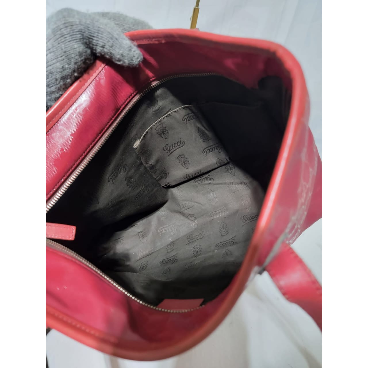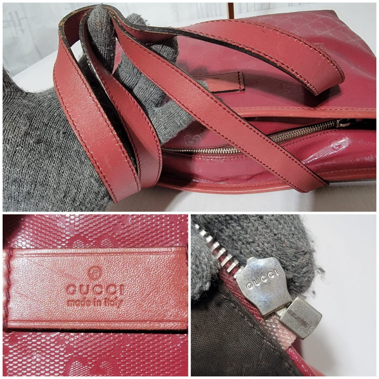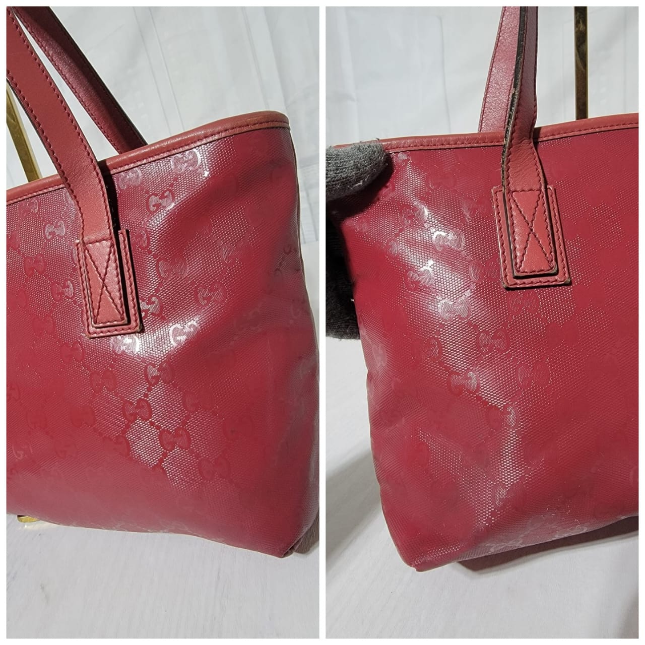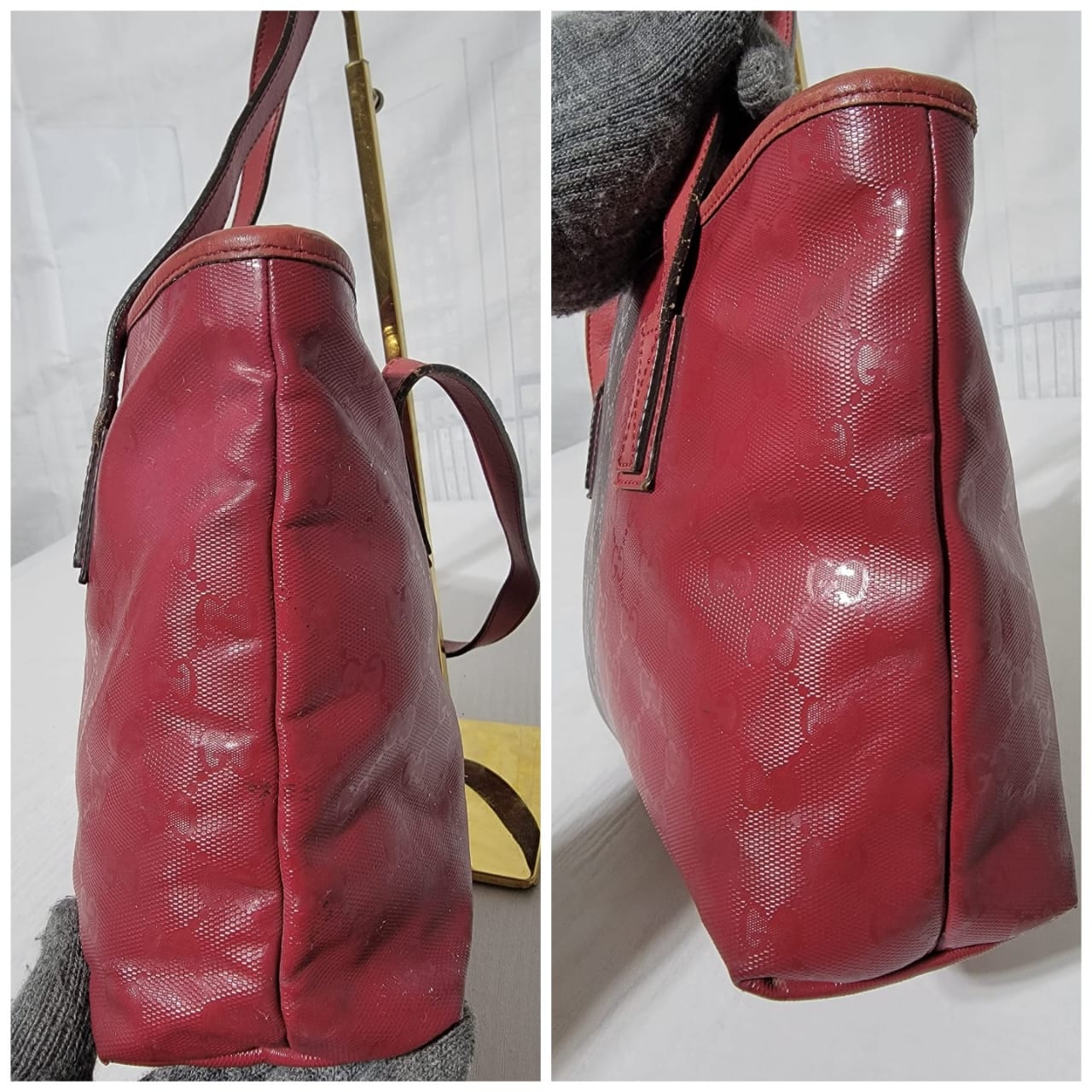 This authentic GUCCI Imprime Monogram Small Joy Tote Bag Rose Blush is in it’s pre-owned condition. The exterior is clean. Interior is clean. The leather trim that runs on the handle of the bag and the top trim shows some scratches. The base edges shows some scuffing (Kindly look at pictures above).