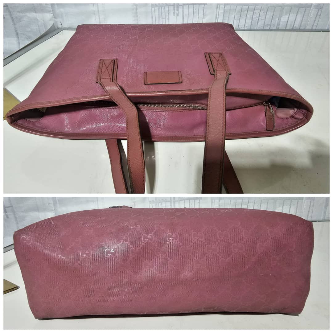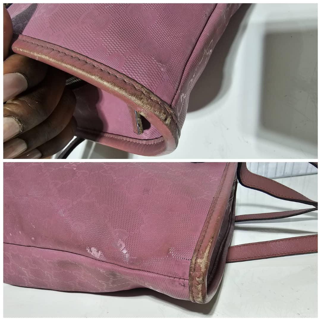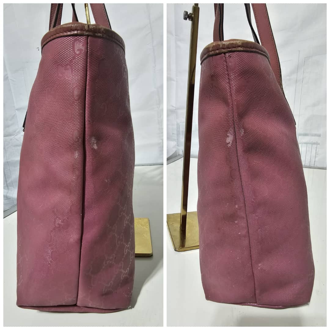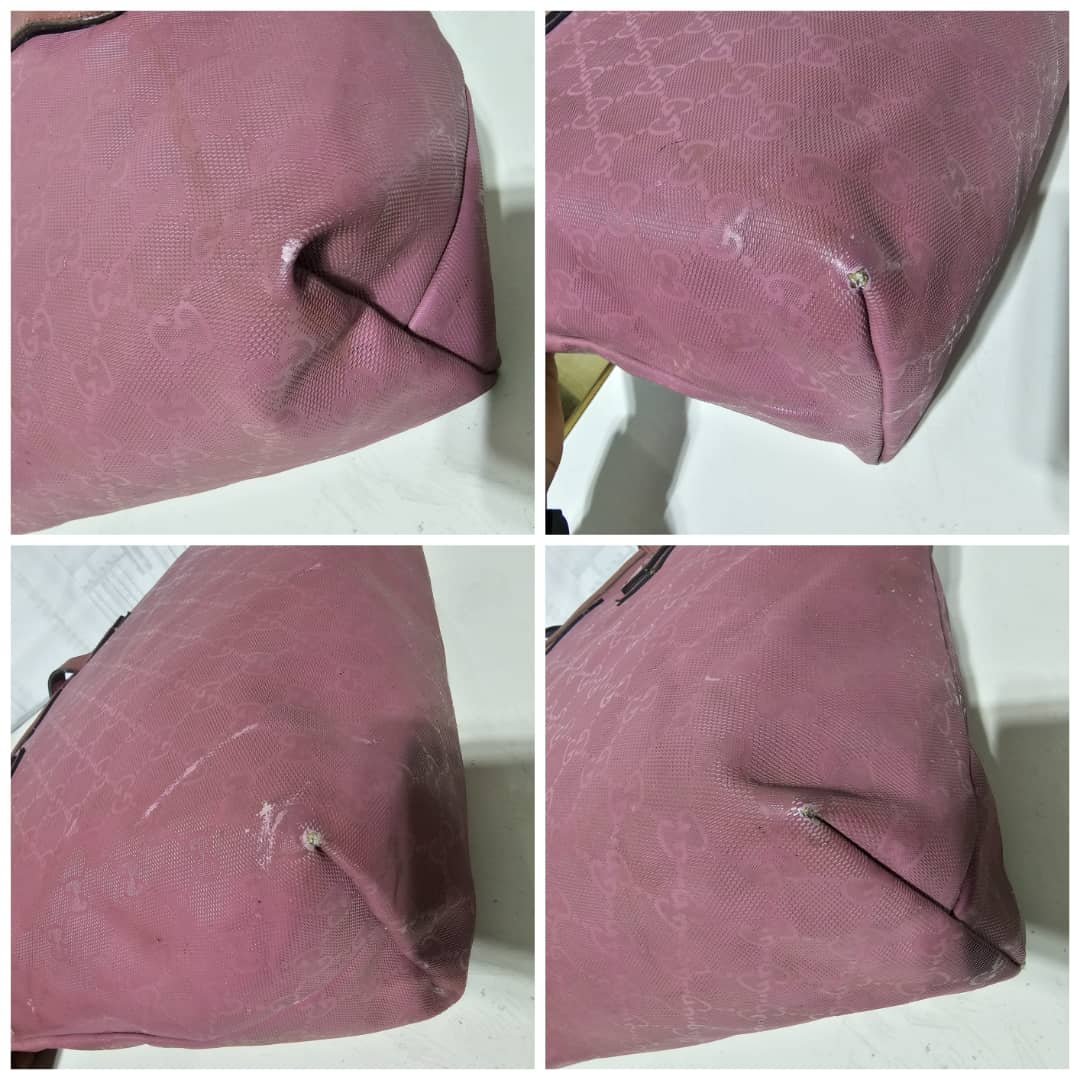 This authentic GUCCI Imprime PVC Leather Shoulder Bag Pink is in it’s good pre-owned condition. The exterior leather is clean,shows sign of wear on it, little scuffing on the base edges. Interior is clean, however shows some water mark stains. The top trim shows scratches and scuffs. Handle shows sign of rubbing wear (Kindly review pictures above).