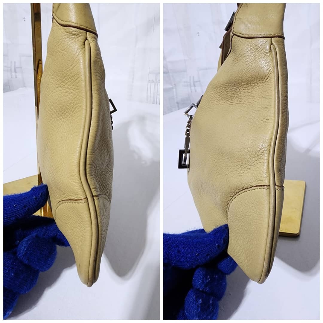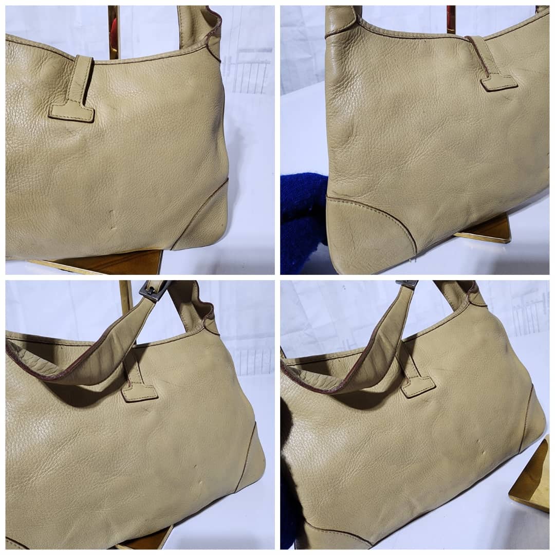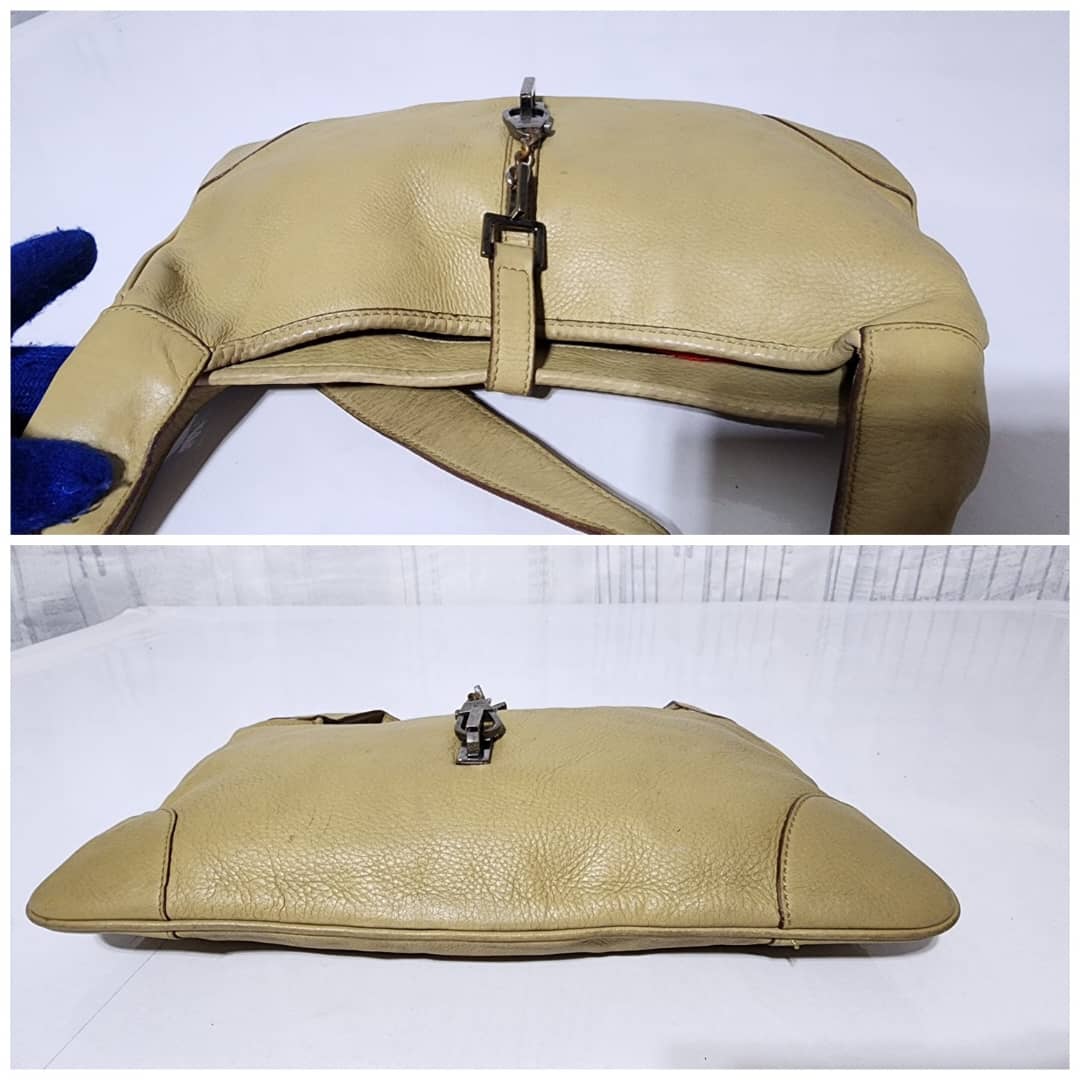 This authentic Gucci Leather Jackie O Hobo Bag Beige is in it’s pre-owned condition. The exterior is clean however, it shows sign of wear to it. The back of the bag shows a little bit of discoloration. Interior is clean. The edges and the top charm of the bag shows some rubbing to (Kindly look at the pictures above).