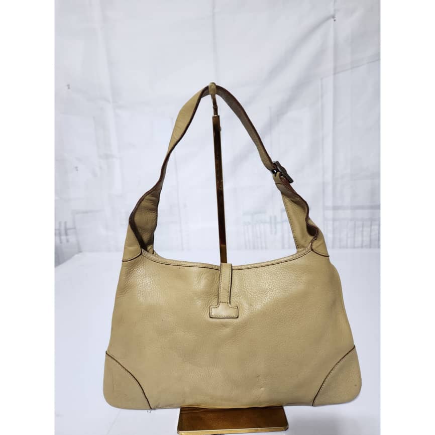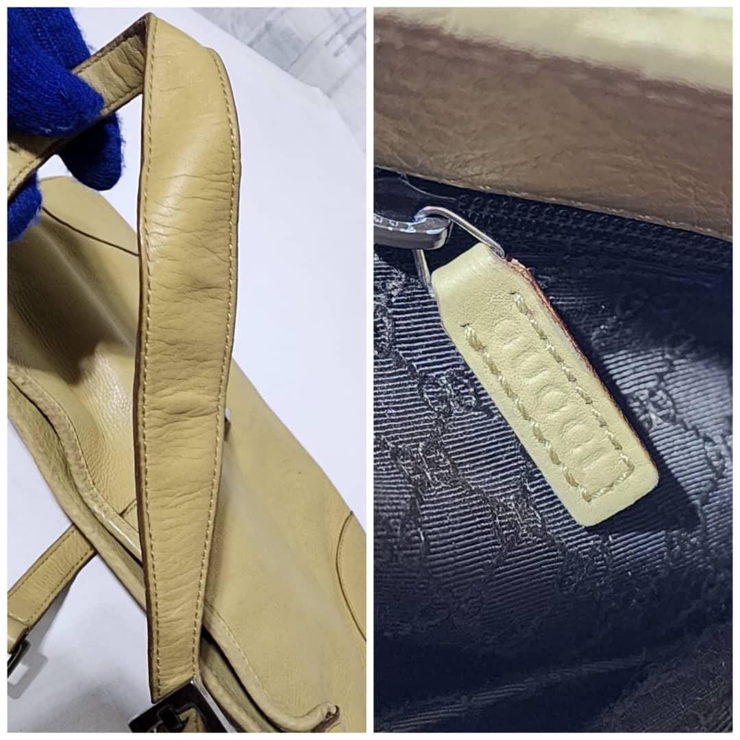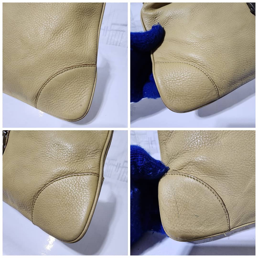 This authentic Gucci Leather Jackie O Hobo Bag Beige is in it’s pre-owned condition. The exterior is clean however, it shows sign of wear to it. The back of the bag shows a little bit of discoloration. Interior is clean. The edges and the top charm of the bag shows some rubbing to (Kindly look at the pictures above).