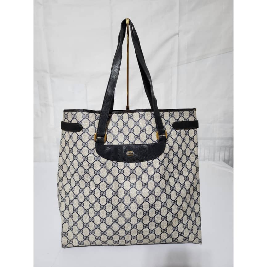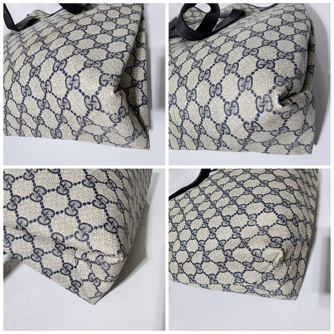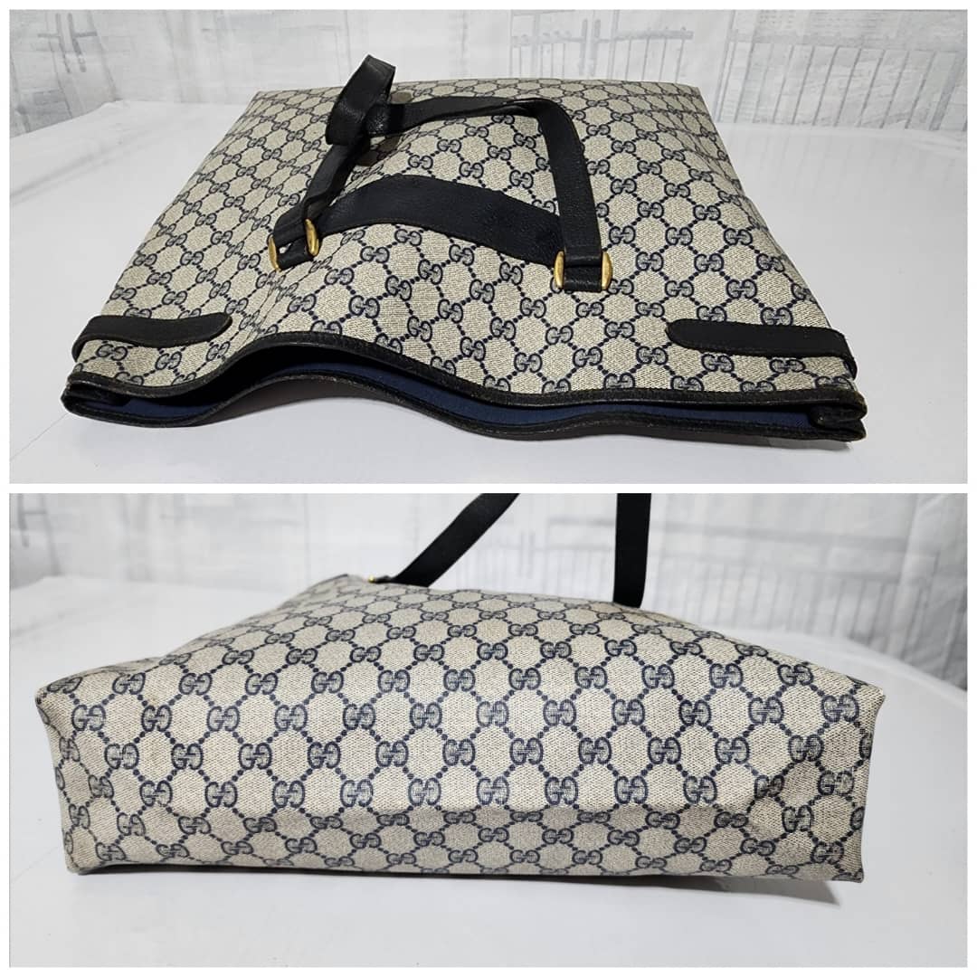 This authentic GUCCI Vintage GG Canvas Tote Bag PVC Leather Navy Blue/Grey is in it’s pre-owned condition. The exterior is clean. Interior is clean. The top trim leather shows some sign of scratches to it. The edges shows some rubbing to it. It is in it’s good vintage condition.