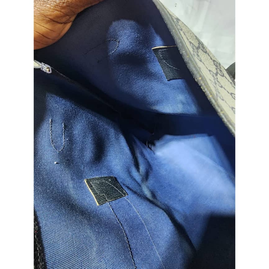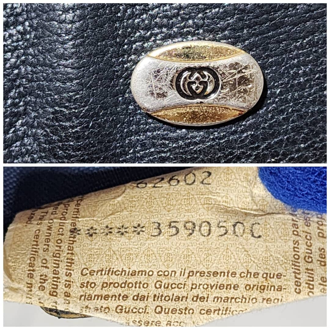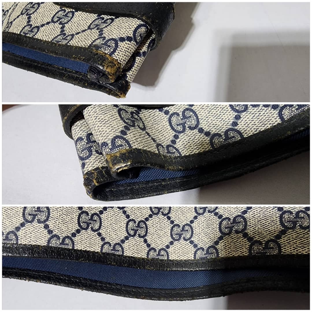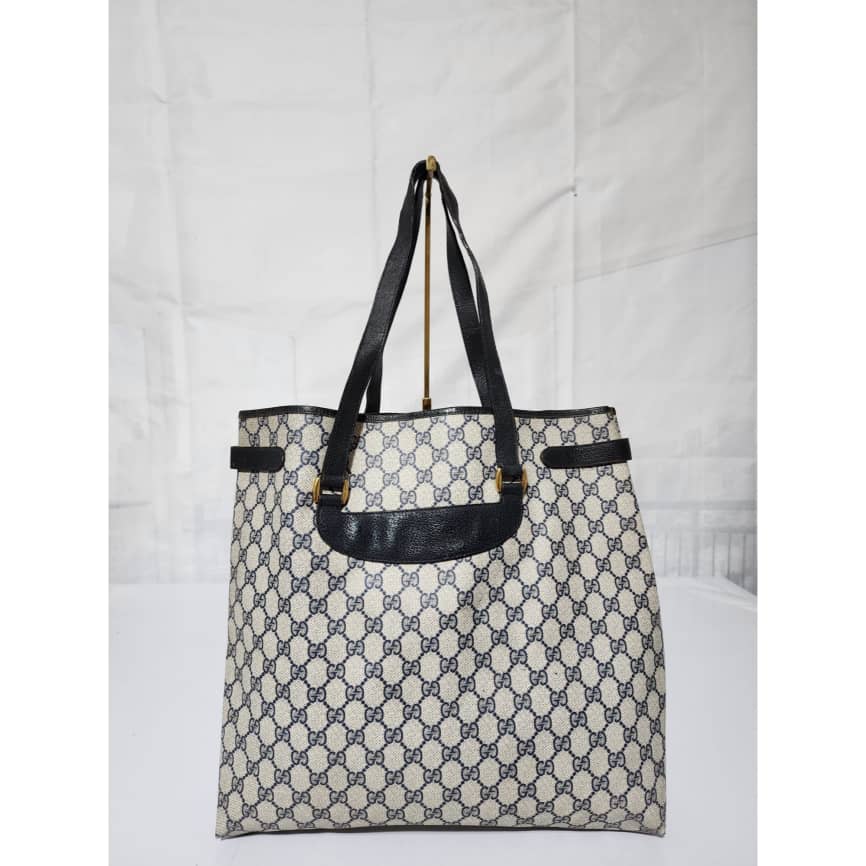 This authentic GUCCI Vintage GG Canvas Tote Bag PVC Leather Navy Blue/Grey is in it’s pre-owned condition. The exterior is clean. Interior is clean. The top trim leather shows some sign of scratches to it. The edges shows some rubbing to it. It is in it’s good vintage condition.