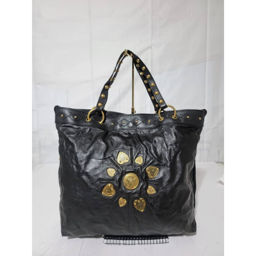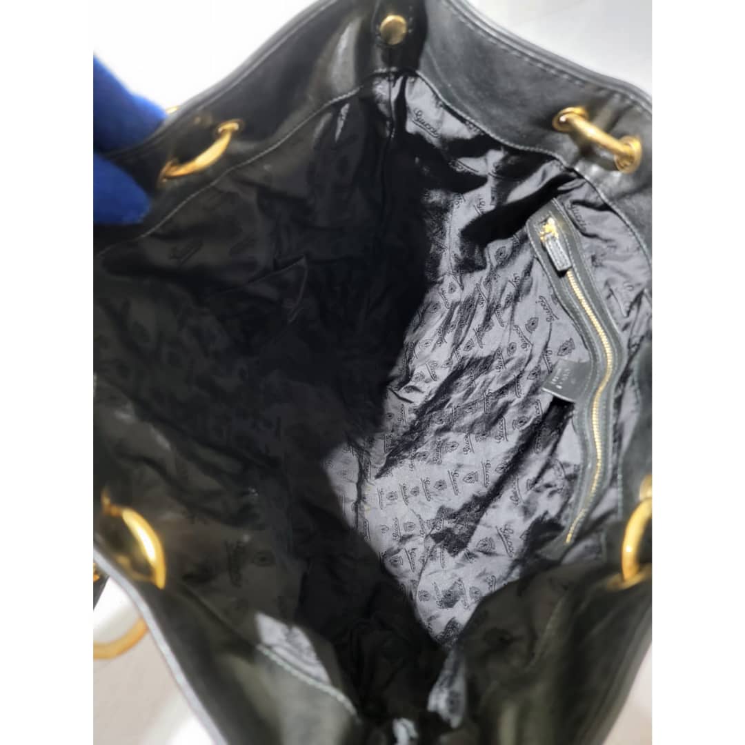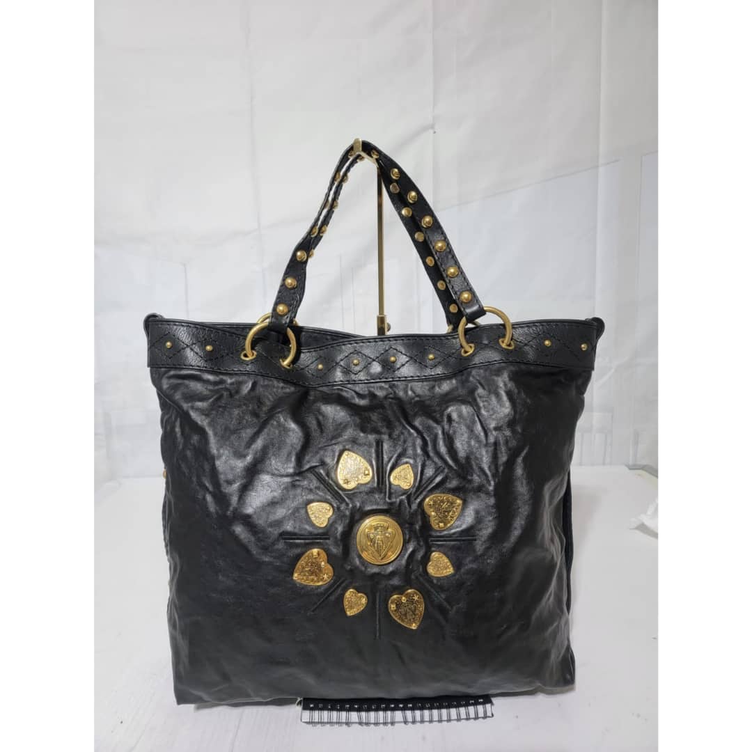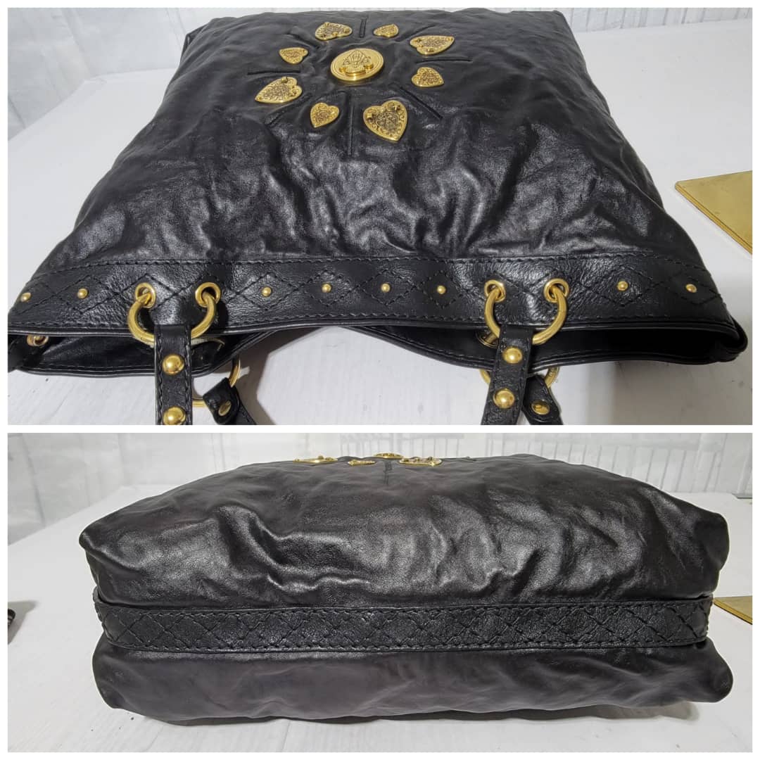 This authentic Gucci Leather Large Irina Tote Bag Black is in it’s good pre-owned condition. The exterior leather is clean and beautiful. Interior is clean. It is black color with beautiful gold charm around the bag.