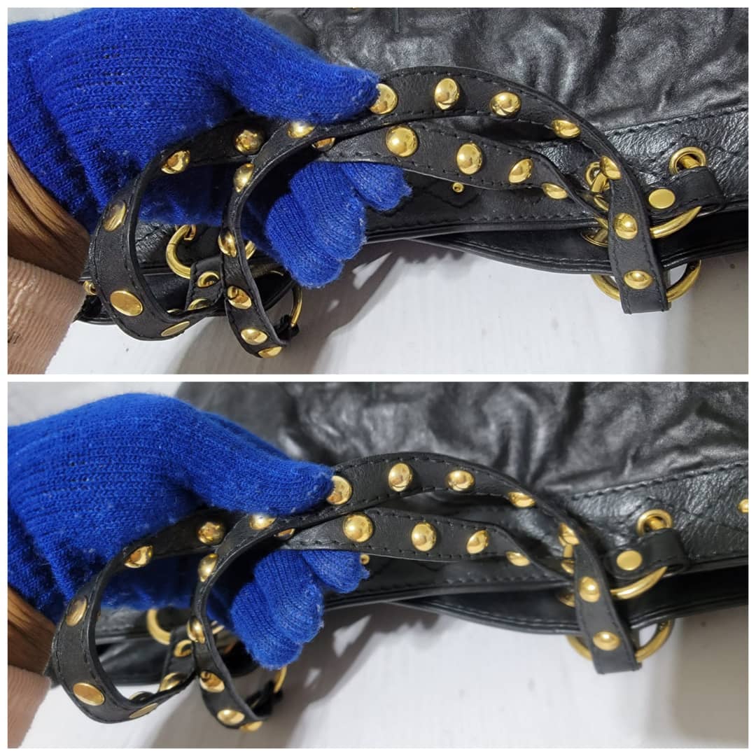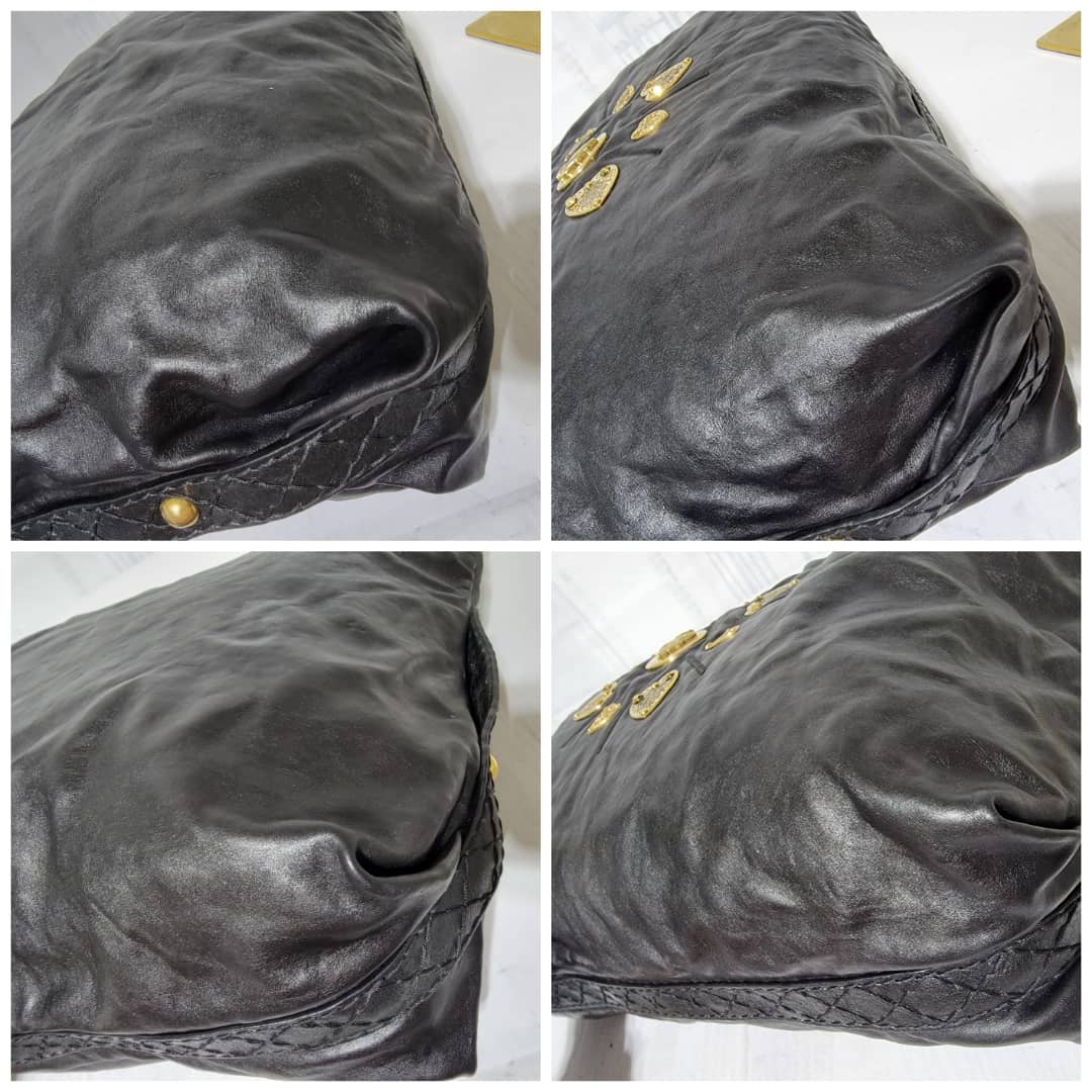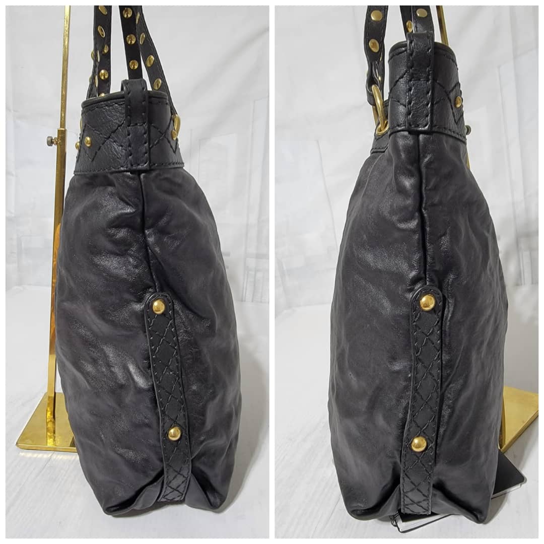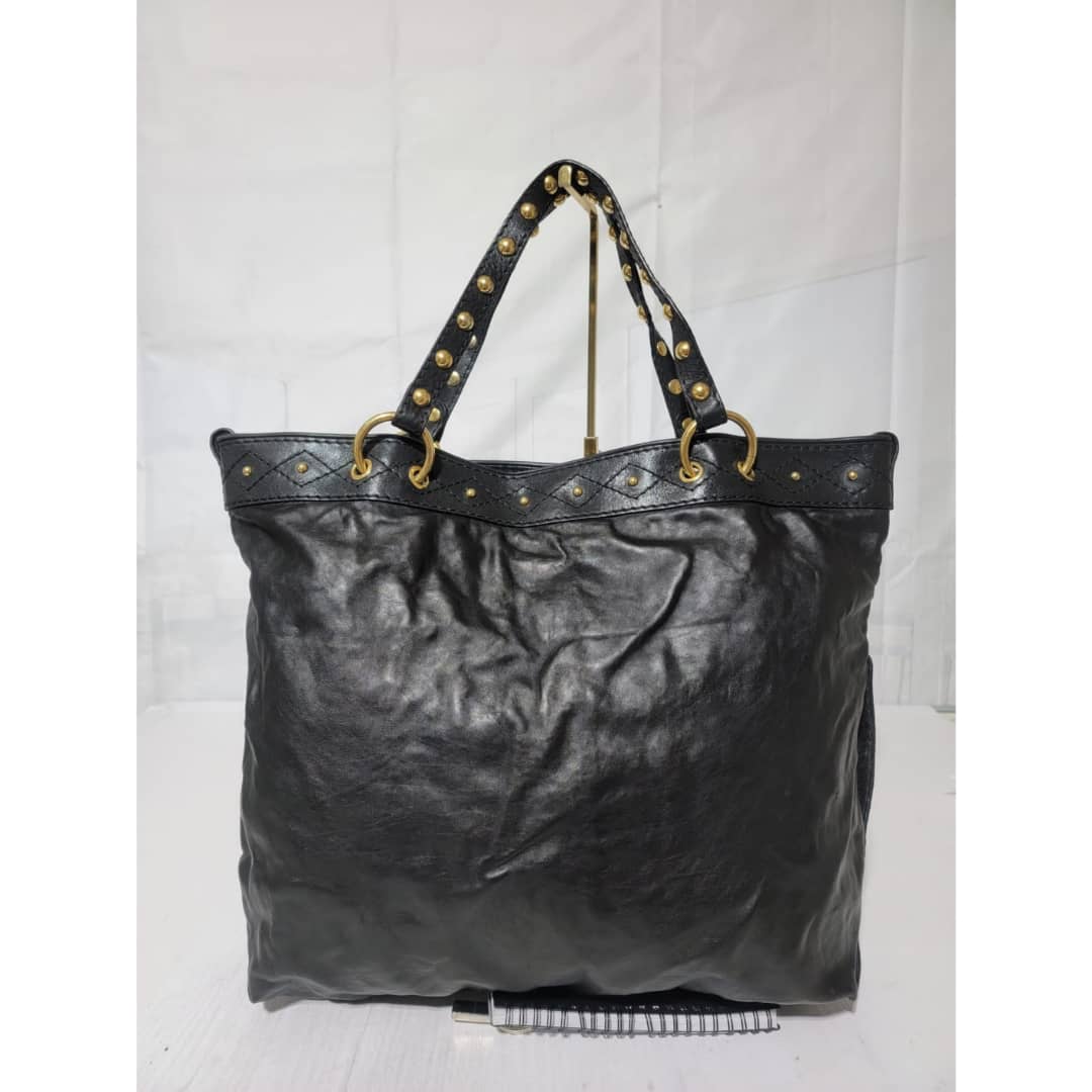 This authentic Gucci Leather Large Irina Tote Bag Black is in it’s good pre-owned condition. The exterior leather is clean and beautiful. Interior is clean. It is black color with beautiful gold charm around the bag.