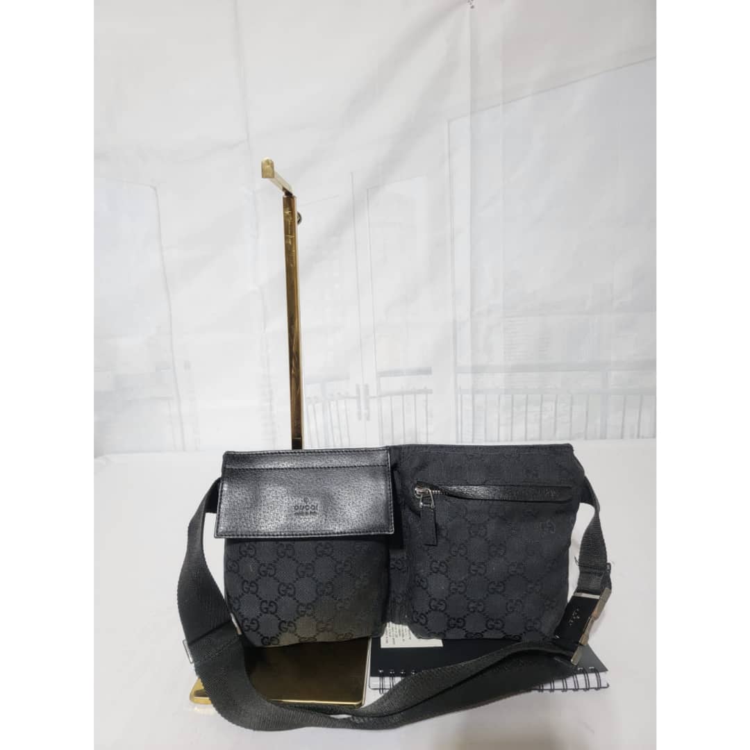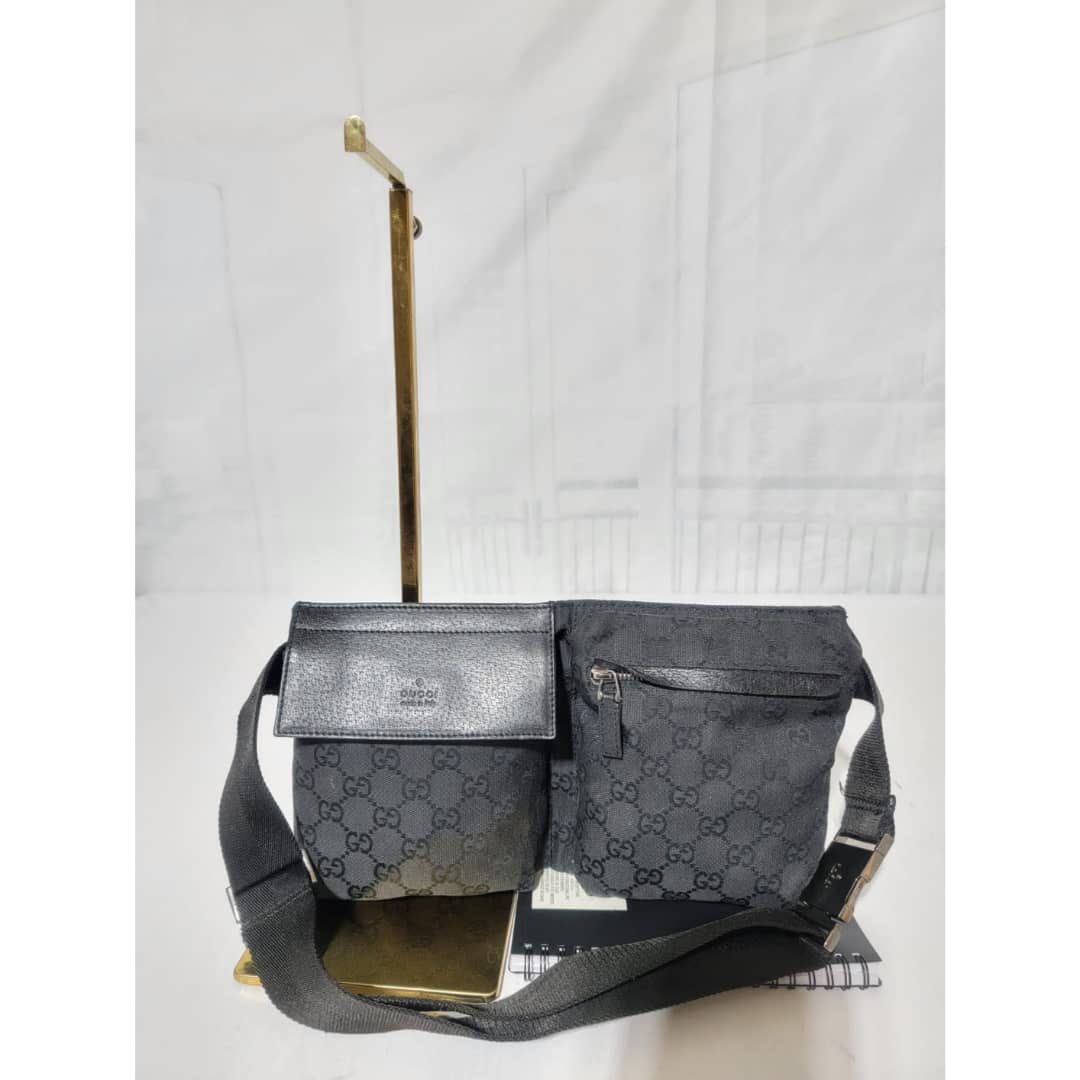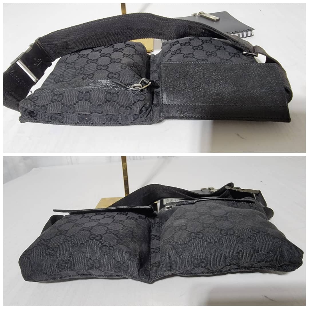 This authentic Gucci Monogram Canvas Double Belt Waist Bag Black is in it’s good pre-owned condition. The exterior is clean and beautiful. Interior is clean. The waist strap is adjustable. Silver hardware.