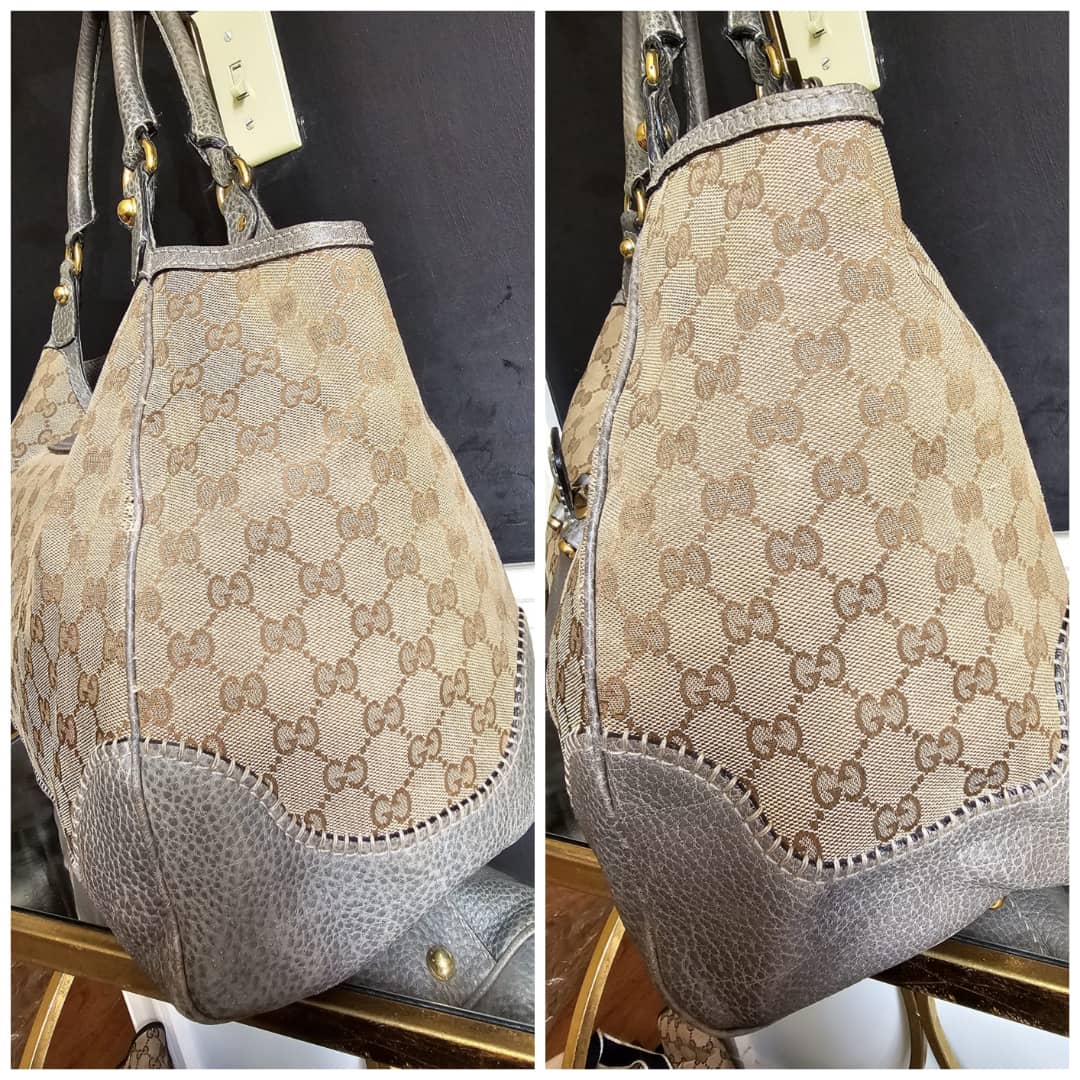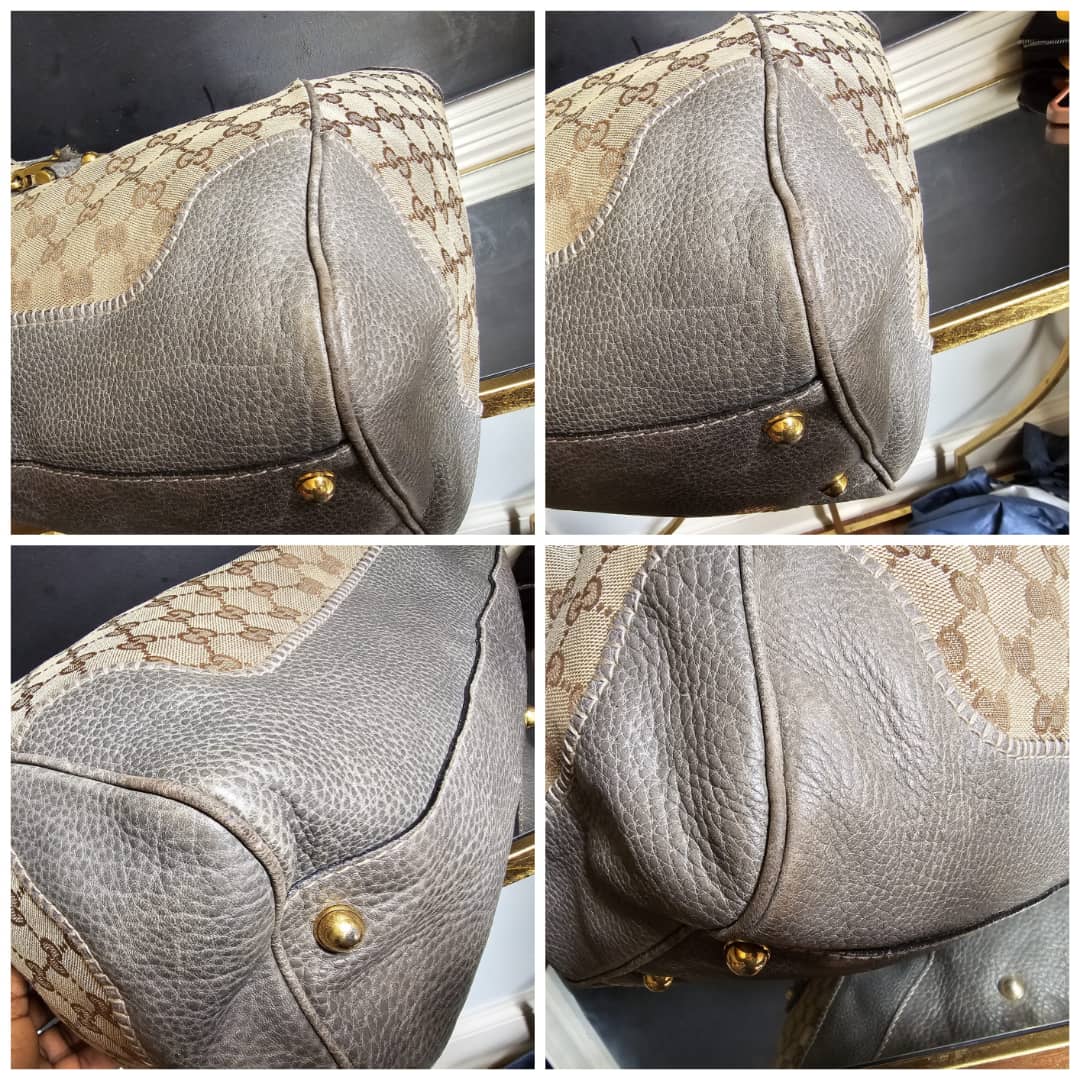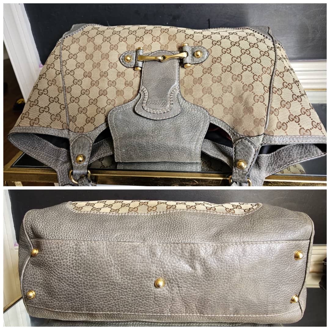 Bag Beige/Grey is in it’s good pre-owned condition. The exterior canvas and grey leather trim is clean and beautiful. Interior is clean. Handle shows little rubbing. Gold hardware.
