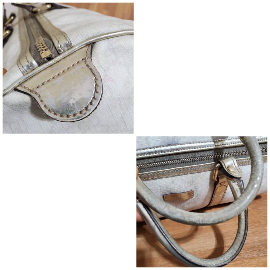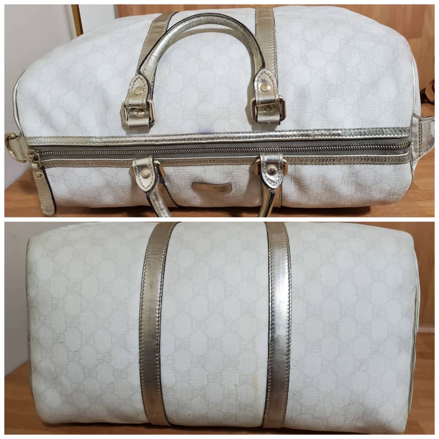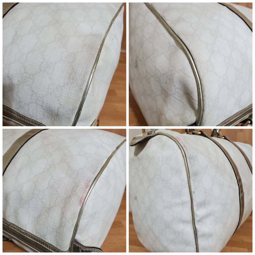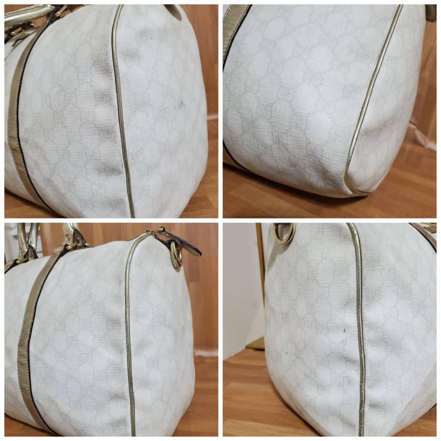 This authentic GUCCI Monogram Large Joy Boston White bag is in it’s pre-owned good condition. Has sign of use. The exterior coated canvas is clean and beautiful. The back corner edges shows little stain. kindly refer to pictures above. The interior is clean. The handles shows wear the color worn out on the handles.