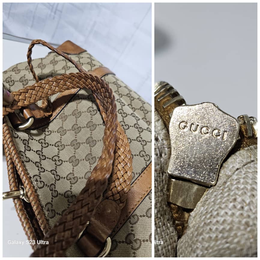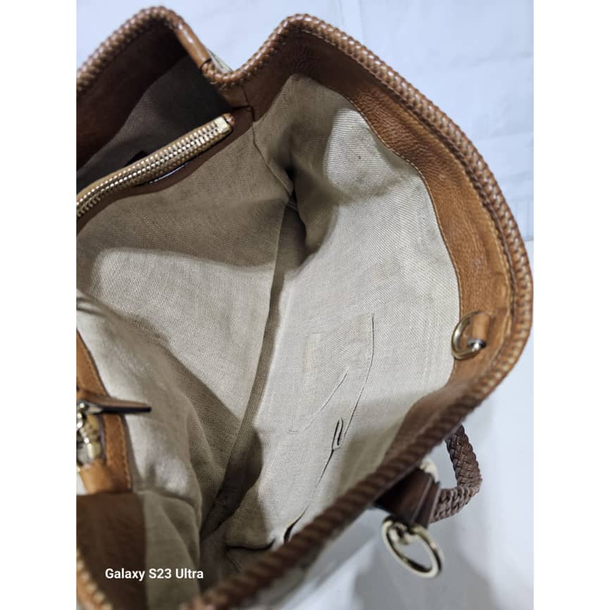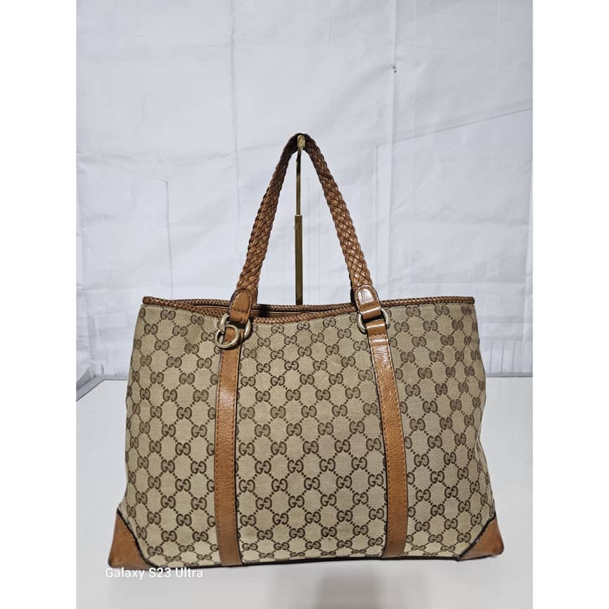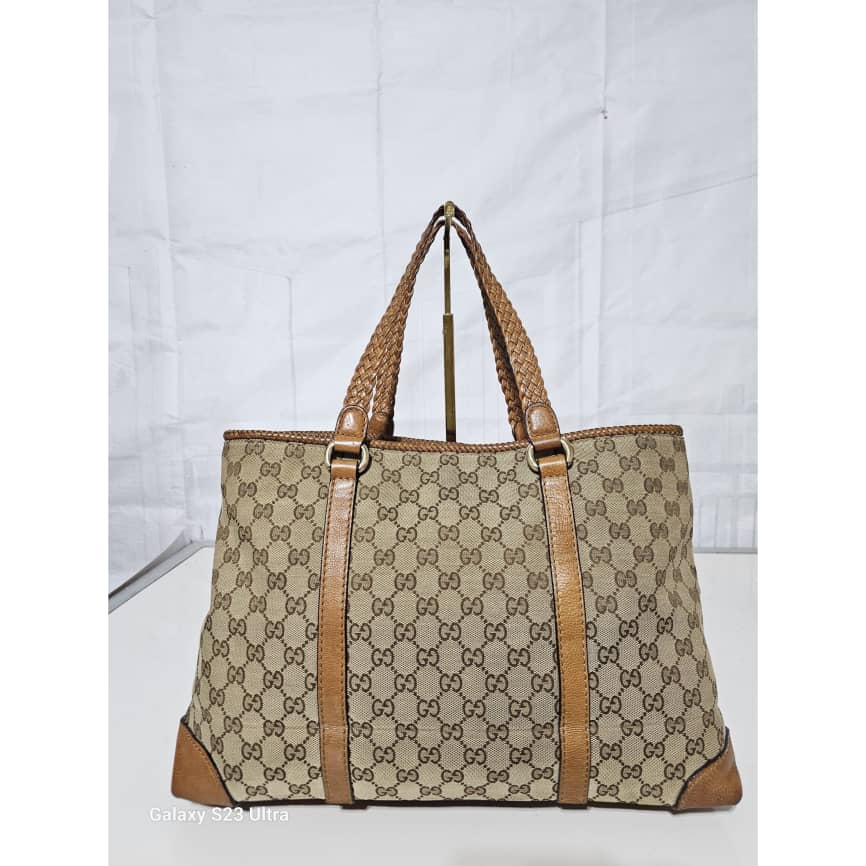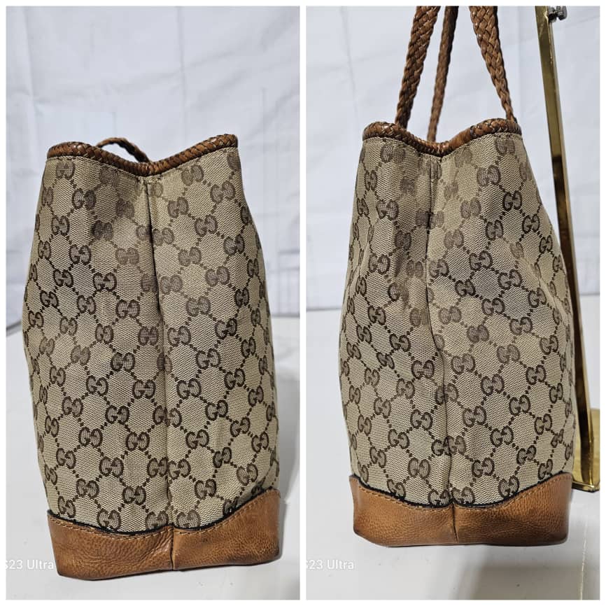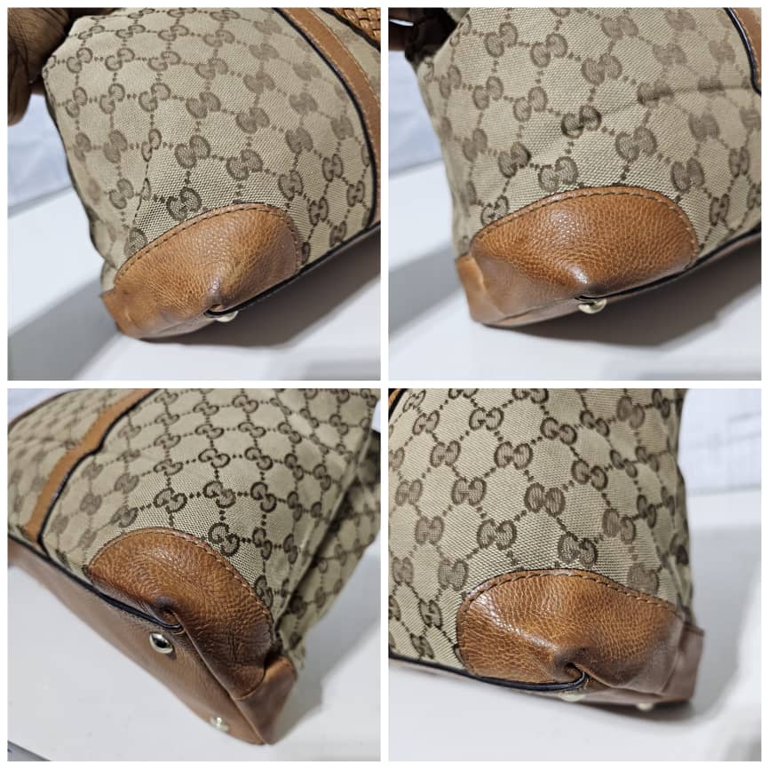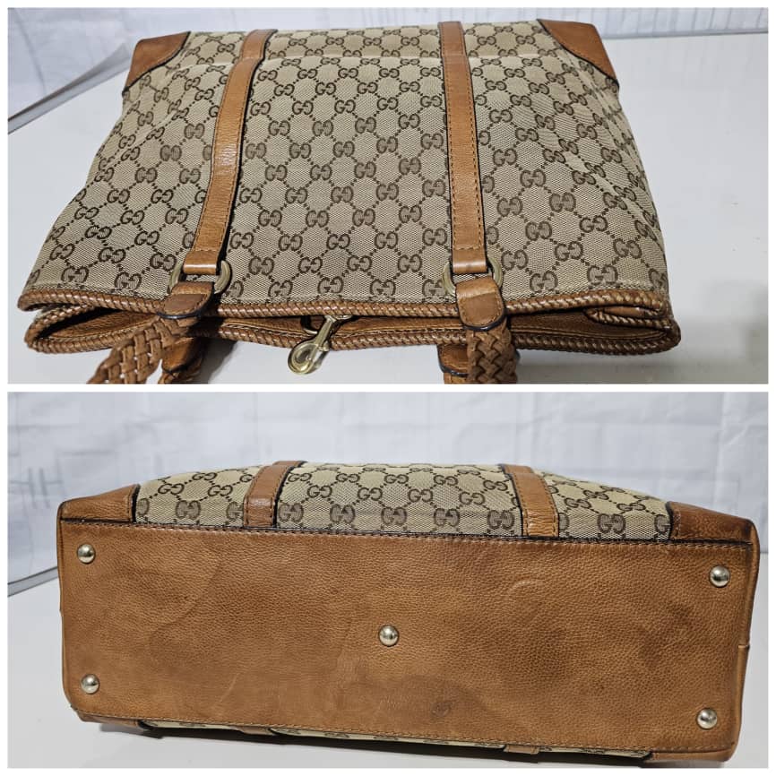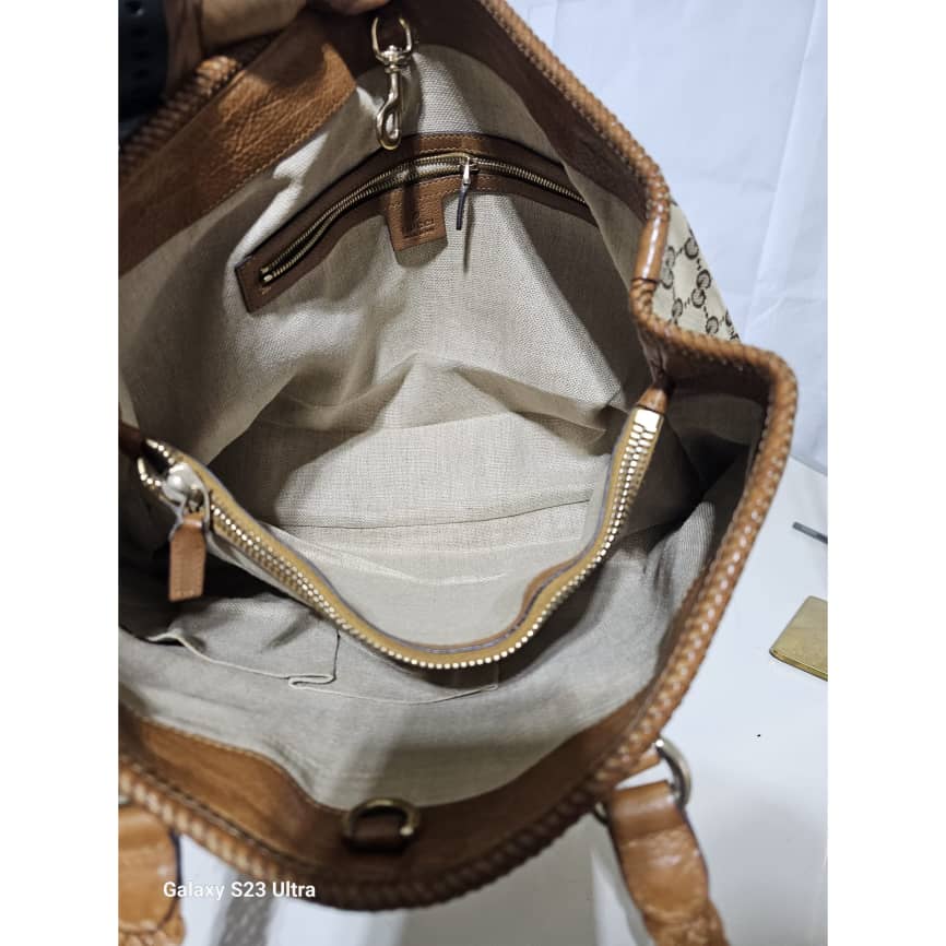 This authentic GUCCI Marrakech Monogram Large Tote Tan With Brown Leather/Canvas is in it’s good pre-owned condition. The exterior canvas is clean and beautiful with little rubbing at the base edges. The interior is clean. No Tassel