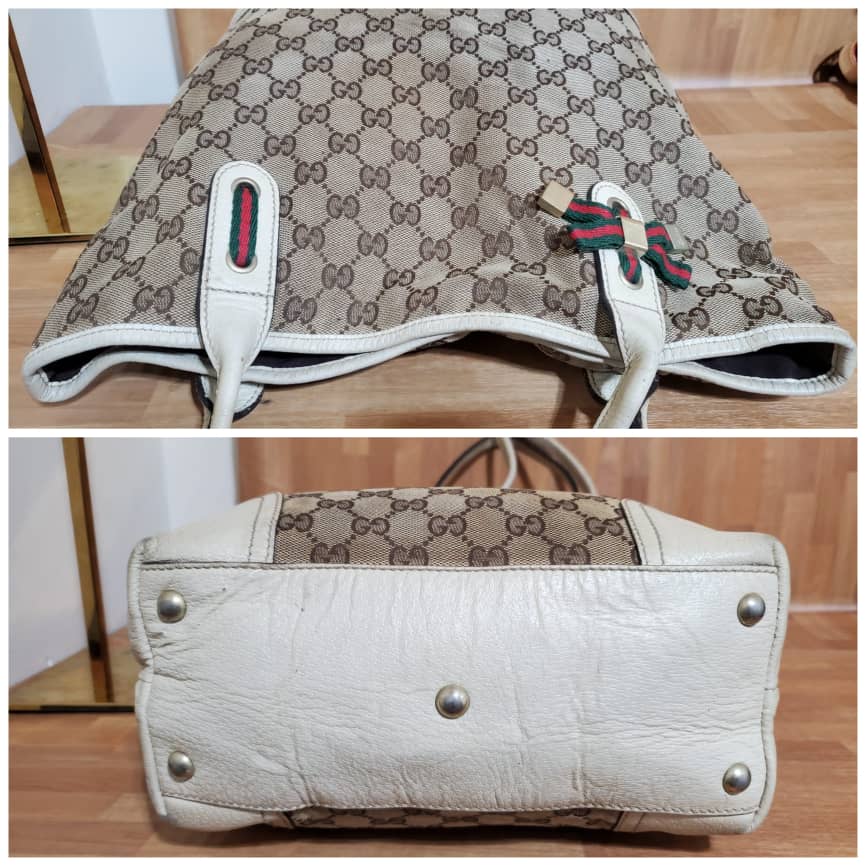 This authentic GUCCI Monogram Medium Princy Tote Off White is in it’s pre-owned condition. The exterior canvas is clean and beautiful. Interior is clean. Light scratches on the base edges, top leather trim and handles.