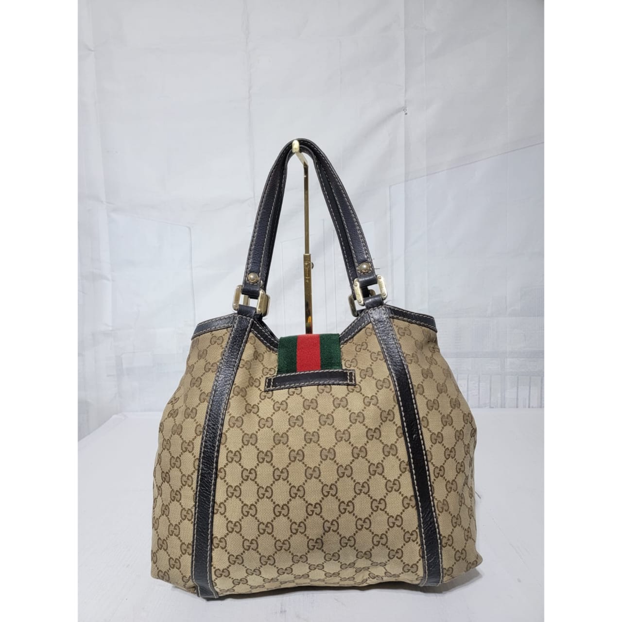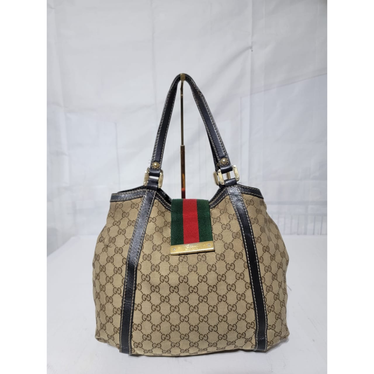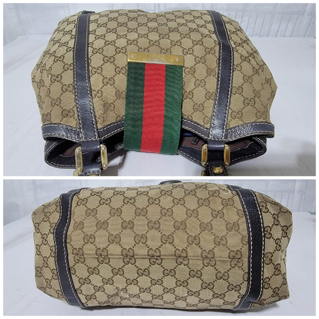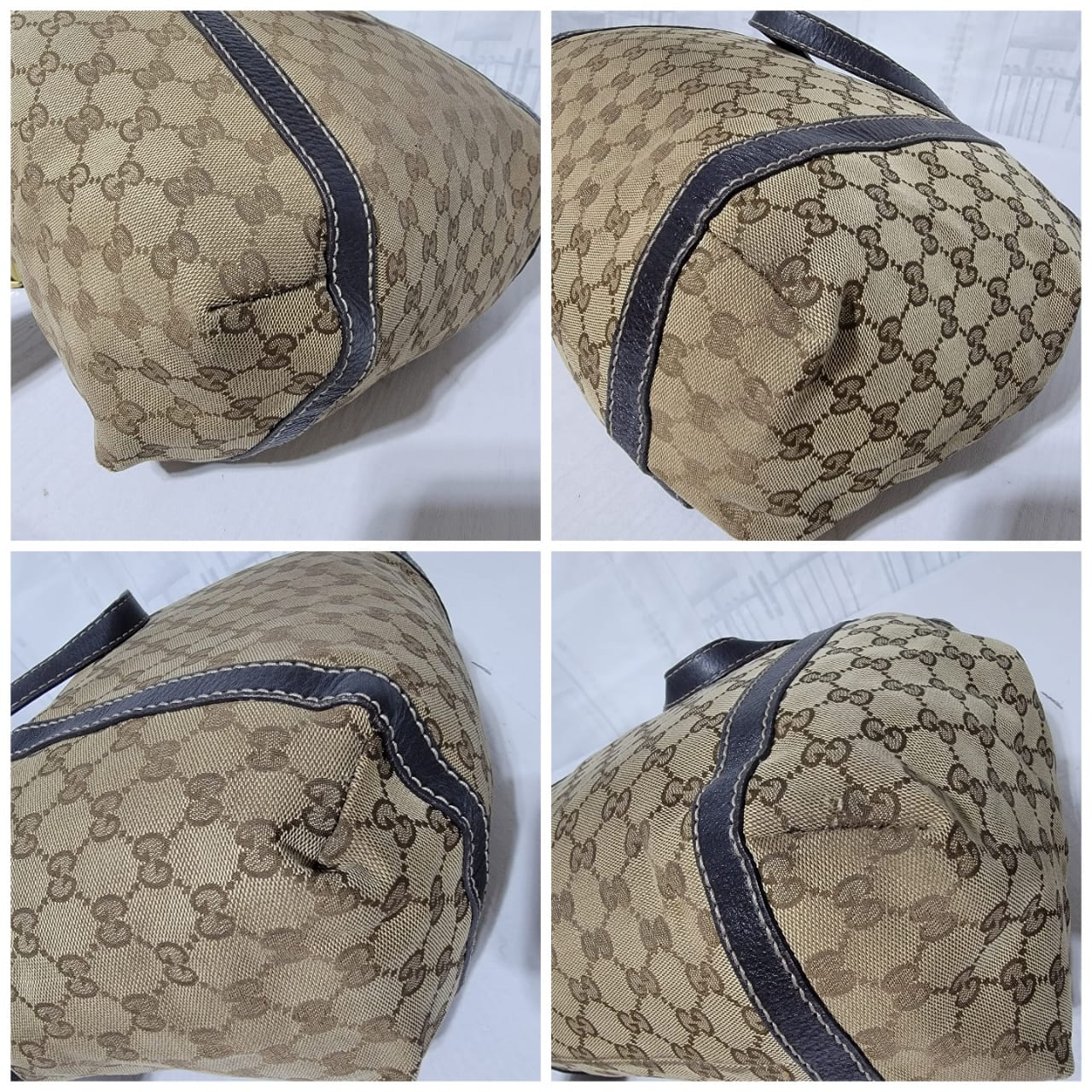 This authentic GUCCI Monogram New Ladies Web Tote Bag Beige/Dark Brown is in it’s good pre-owned condition. The exterior is clean. Interior is clean. The exterior by the side has a very tiny thread pull (Kindly review pictures above, pictures will be included). Brown trim leather runs across the bag. Gold hardware shows sign of rubbing to it.