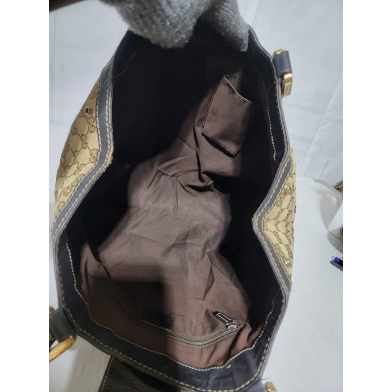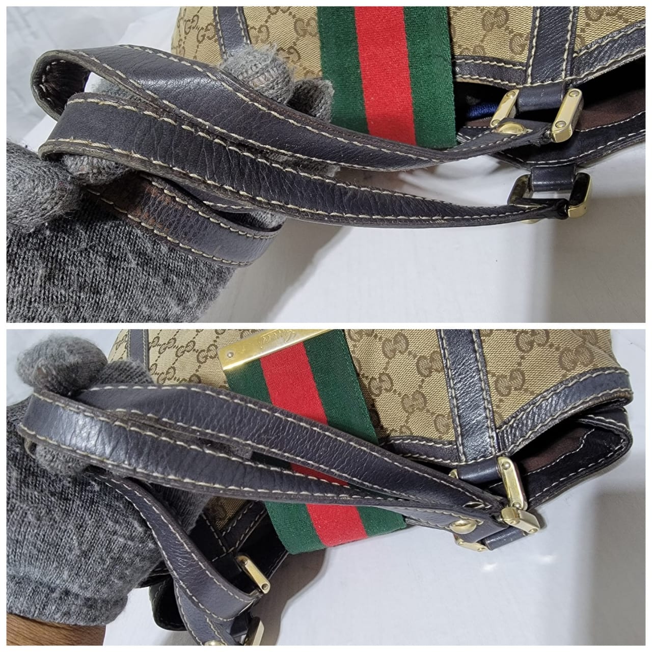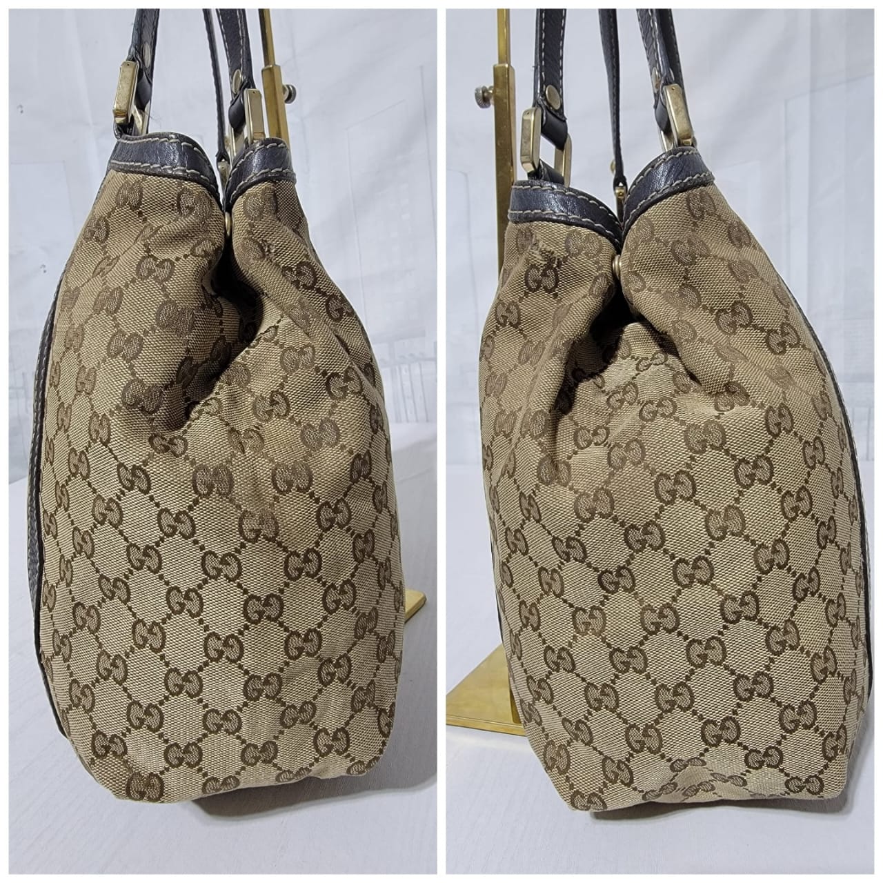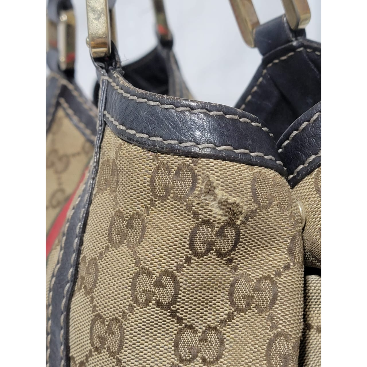 This authentic GUCCI Monogram New Ladies Web Tote Bag Beige/Dark Brown is in it’s good pre-owned condition. The exterior is clean. Interior is clean. The exterior by the side has a very tiny thread pull (Kindly review pictures above, pictures will be included). Brown trim leather runs across the bag. Gold hardware shows sign of rubbing to it.