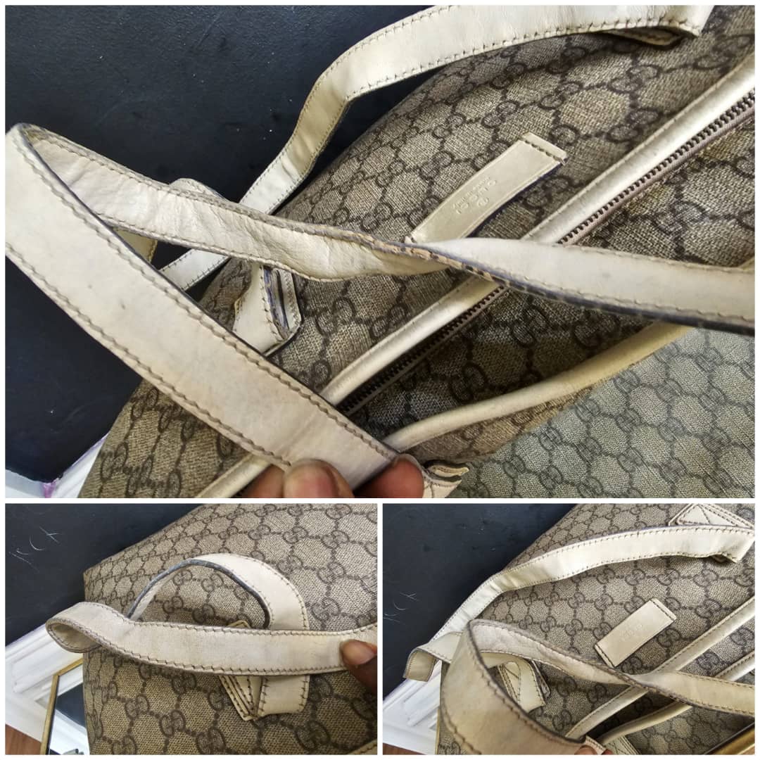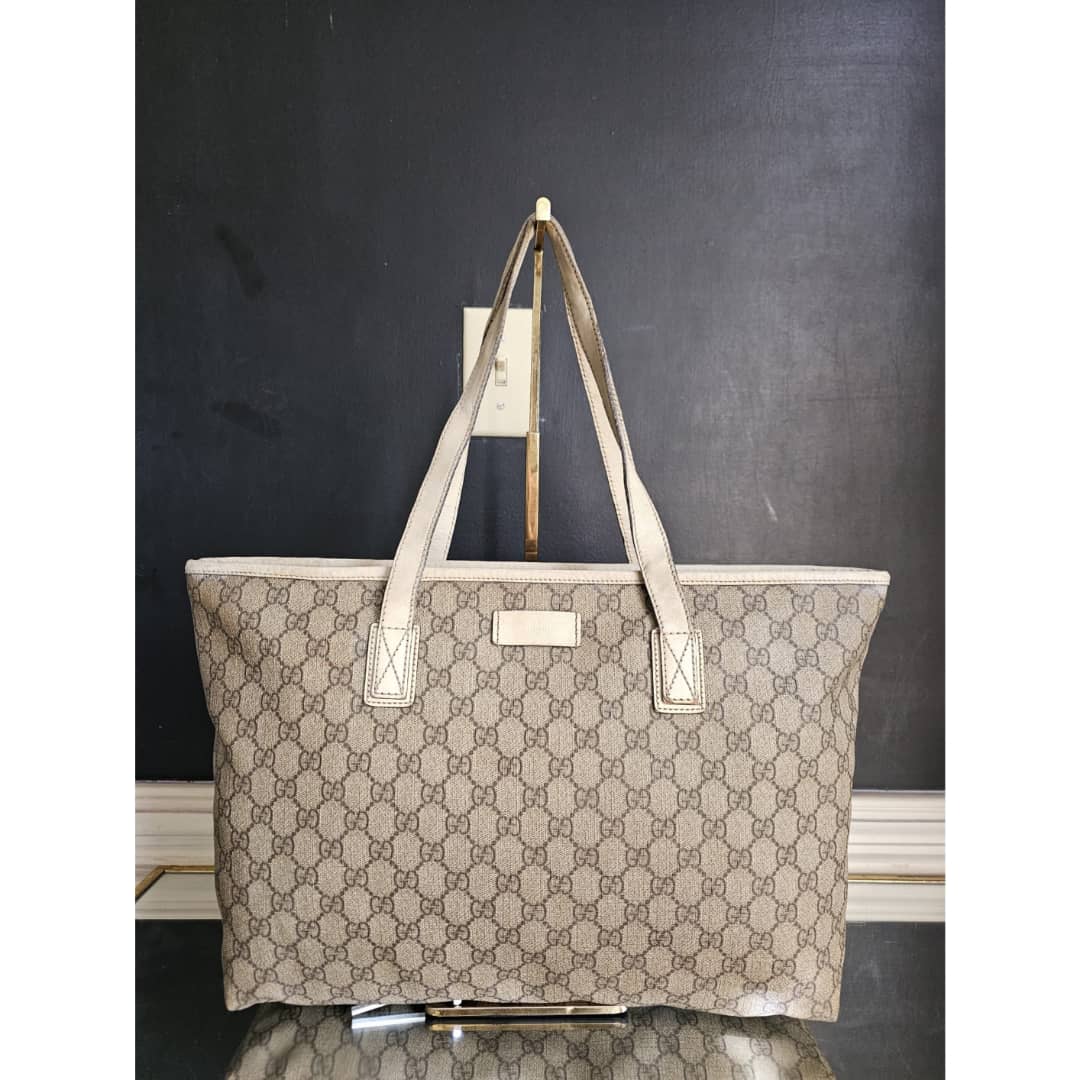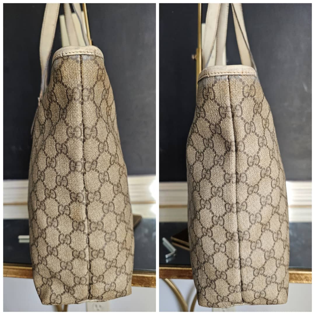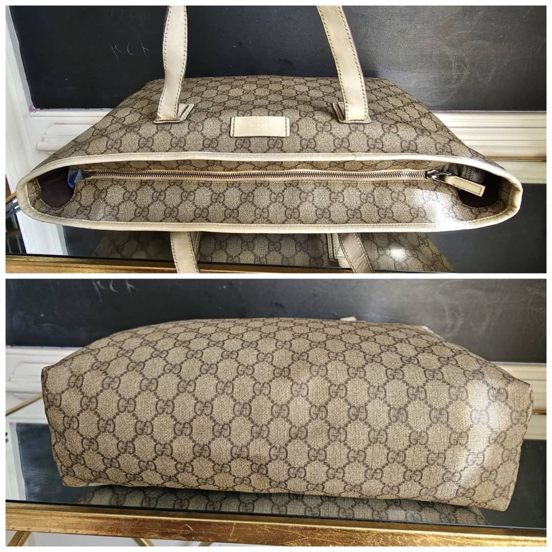 This authentic Gucci Monogram Tote Bag Beige/Cream is in it’s good pre-owned condition. The exterior canvas is clean and beautiful, base edges shows little bit of scratches. Interior is clean. Handles shows some wear and blazing. The top leather trim shows it was re-painted formerly (Kindly review pictures above).