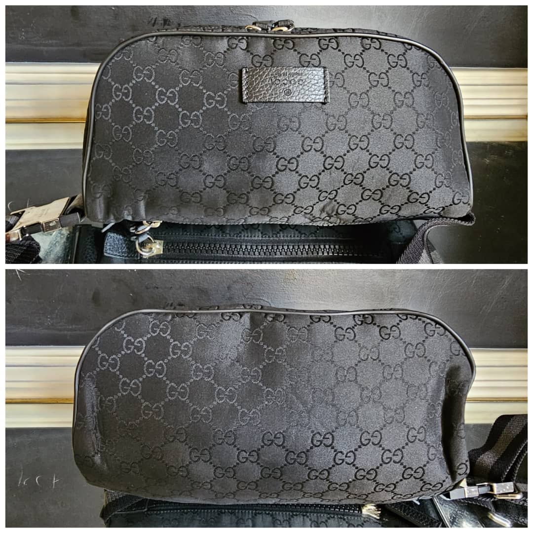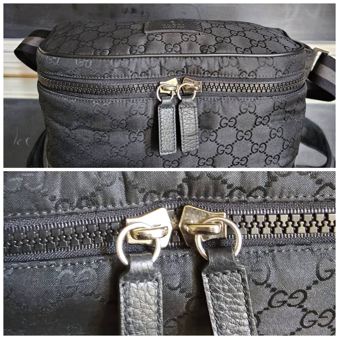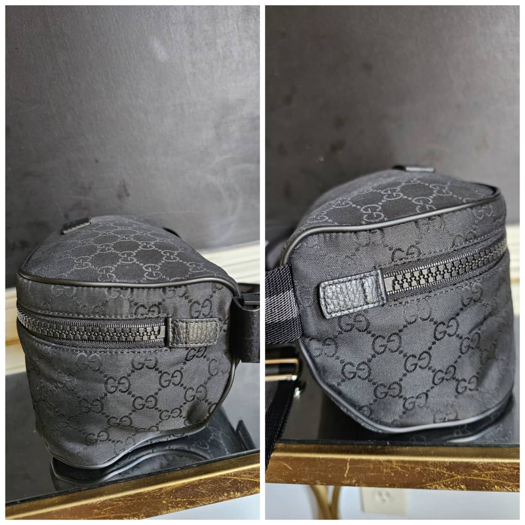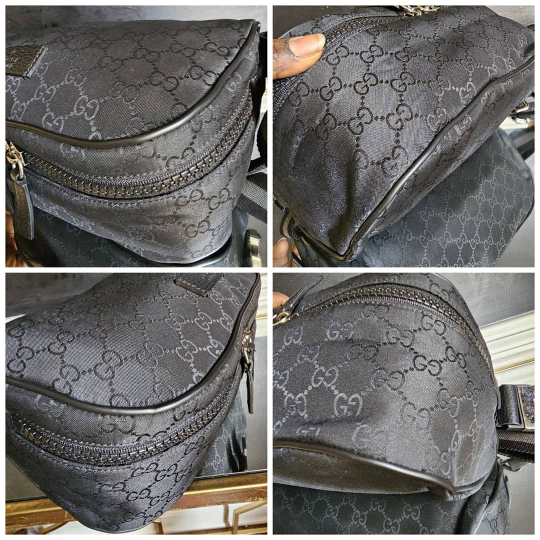This authentic GUCCI Nylon Monogram Fanny Pack Belt Bag Black is in it’s good pre-owned condition. The exterior is clean and beautiful. Interior is clean. Silver hardware shows some scratches. Can be worn as a waist and shoulder bag. Absolute great condition