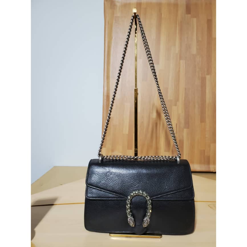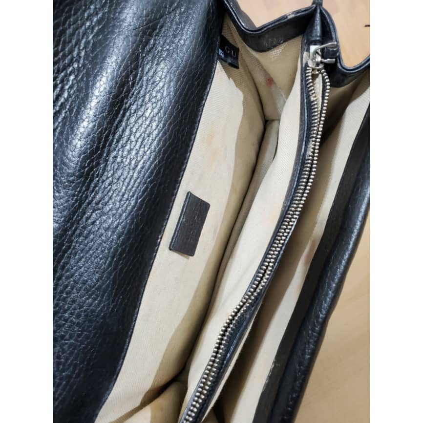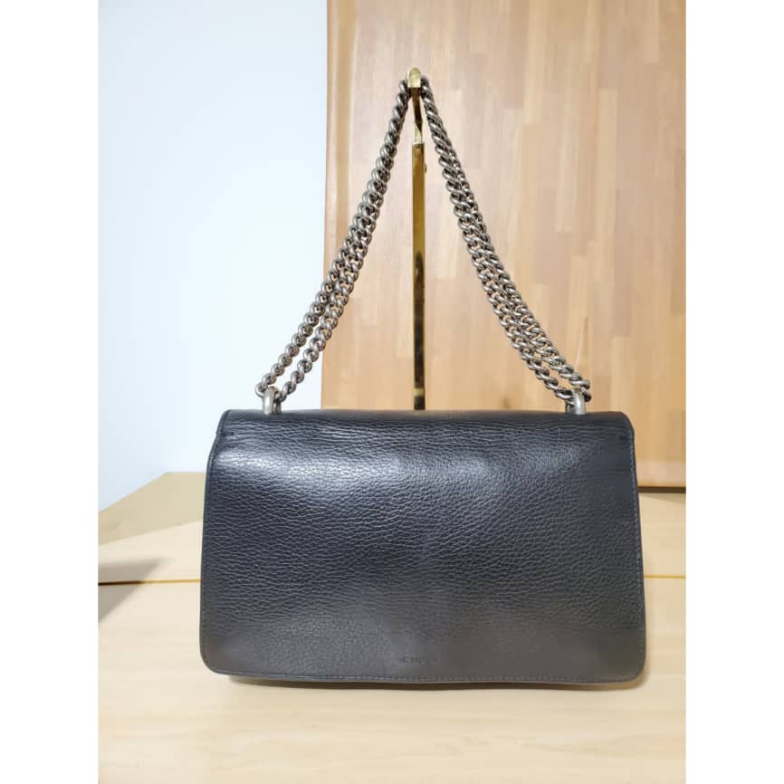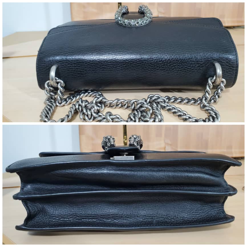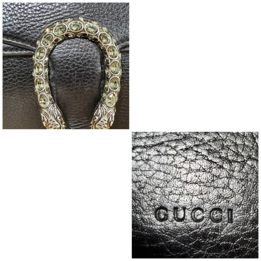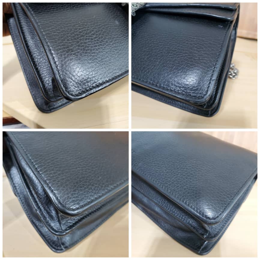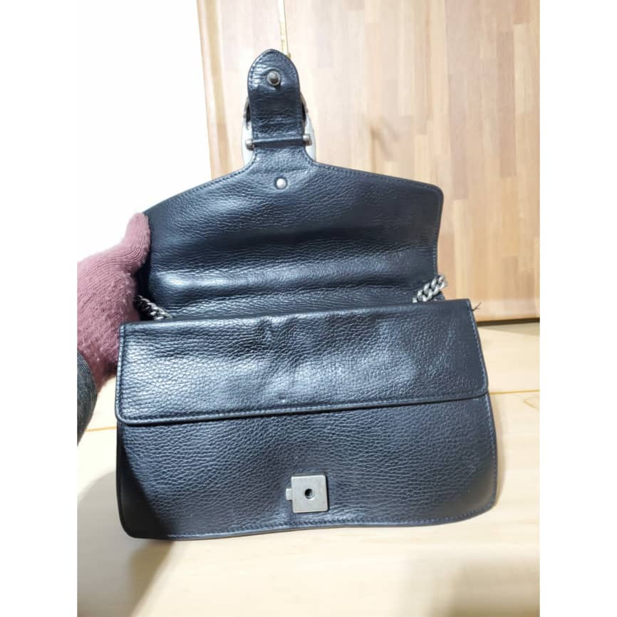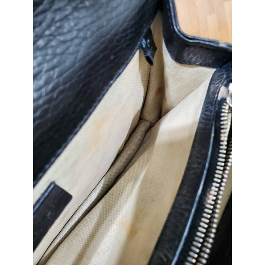 This authentic Gucci Pebbled Calfskin Small Dionysus Shoulder Bag Black is in it’s pre-owned condition. The exterior leather is clean and beautiful . The interior lining is clean but some slightly faded color transfer on the lining. Kindly look at pictures.
