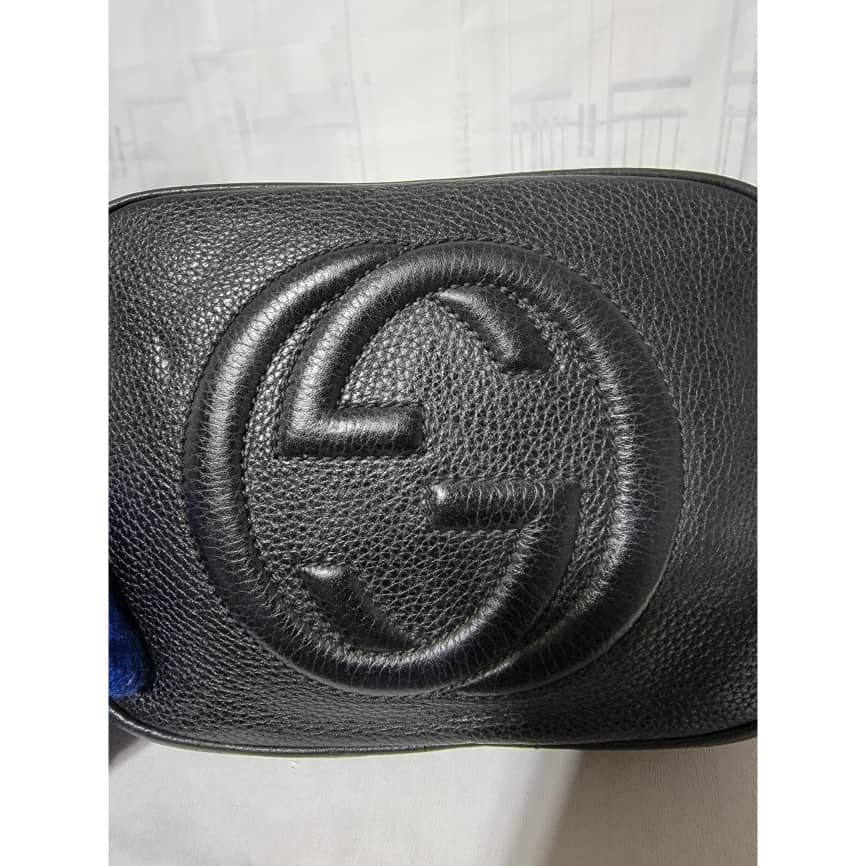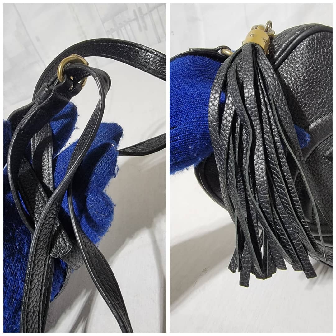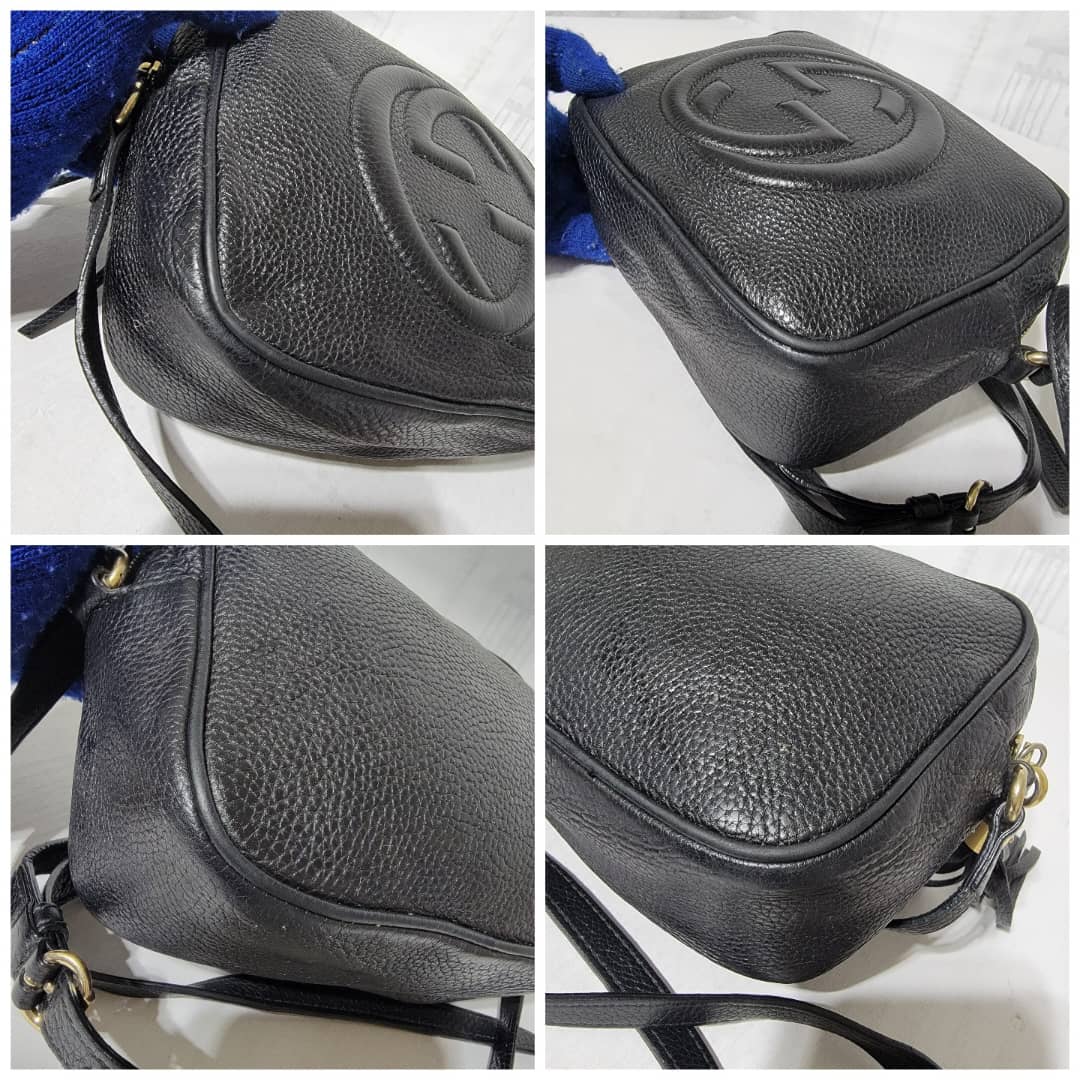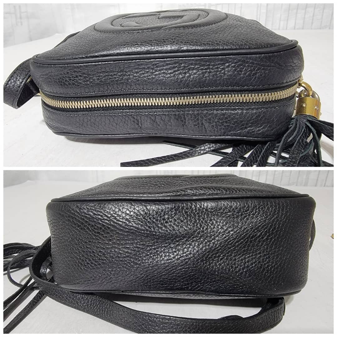 Pebbled Calfskin Small Soho Disco Bag Black is in it’s good pre-owned condition the exterior Pebbled Leather is clean and beautiful. Interior is clean. Tiny little pen mark not obvious.