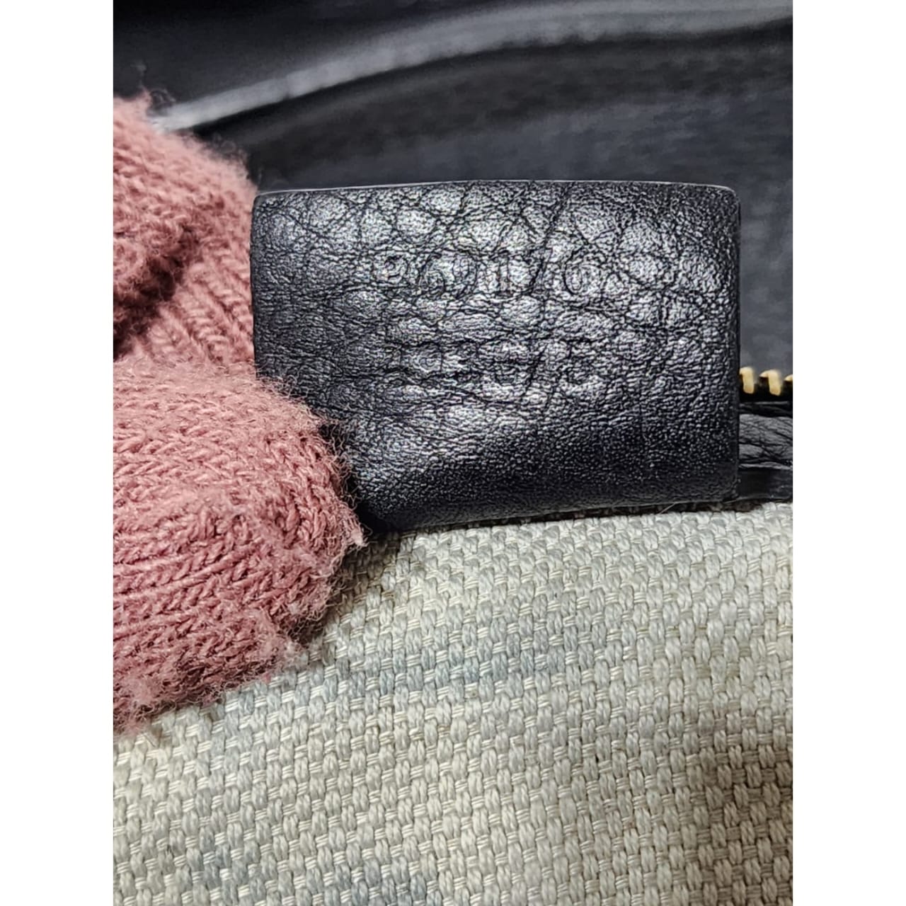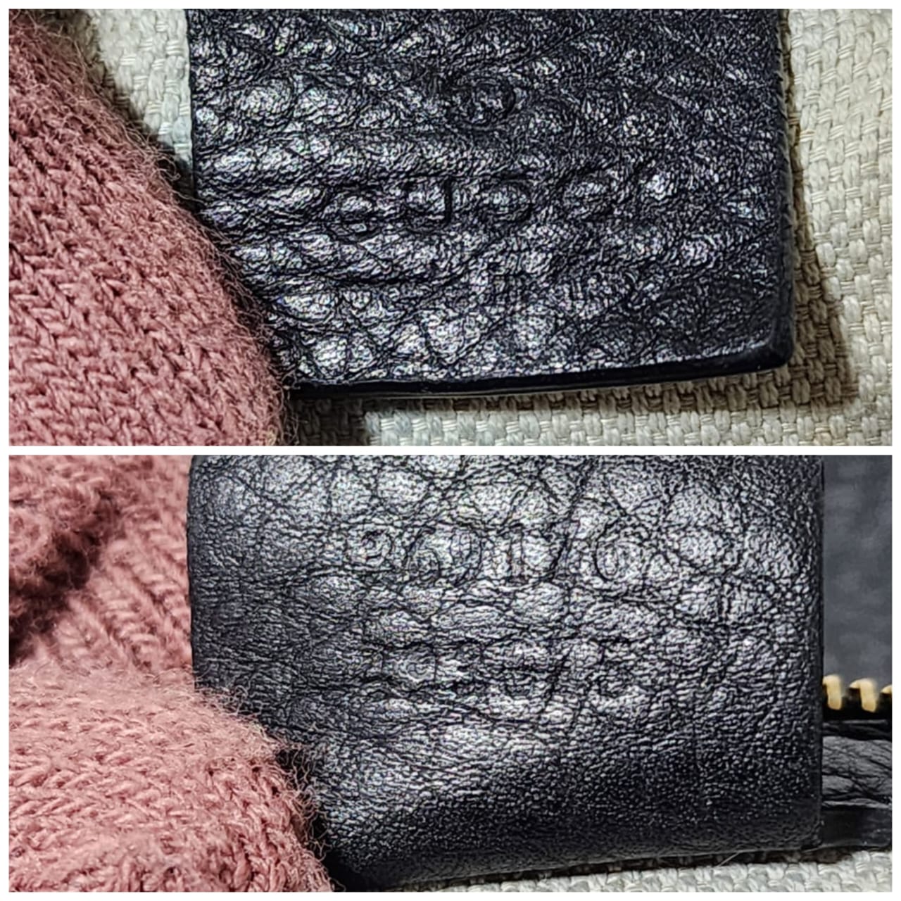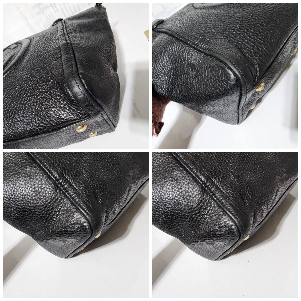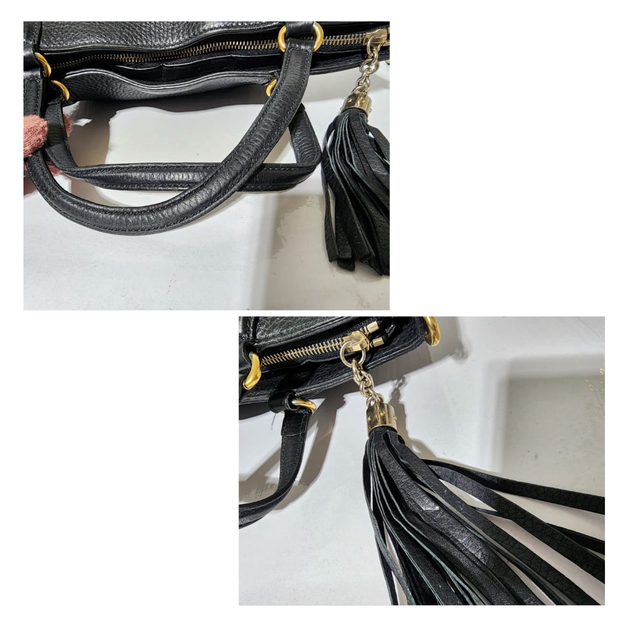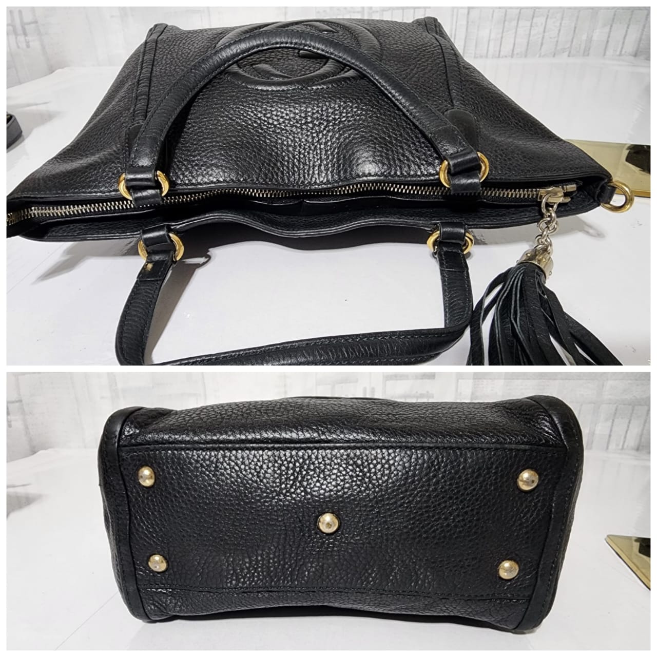 This authentic GUCCI Pebbled Calfskin Small Soho Top Handle Bag Black is in it’s pre-owned condition. The exterior leather is clean. The interior has sign of wear (Kindly look at pictures above), a small bag organizer will be included inside. The strap is missing, a generic strap will be included. There are scratches on the hardware. There is a little cut beside the teeth of the zip however, it works fine ( Kindly note it’s in the pictures).
