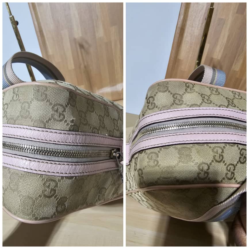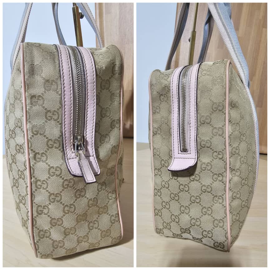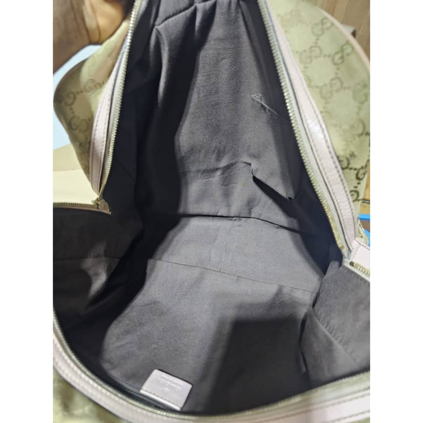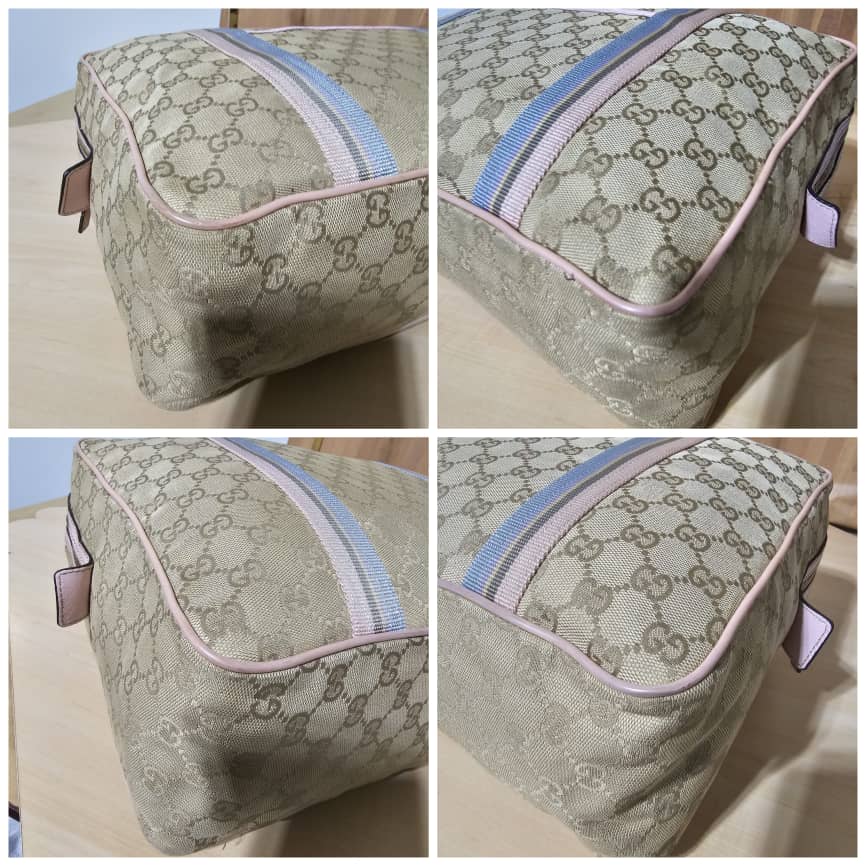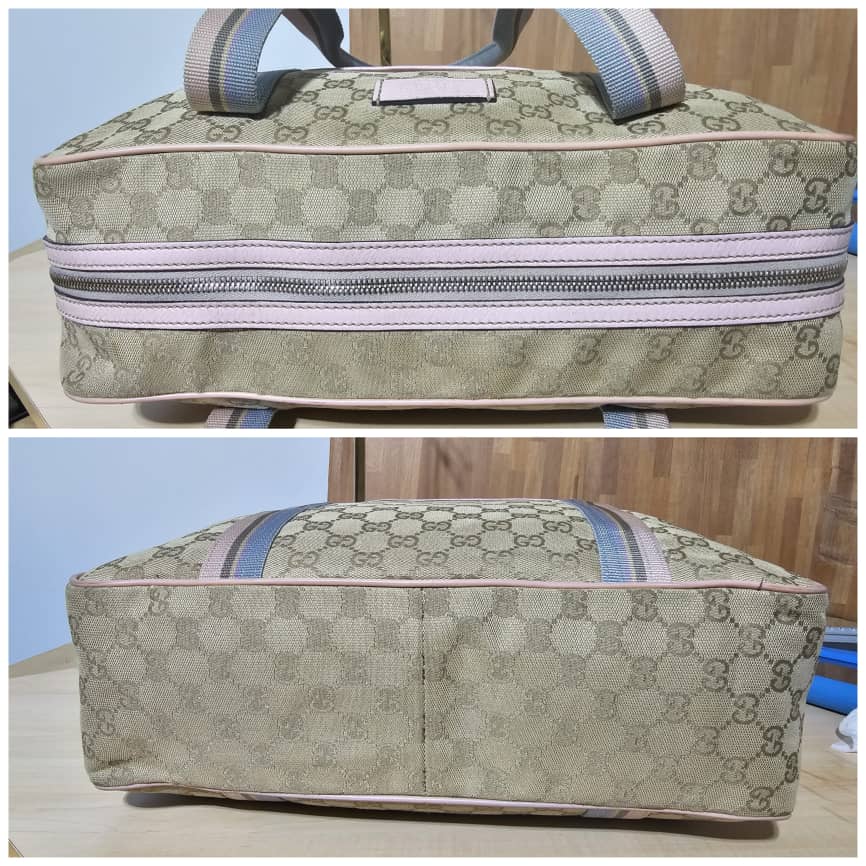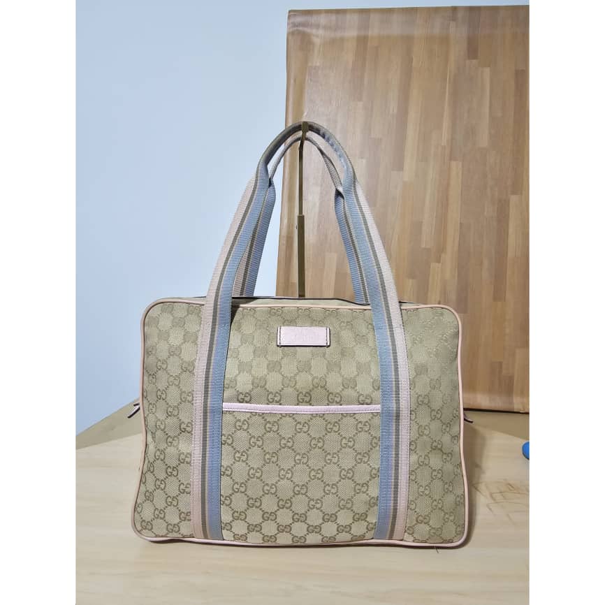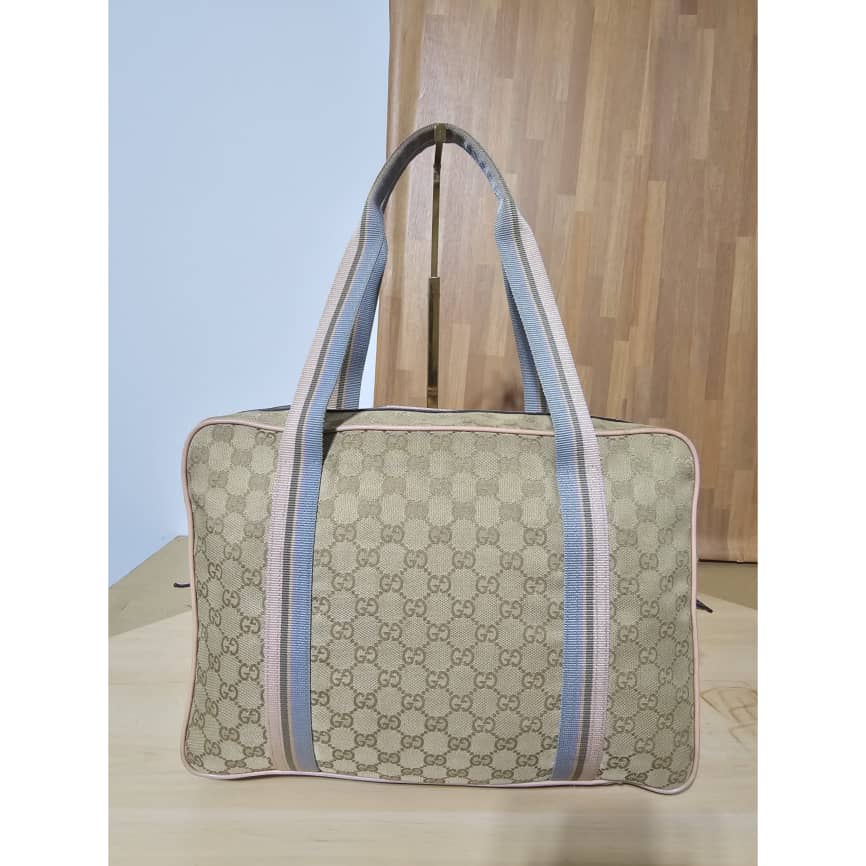 This authentic Gucci Top Zip Web GG Mummy’s Carrier Coated Canvas Large bag is in it’s good pre-owned condition. The exterior canvas is clean and beautiful. The interior is clean. Can be worn as a weekender or everyday use