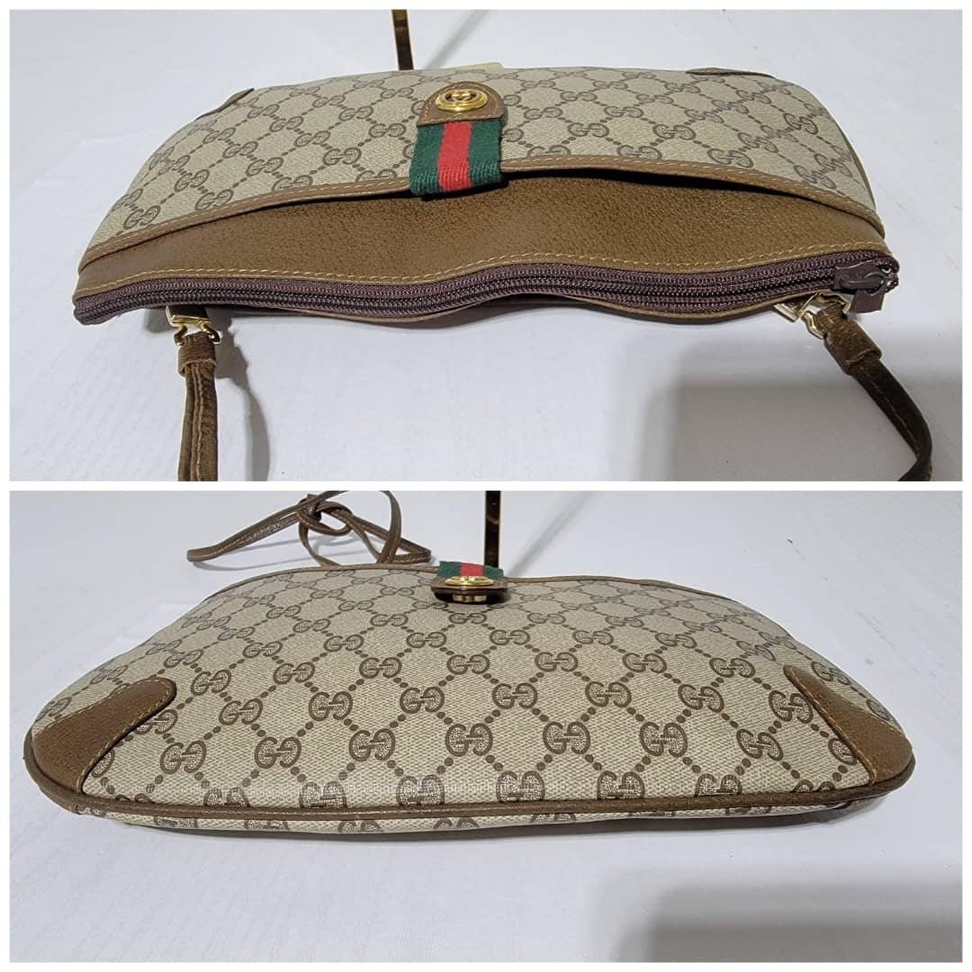 This authentic GUCCI Vintage GG Canvas Web Sherry Line Shoulder/Crossbody Bag Beige/Brown is in it’s good pre-owned condition. The exterior is clean and beautiful. Interior is clean. Gold hardware. The strap can go crossbody or shoulder drop