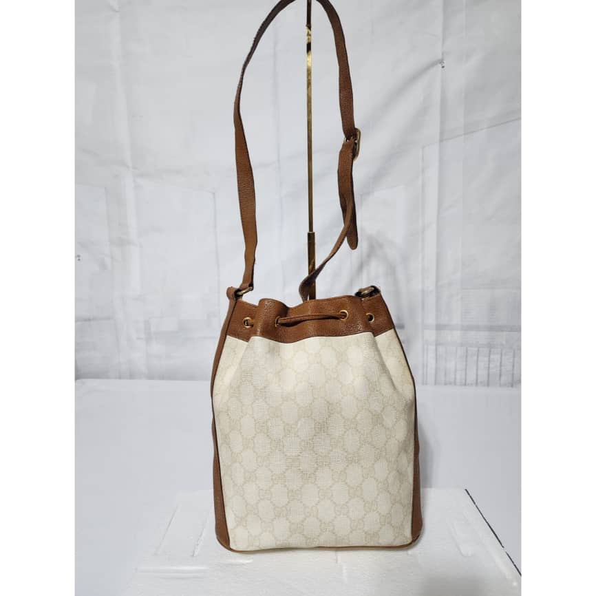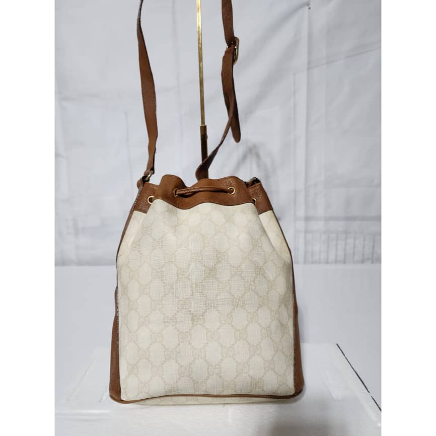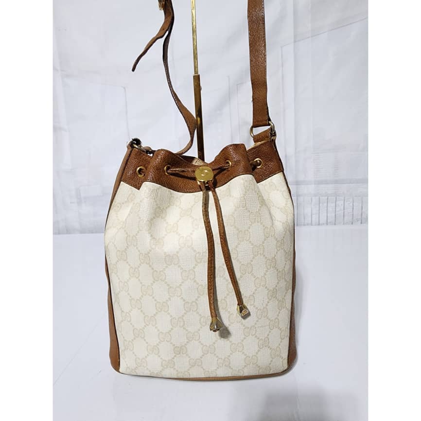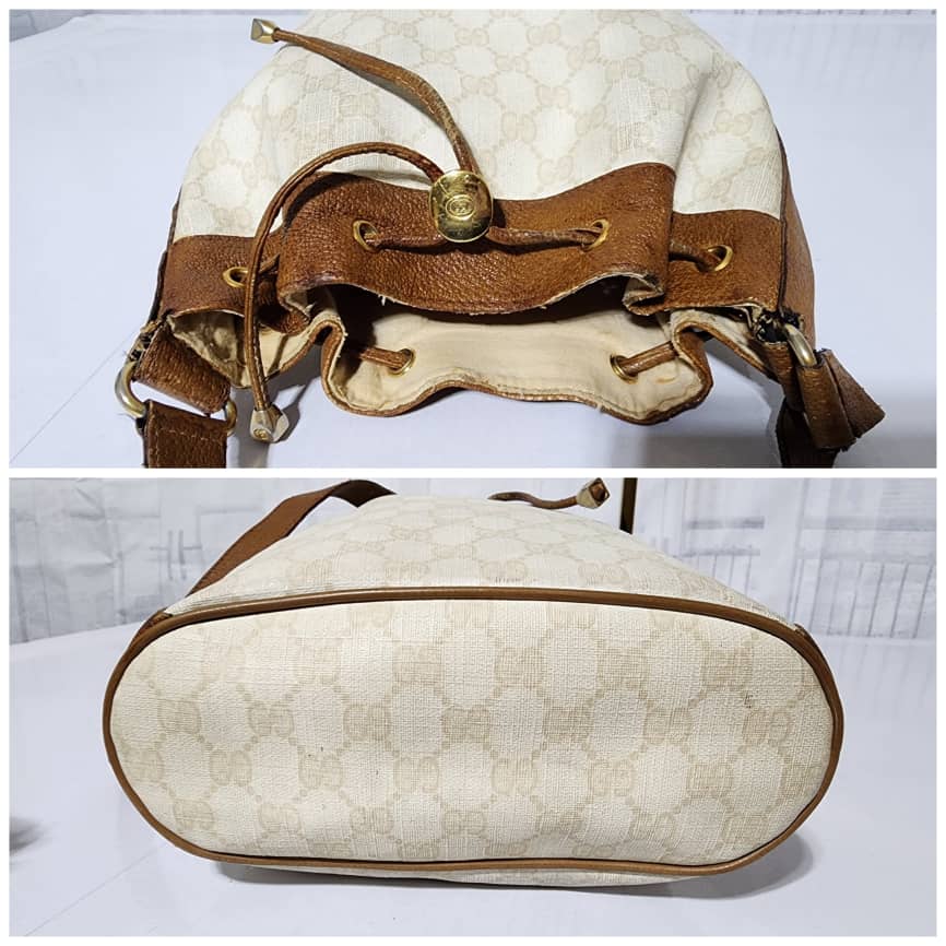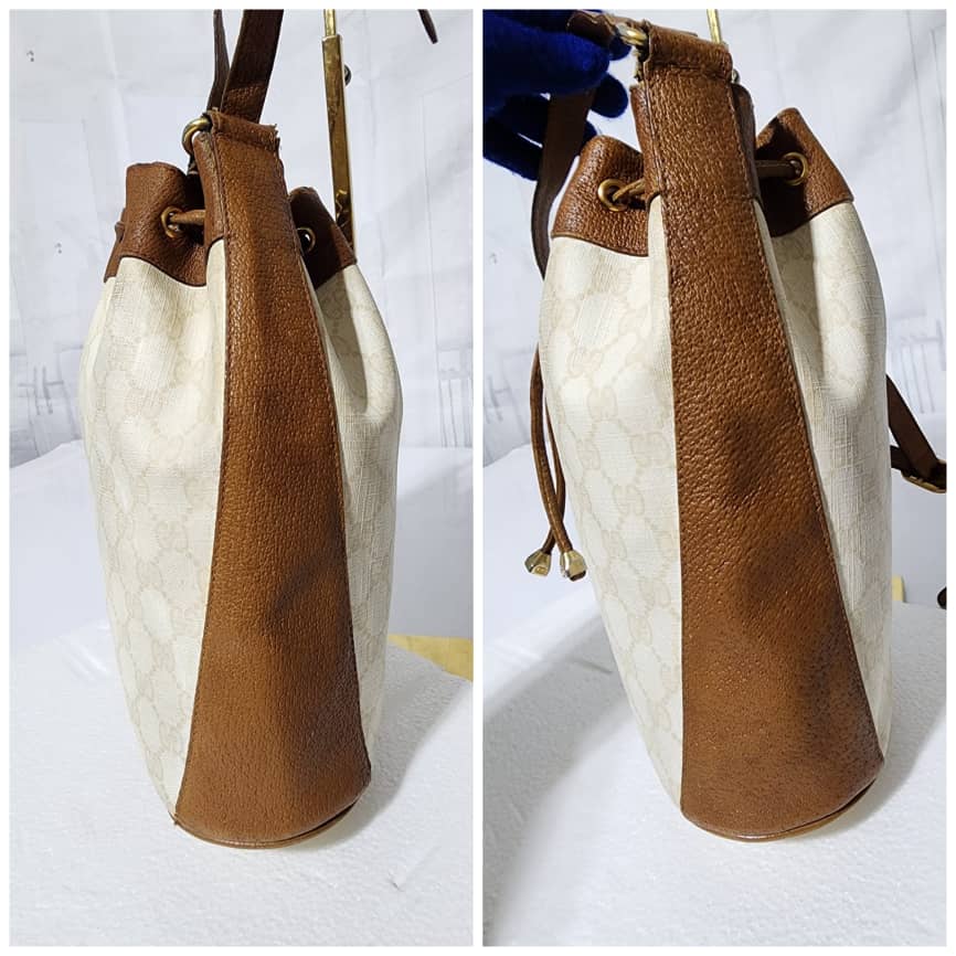 This authentic GUCCI Vintage GG Supreme Drawstring Bucket Bag White/Brown is in it’s pre-owned condition. The exterior coated canvas is clean. The brown leather trim that runs across the side and top of the bag shows sign of scratches and wear. Interior is clean however, it is in it’s vintage condition, there are some threadpull in the interior top edge and scuffing and scratches on the drawstring (Kindly look at pictures above).