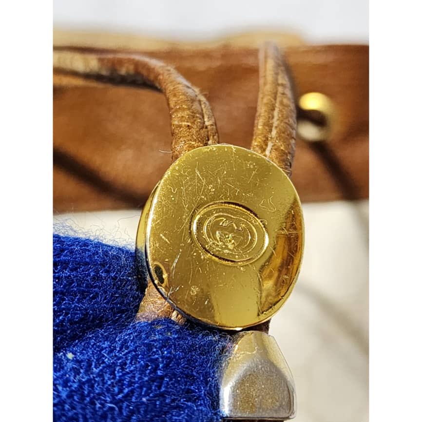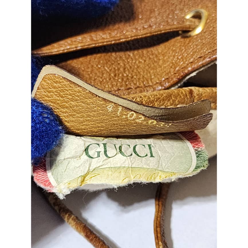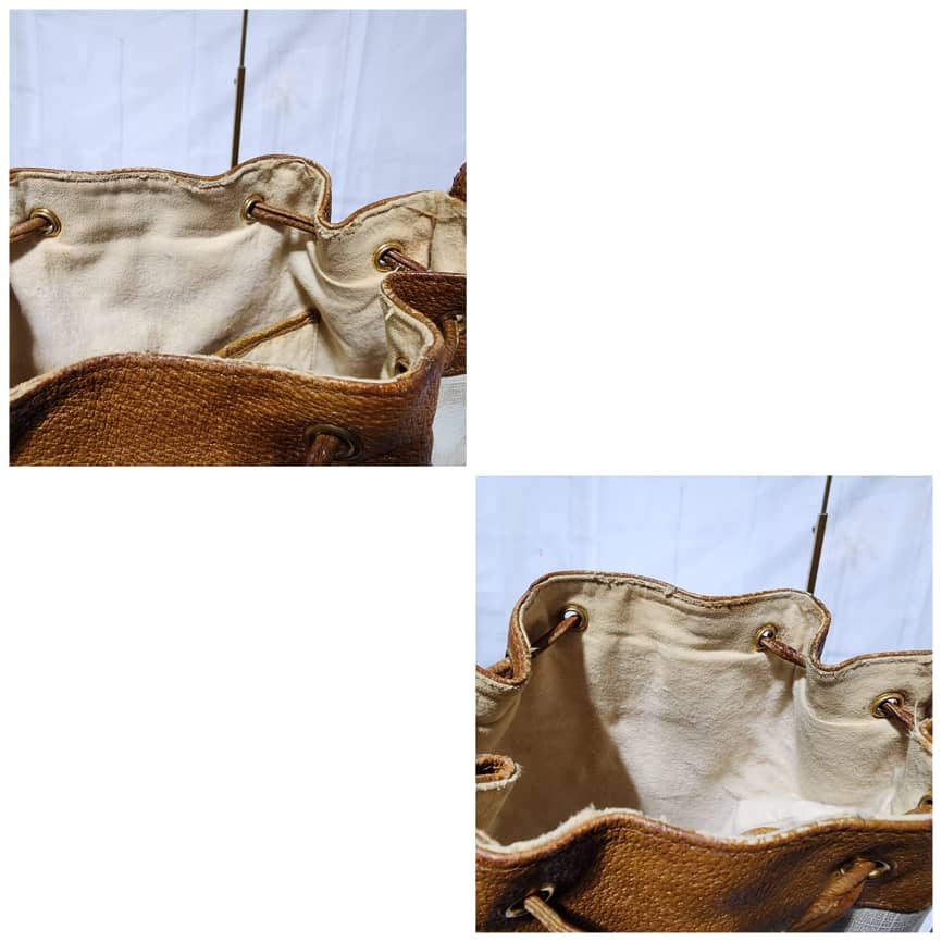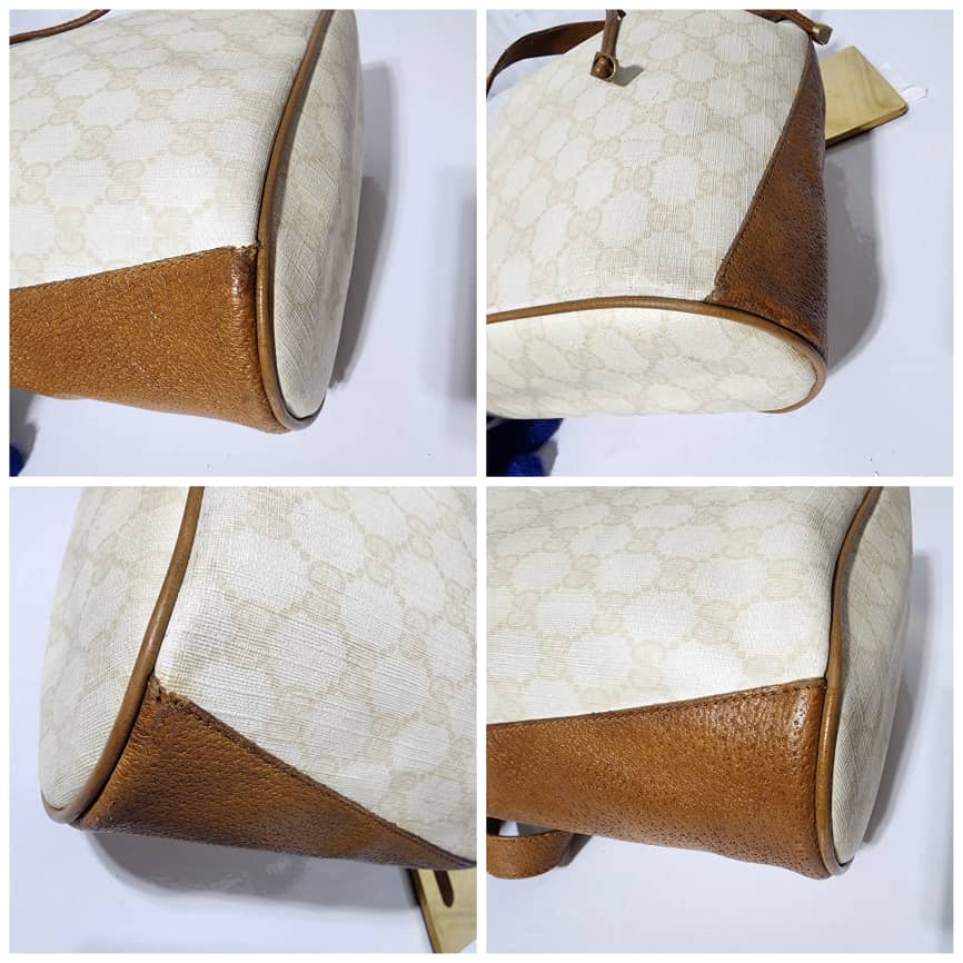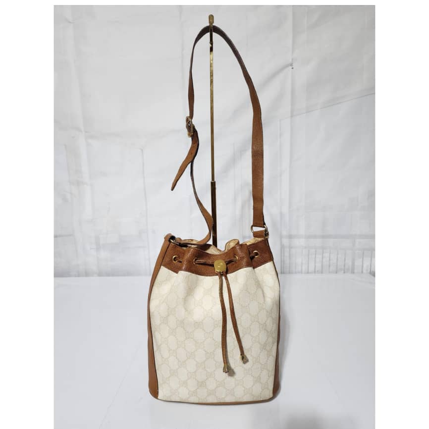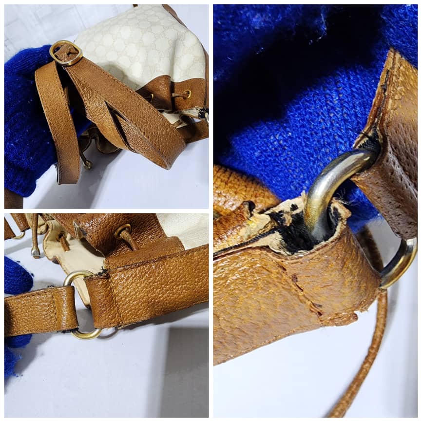 This authentic GUCCI Vintage GG Supreme Drawstring Bucket Bag White/Brown is in it’s pre-owned condition. The exterior coated canvas is clean. The brown leather trim that runs across the side and top of the bag shows sign of scratches and wear. Interior is clean however, it is in it’s vintage condition, there are some threadpull in the interior top edge and scuffing and scratches on the drawstring (Kindly look at pictures above).
