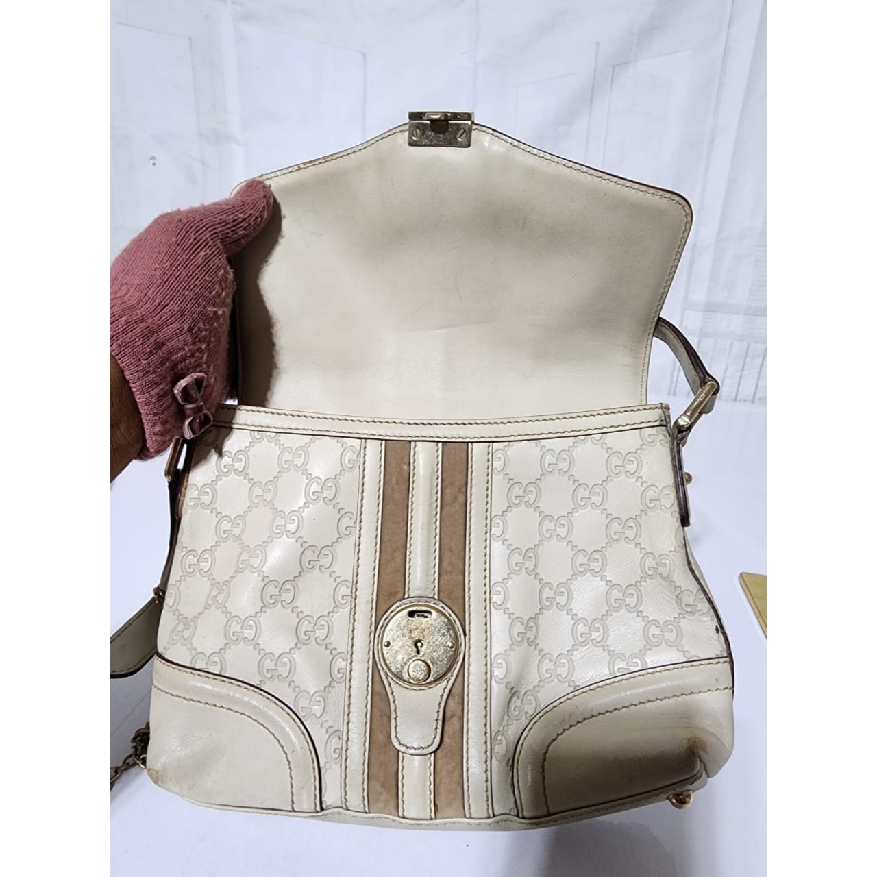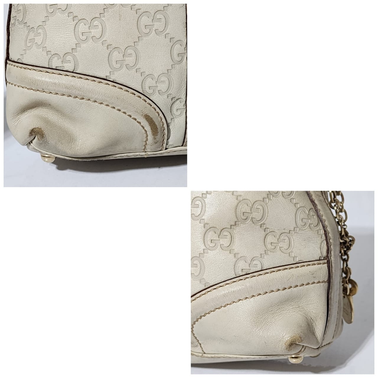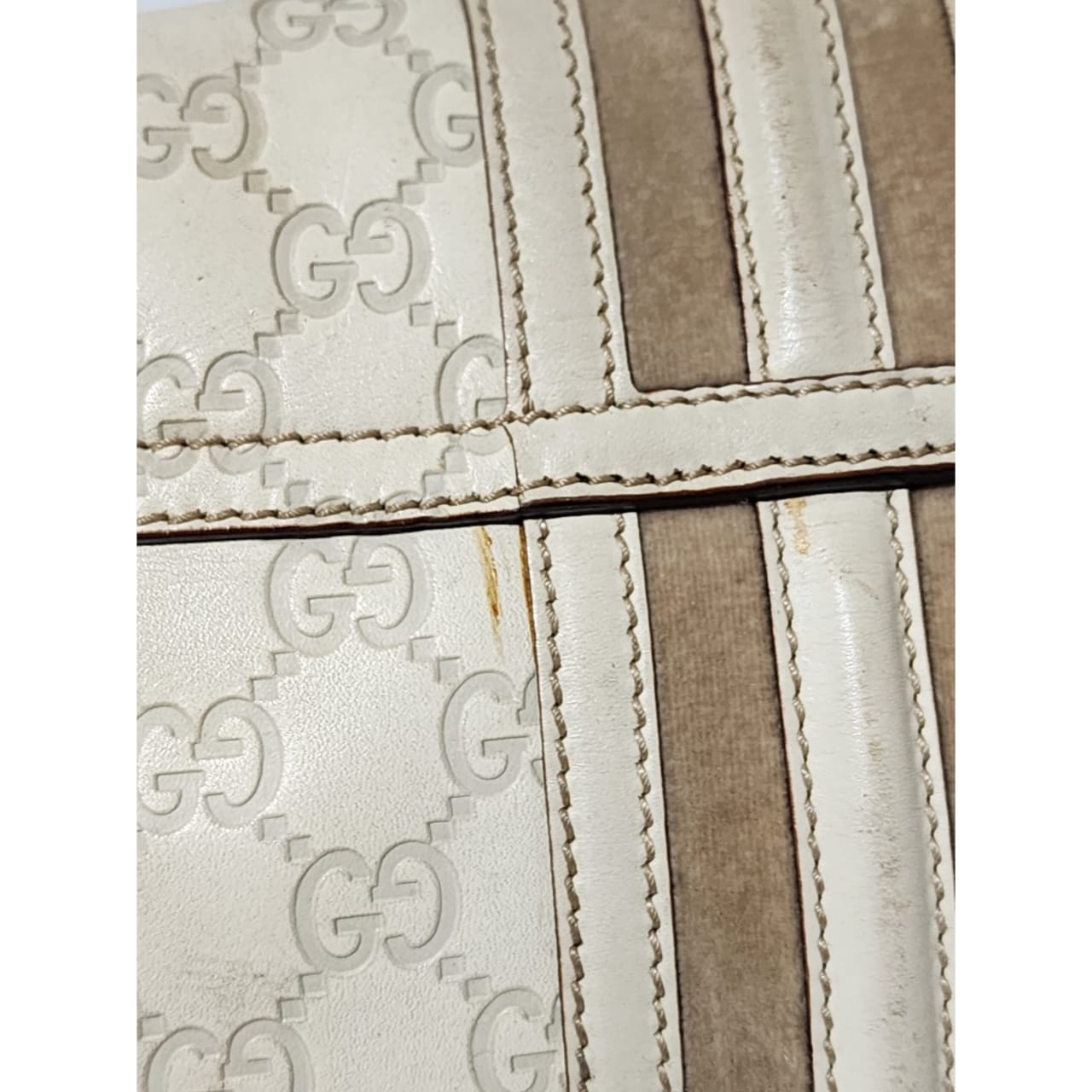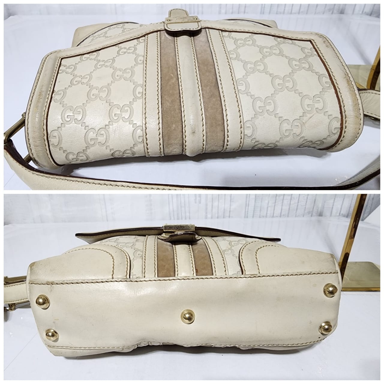 This authentic GUCCI Vintage Guccissima Treasure Flap Off-White is in itβs pre-owned condition. The exterior is clean however, it shows scratches at the edges of the flap and base edges of the bag. Gold hardware shows some scratches to it. Kindly note that the bag shows some sign of wear to it.