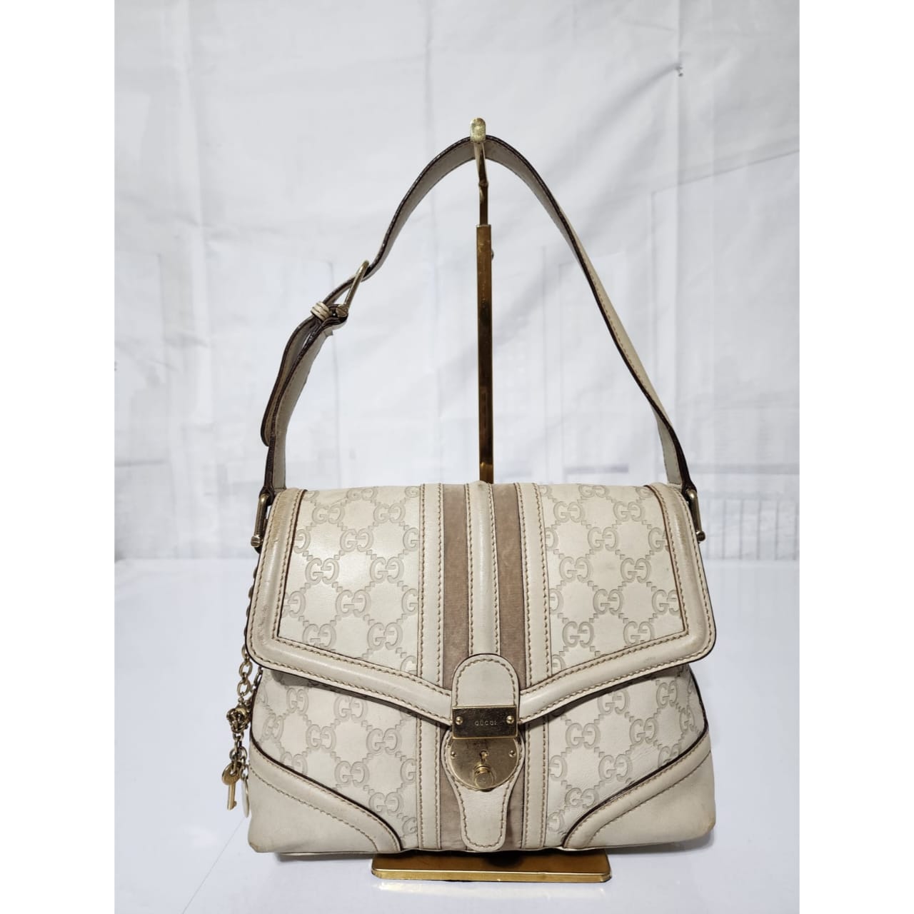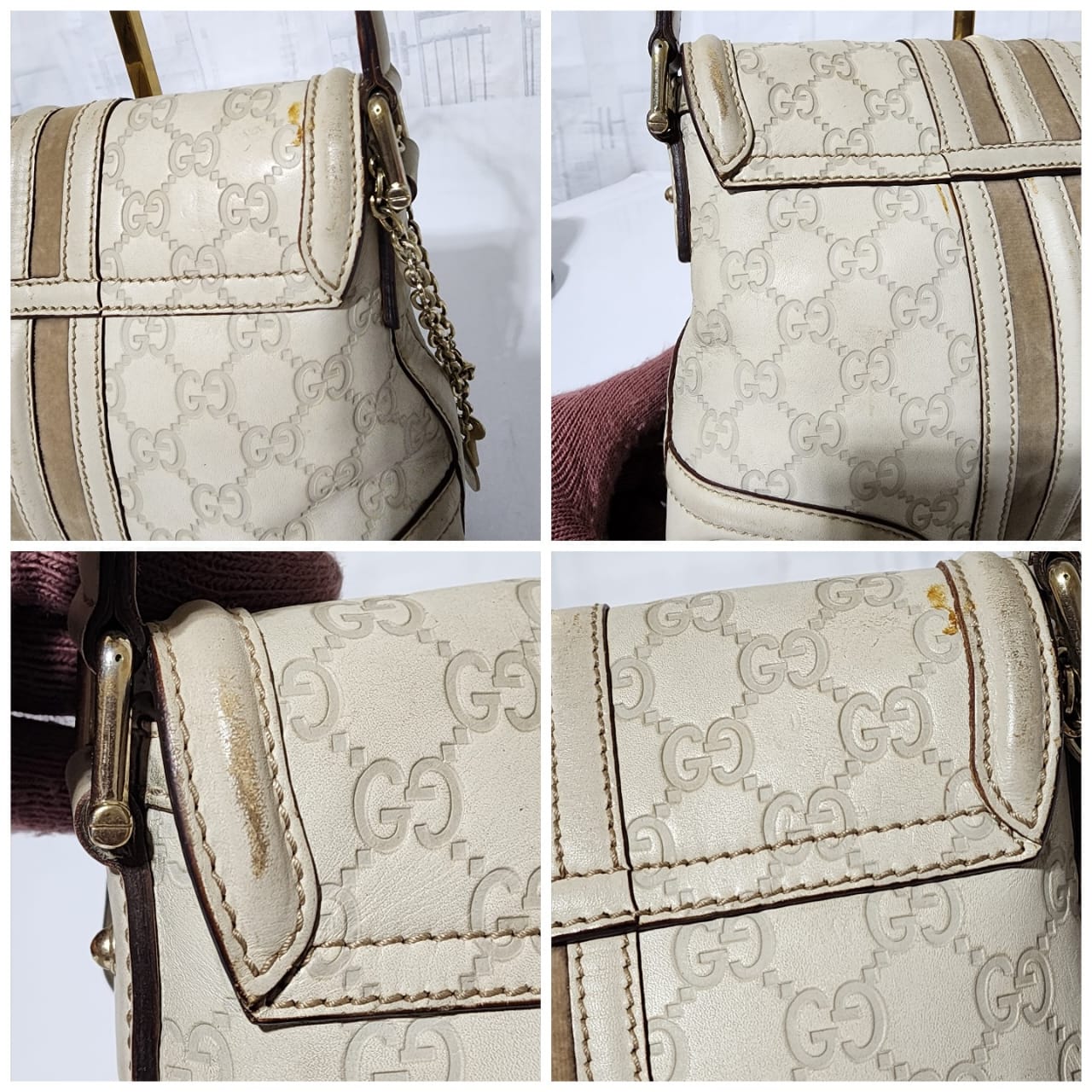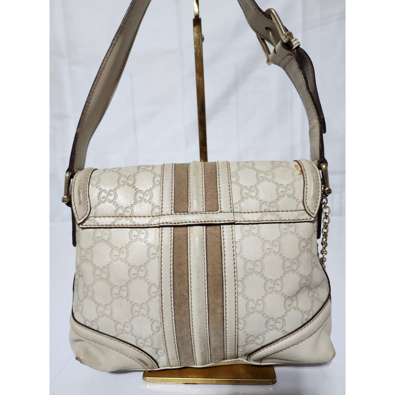 This authentic GUCCI Vintage Guccissima Treasure Flap Off-White is in itβs pre-owned condition. The exterior is clean however, it shows scratches at the edges of the flap and base edges of the bag. Gold hardware shows some scratches to it. Kindly note that the bag shows some sign of wear to it.