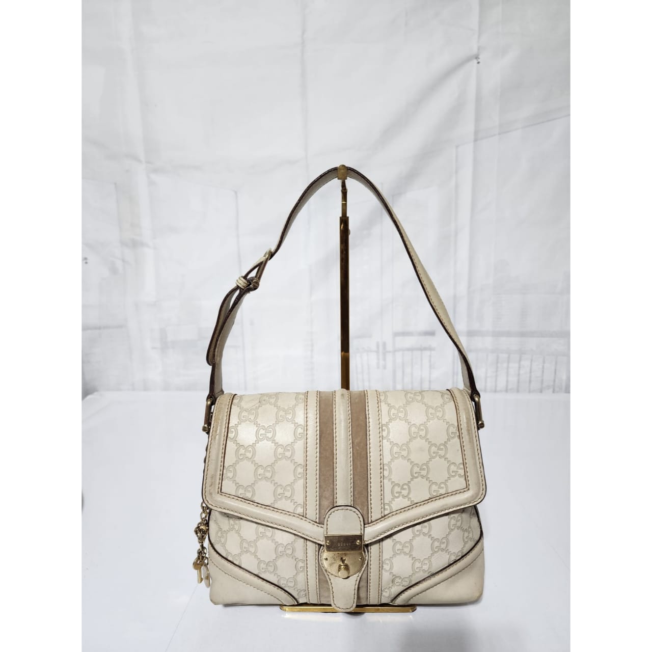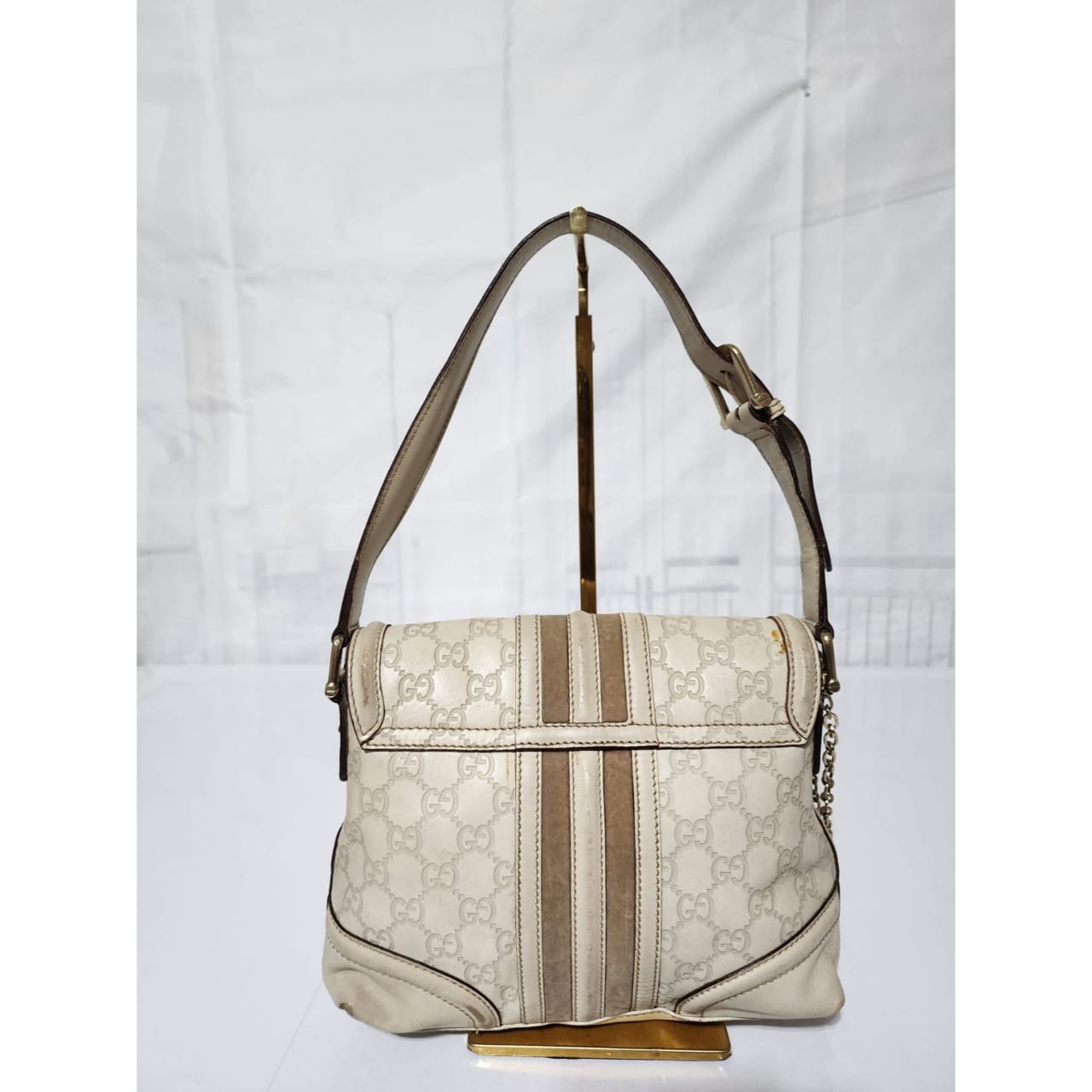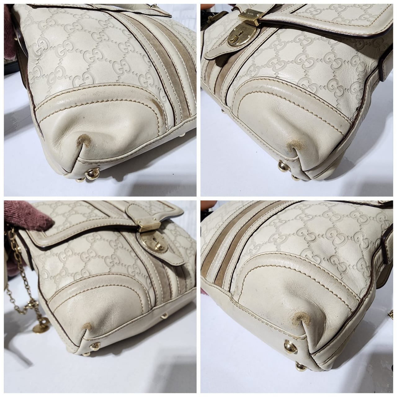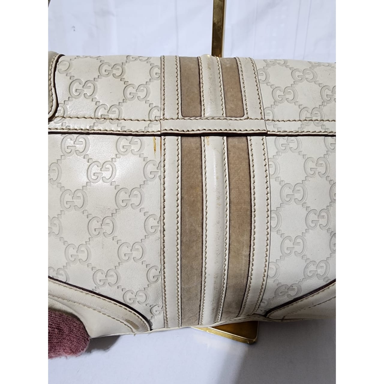 This authentic GUCCI Vintage Guccissima Treasure Flap Off-White is in itβs pre-owned condition. The exterior is clean however, it shows scratches at the edges of the flap and base edges of the bag. Gold hardware shows some scratches to it. Kindly note that the bag shows some sign of wear to it.