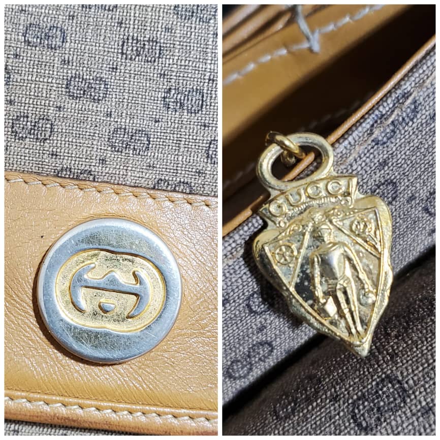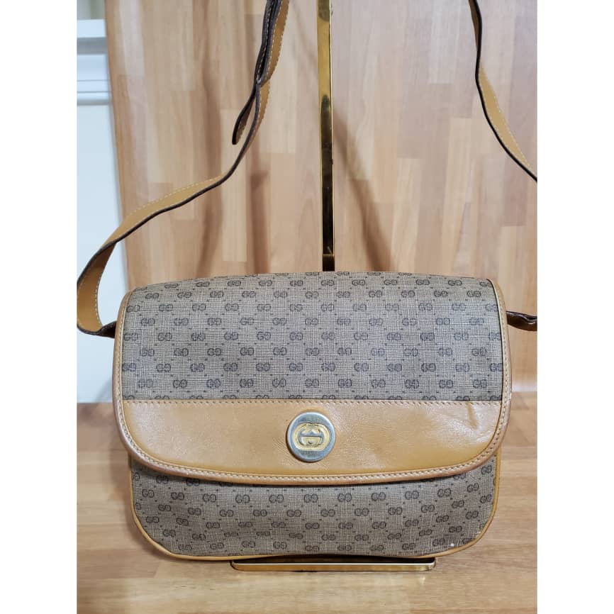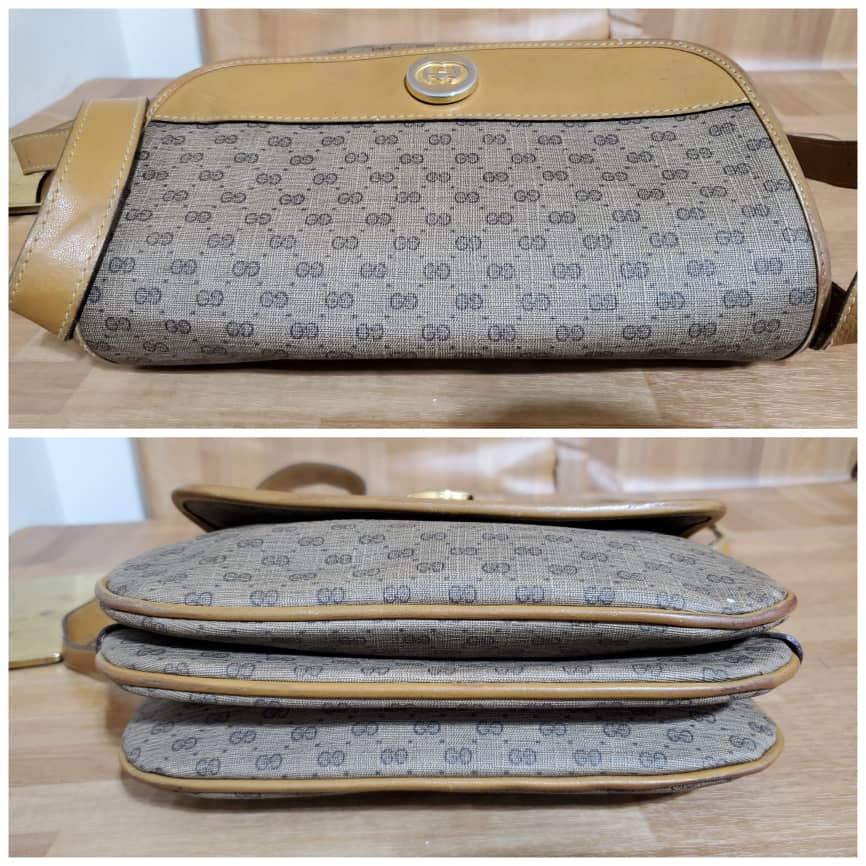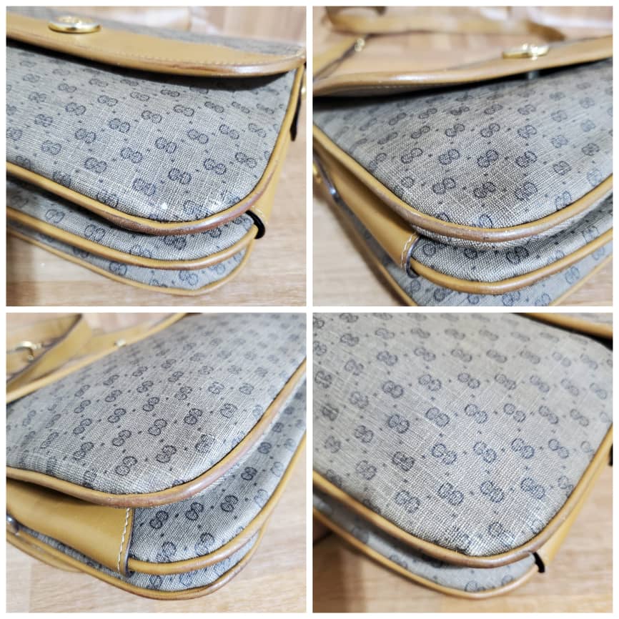 This authentic GUCCI Vintage Micro GG Canvas Shoulder/Crossbody Bag Beige is in it’s pre-owned condition. The exterior coated canvas is clean. Interior is clean. The base edges shows rubbing wear.