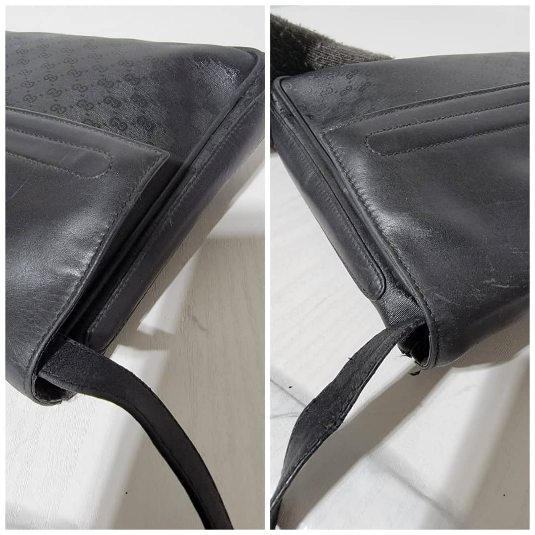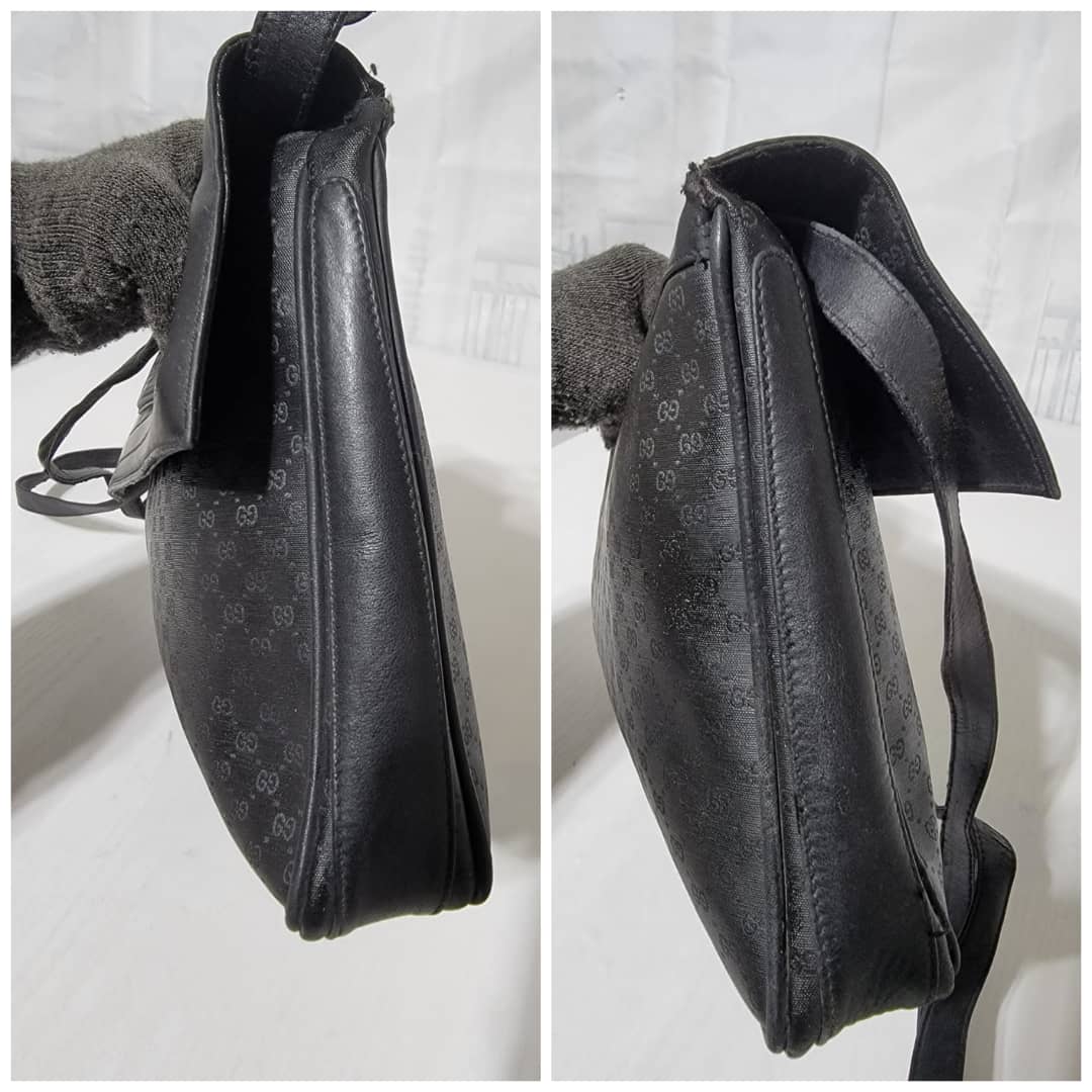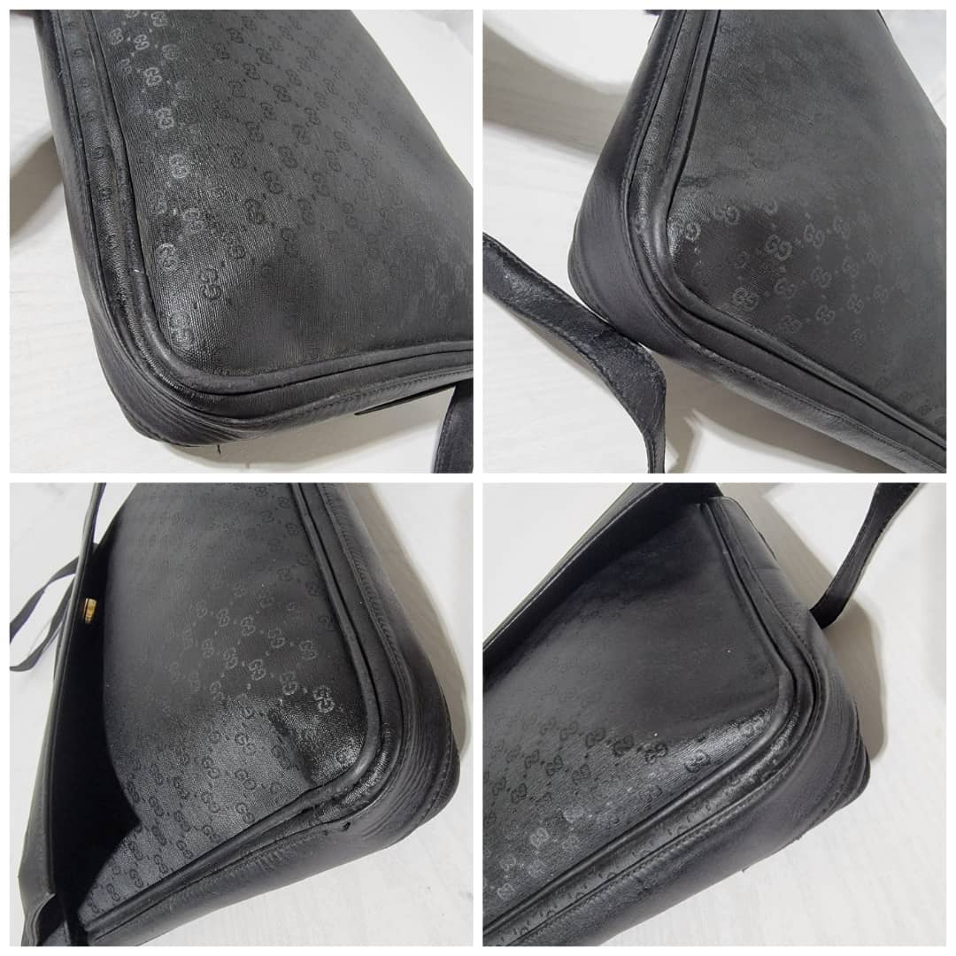This authentic Gucci Vintage Micro Gg Monogram Crossbody Bag Black is in it’s good vintage condition. The exterior coated canvas and leather is clean and beautiful. The interior is in it’s vintage condition,the leather is pulled out from the cotton material (Kindly look at pictures above).