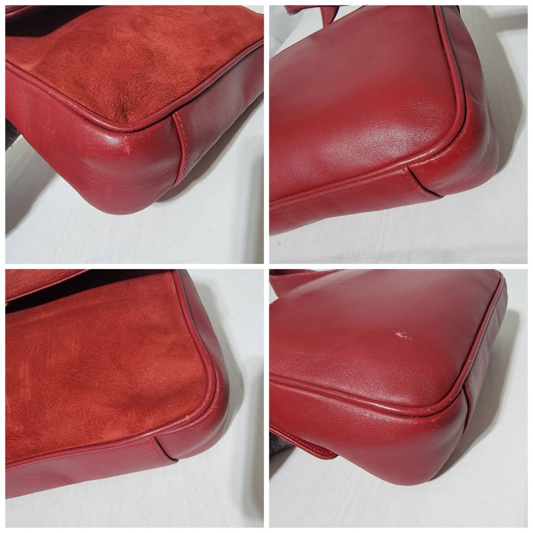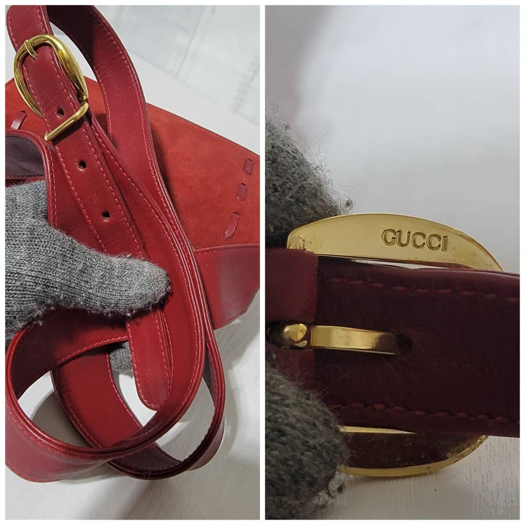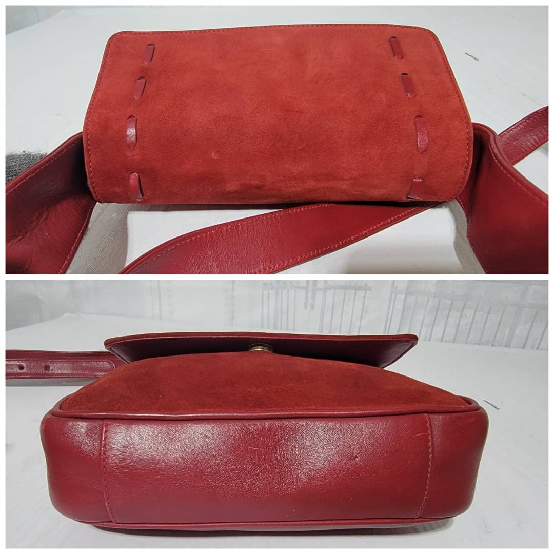 This authentic Gucci Suede Crossbody/Shoulder Bag Red is in it’s good pre-owned condition. The exterior is clean and beautiful. Interior is clean. Gold hardware. The back has a tiny little mark (Kindly look at pictures above).