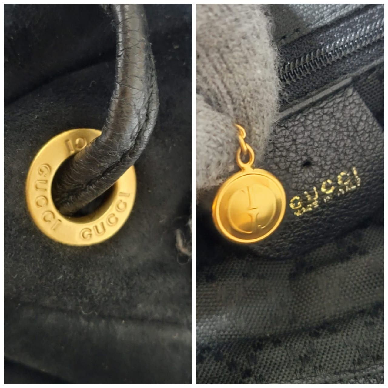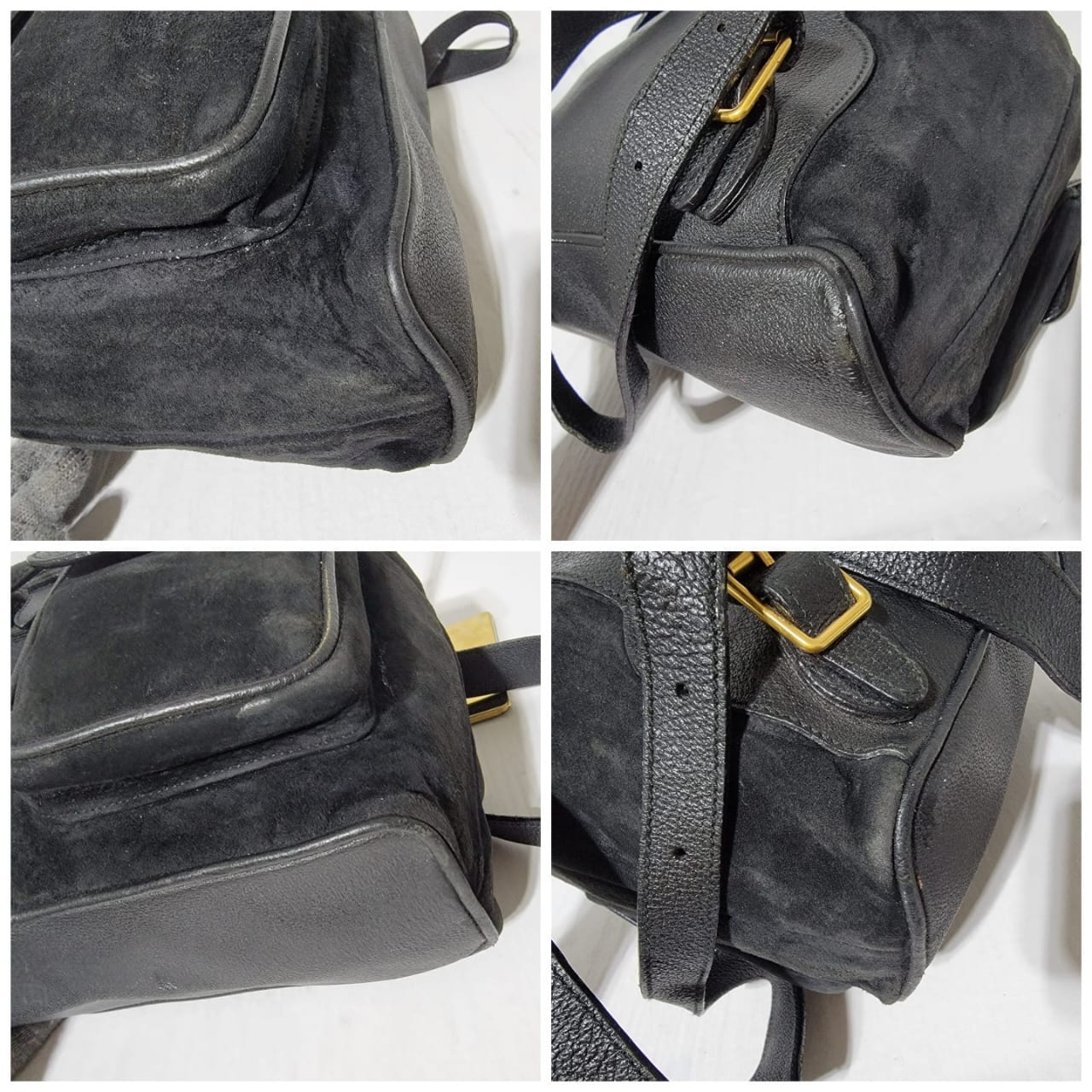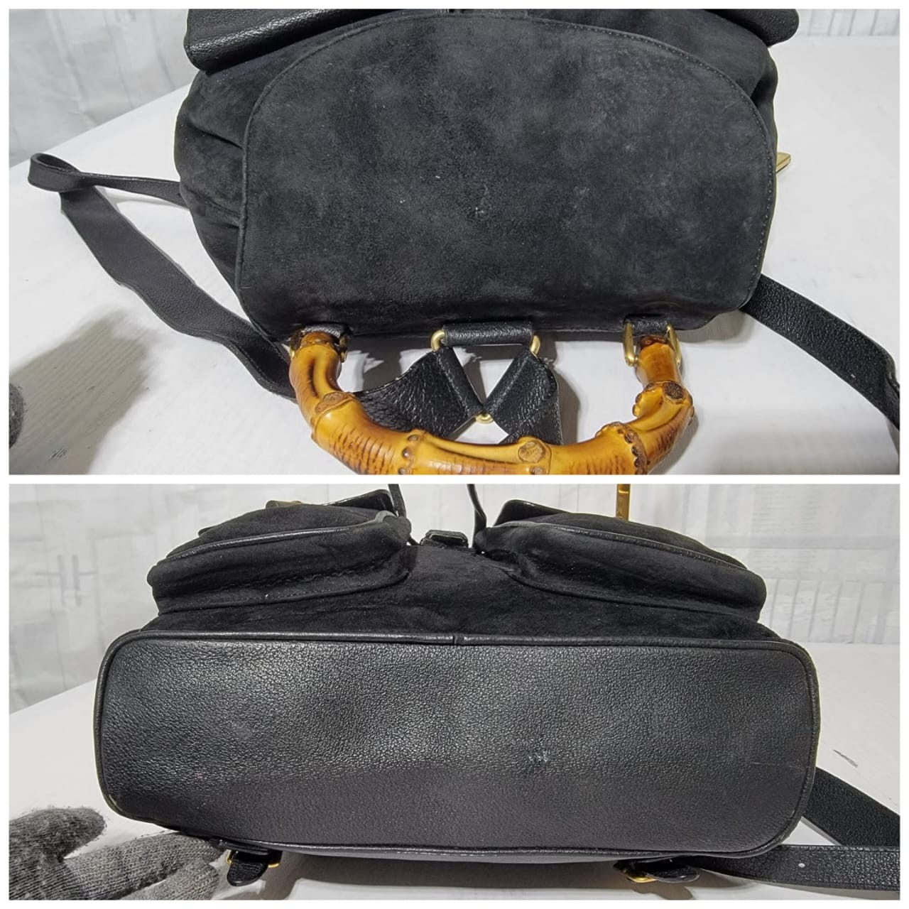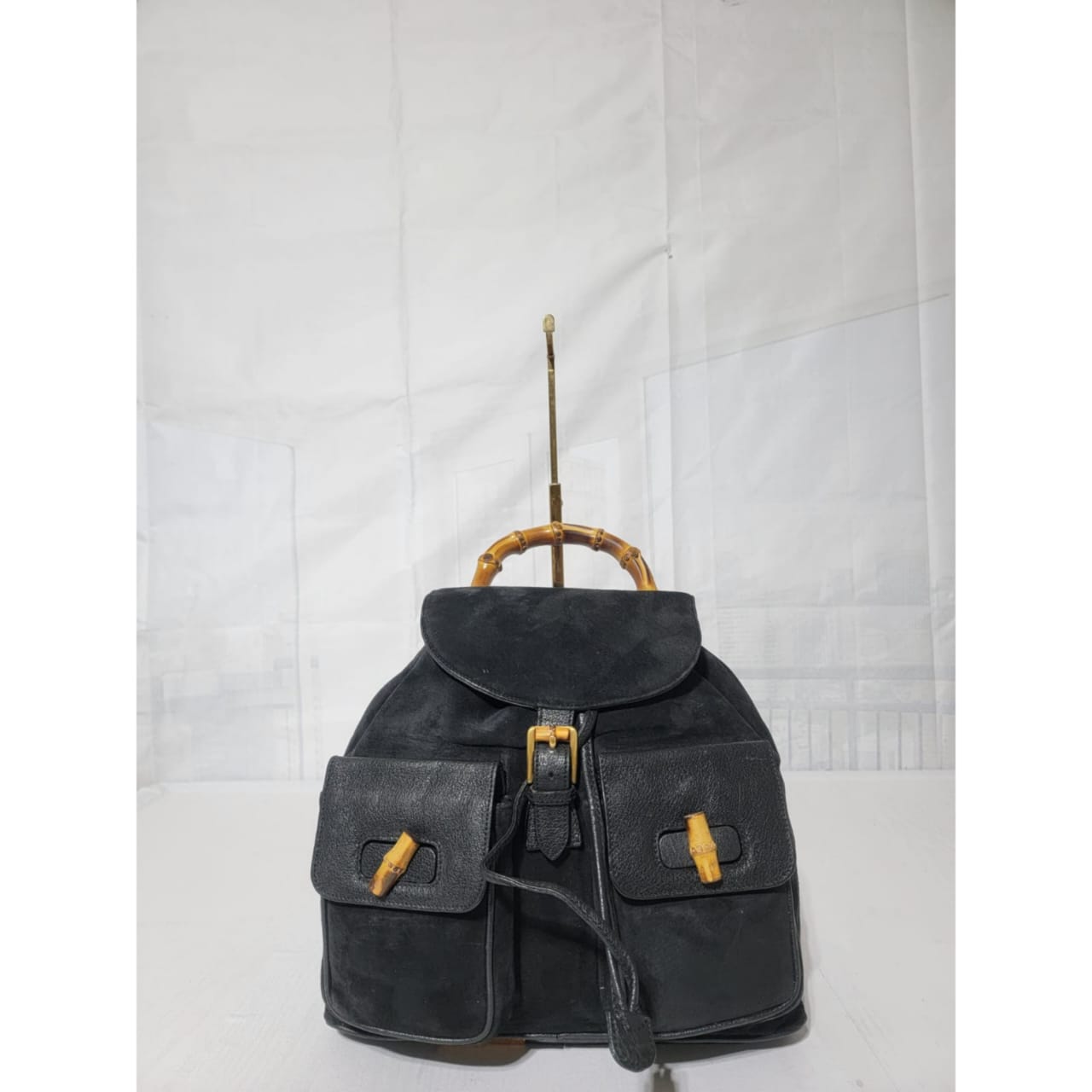 This authentic Gucci Vintage Suede and Leather Bamboo Backpack Black is in it’s good pre-owned condition. The exterior is clean and beautiful. Interior is clean. It has brass hardware. It is a suede bag mixed with leather buckle, drawstring, back exterior and strap.
