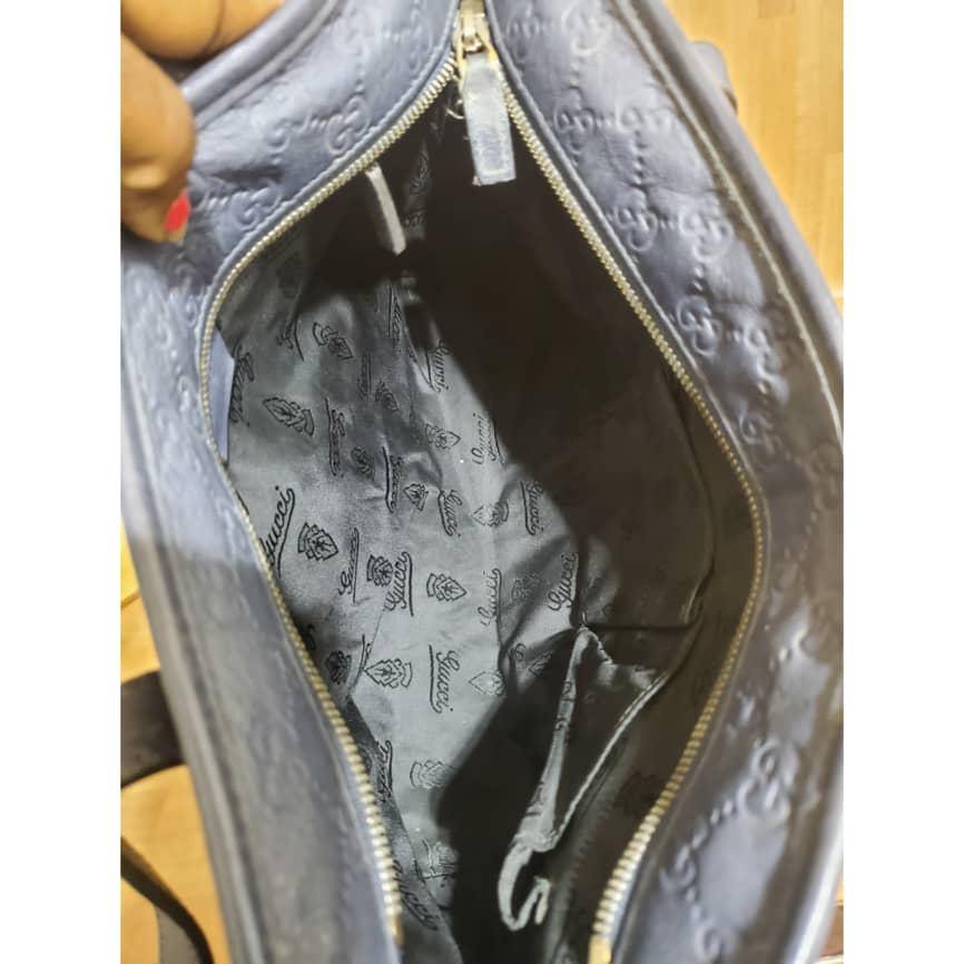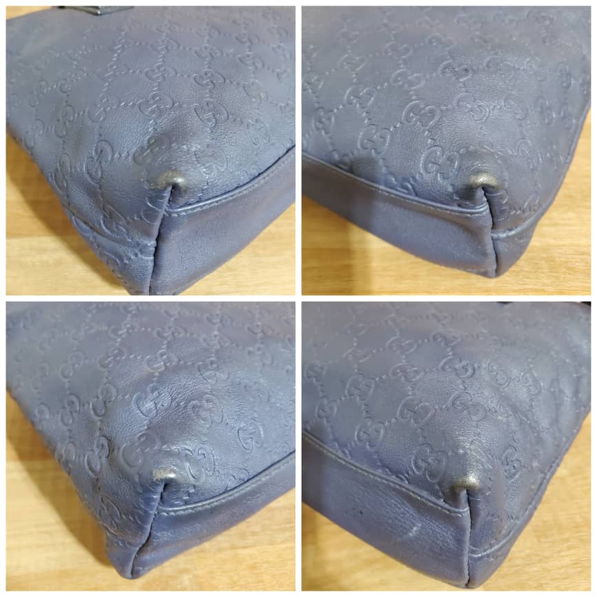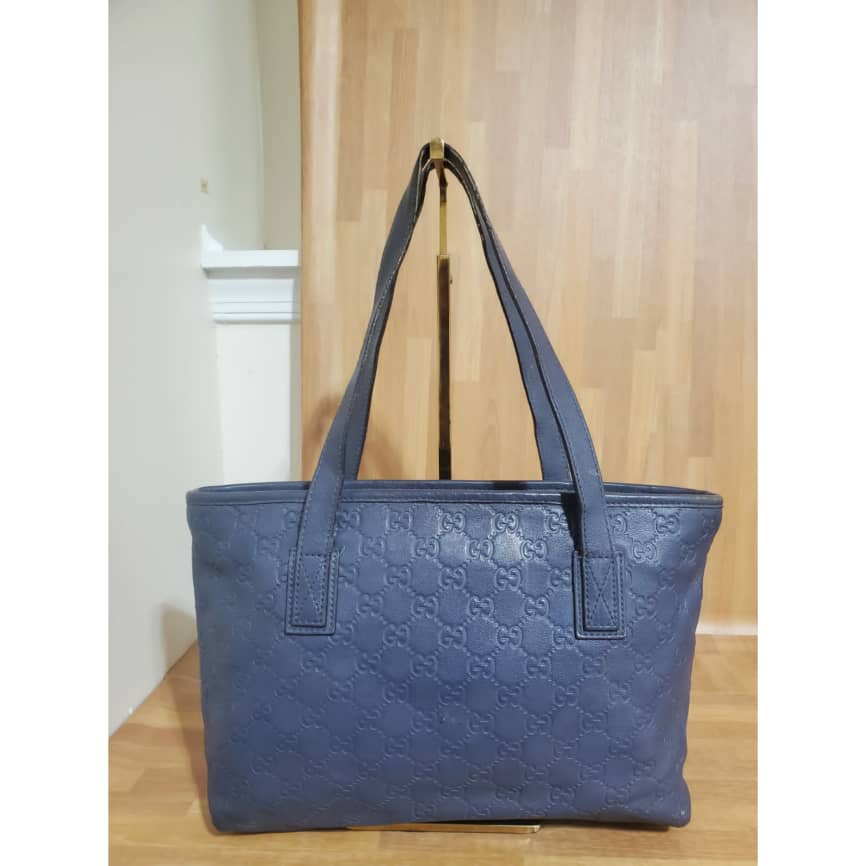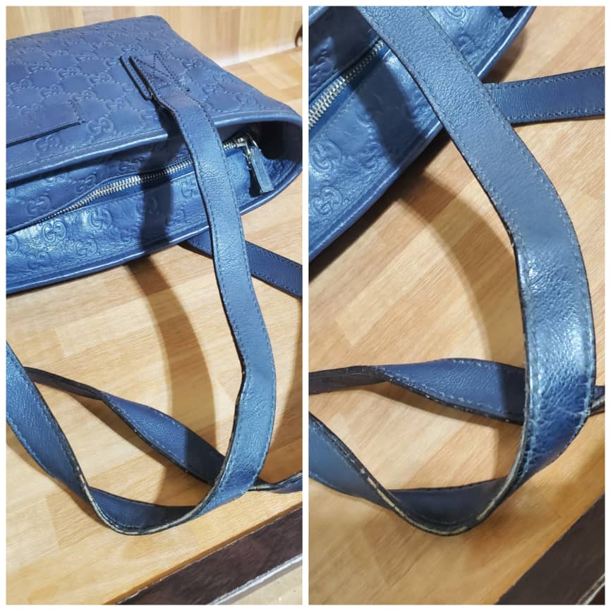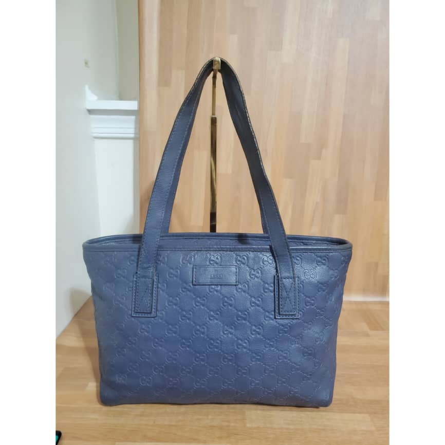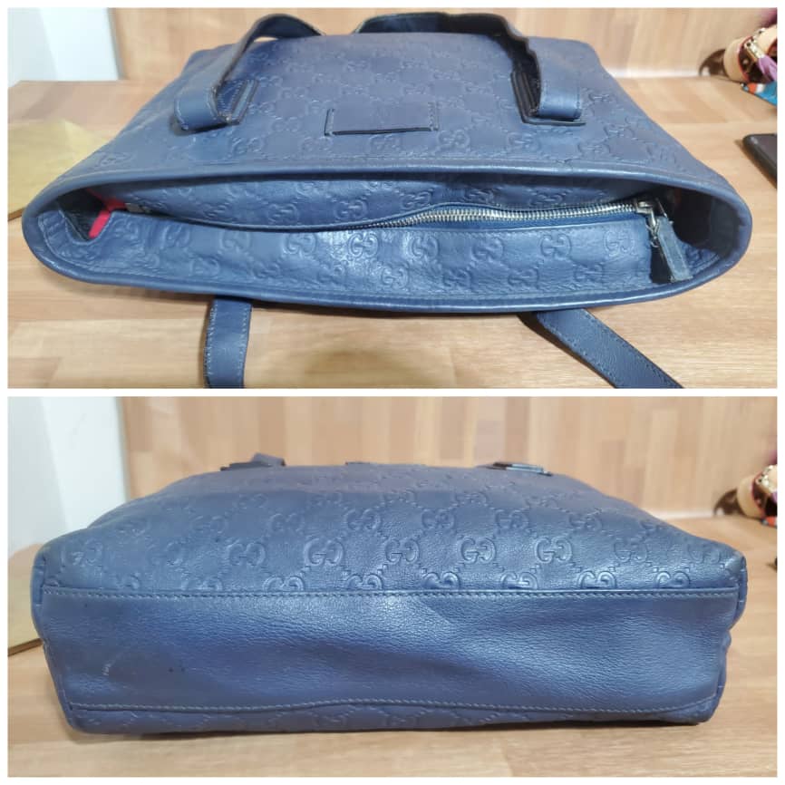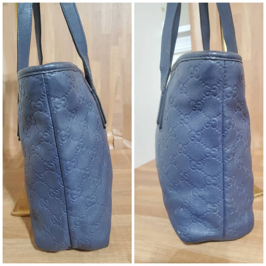 This authentic Gucci Zip Tote Guccissima Leather Small blue bag is in it’s pre-owned good condition. Has sign of use. The exterior leather is clean and beautiful. Interior is clean. The edges shows little rubbing.