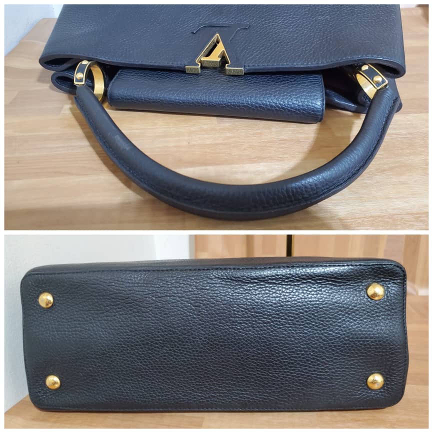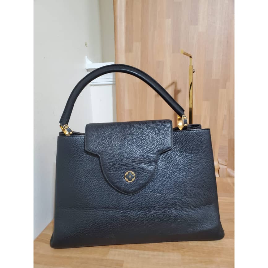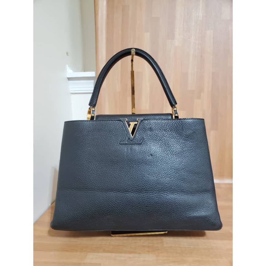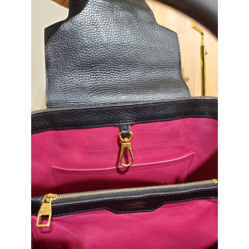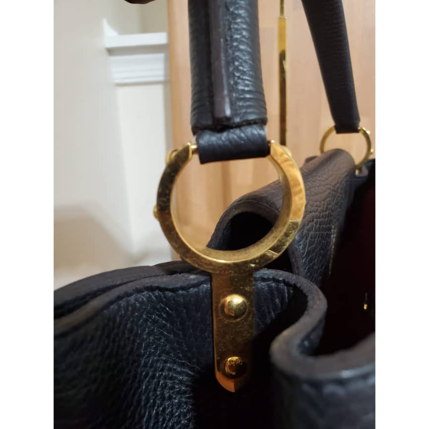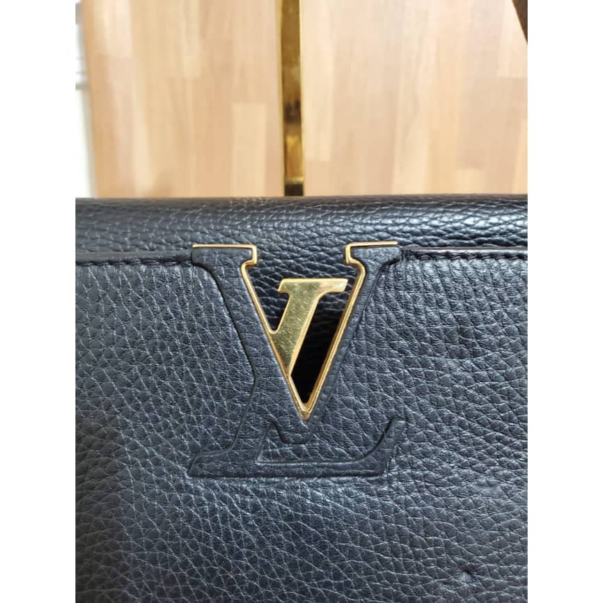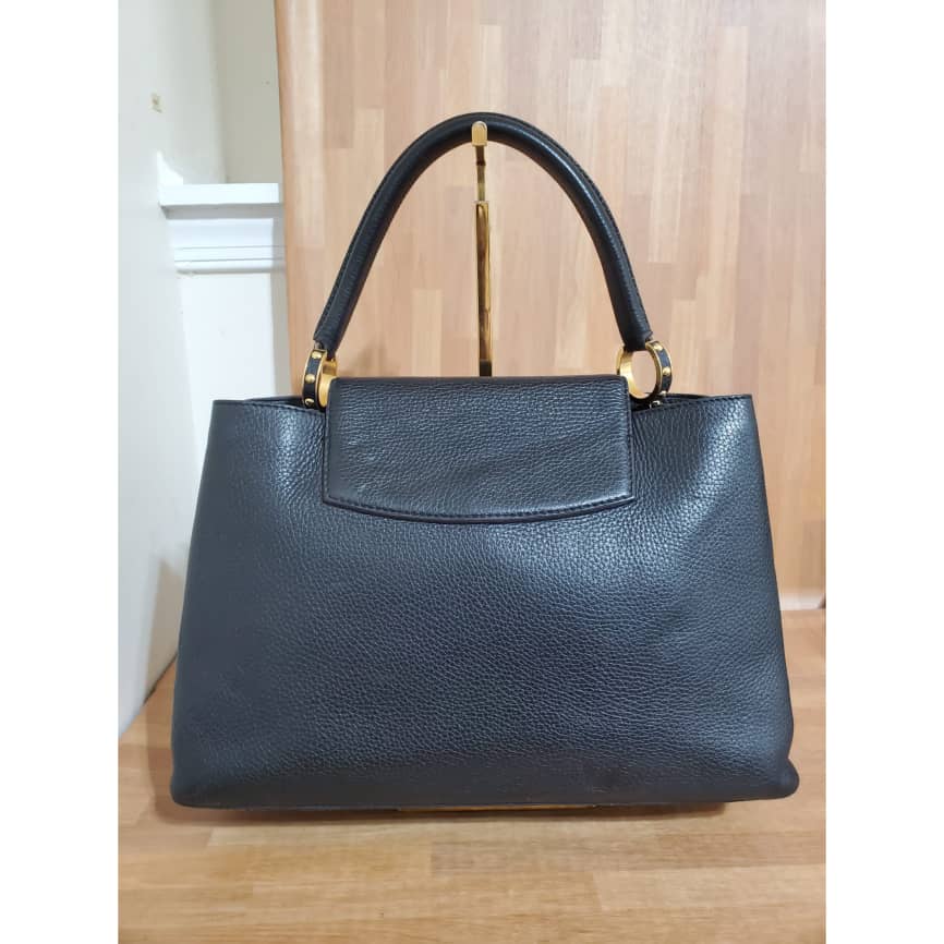 This authentic Louis Vuitton Capucines Mm Black Taurillon Leather Tote is in its pre-owned condition. the exterior leather is clean little indention on the front due to parking. The interior is clean but shows some pen marks. Gold hardware. Beautiful and classic