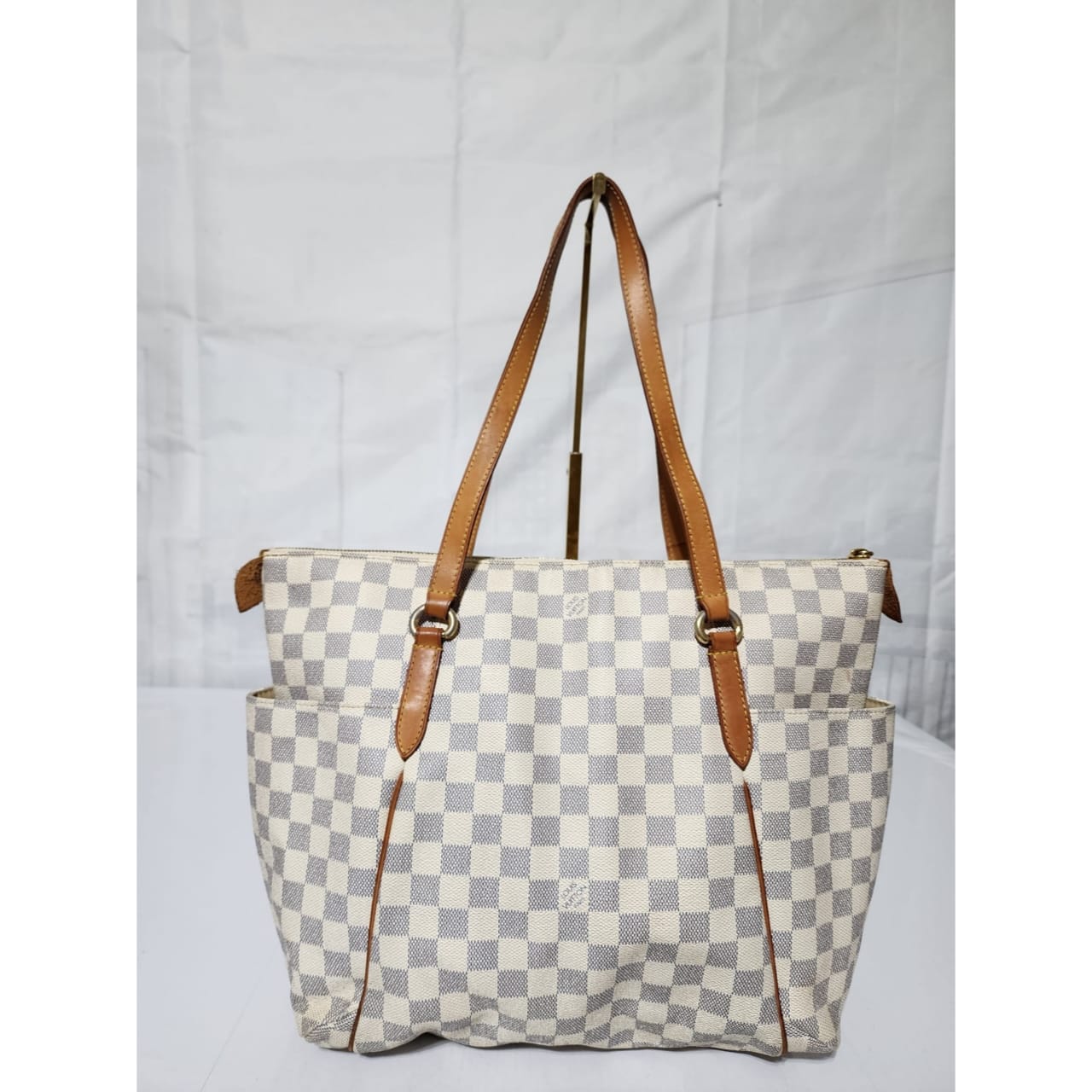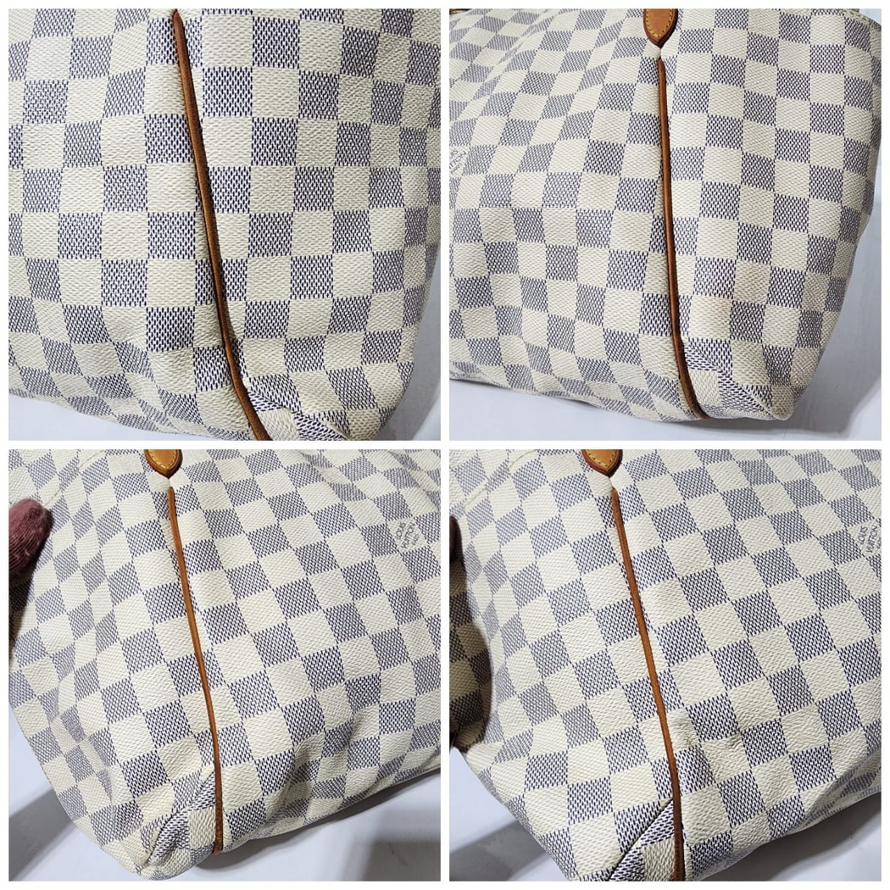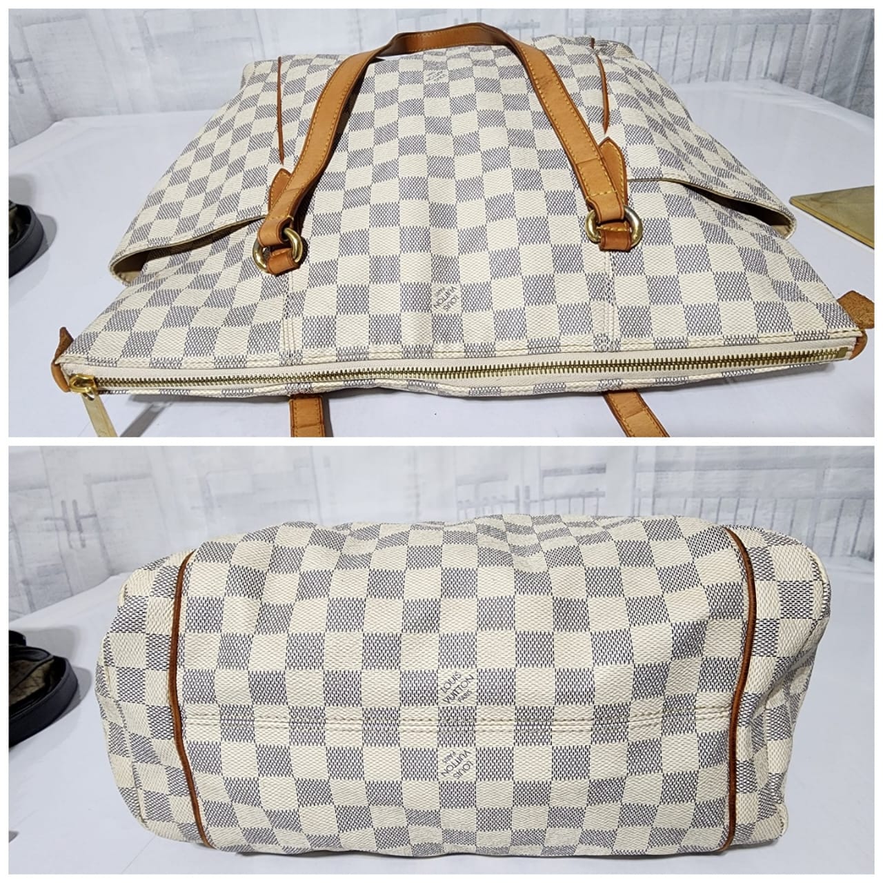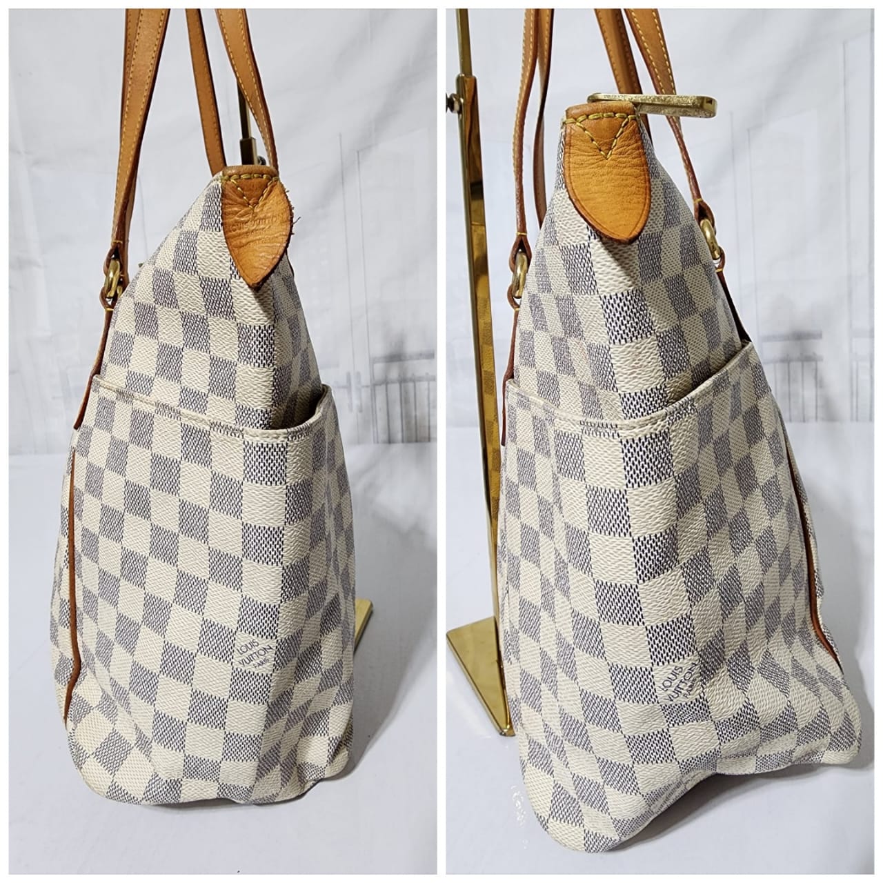 This authentic Louis Vuitton Damier Azur Monogram Totally MM Tote Bag Beige/Grey/Off-white is in it’s good pre-owned condition. The exterior is clean and beautiful. Interior is clean. The vachatte leather shows light honey patina to it. It is in good condition.