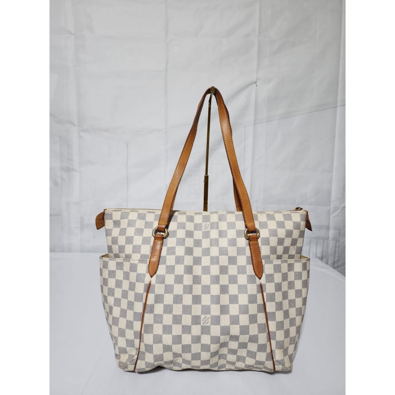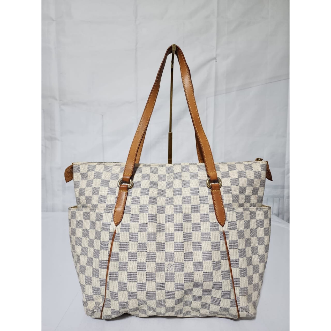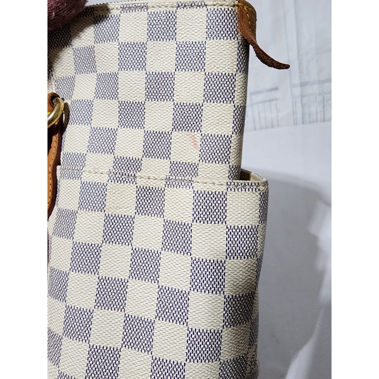 This authentic Louis Vuitton Damier Azur Monogram Totally MM Tote Bag Beige/Grey/Off-white is in it’s good pre-owned condition. The exterior is clean and beautiful. Interior is clean. The vachatte leather shows light honey patina to it. It is in good condition.