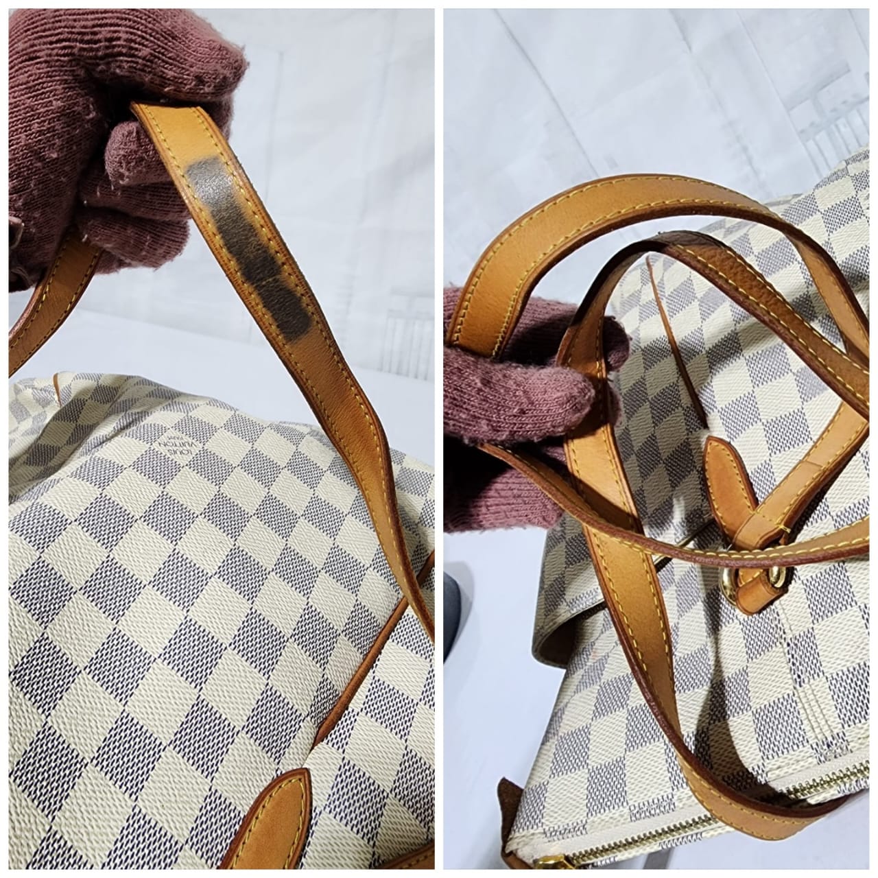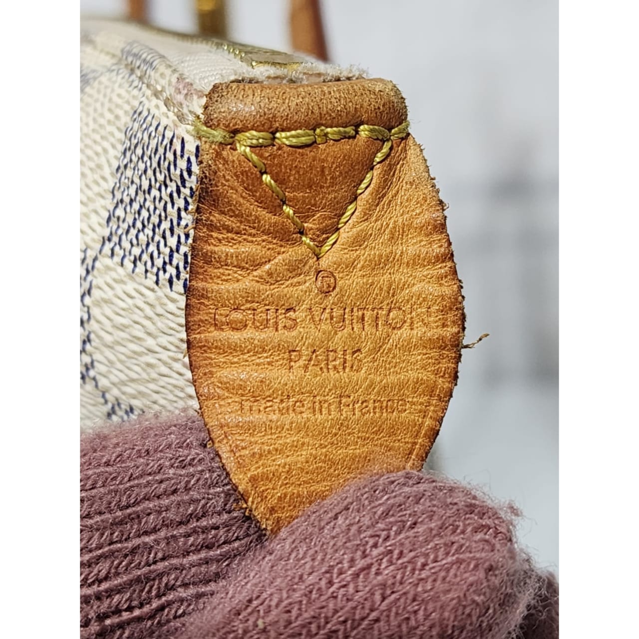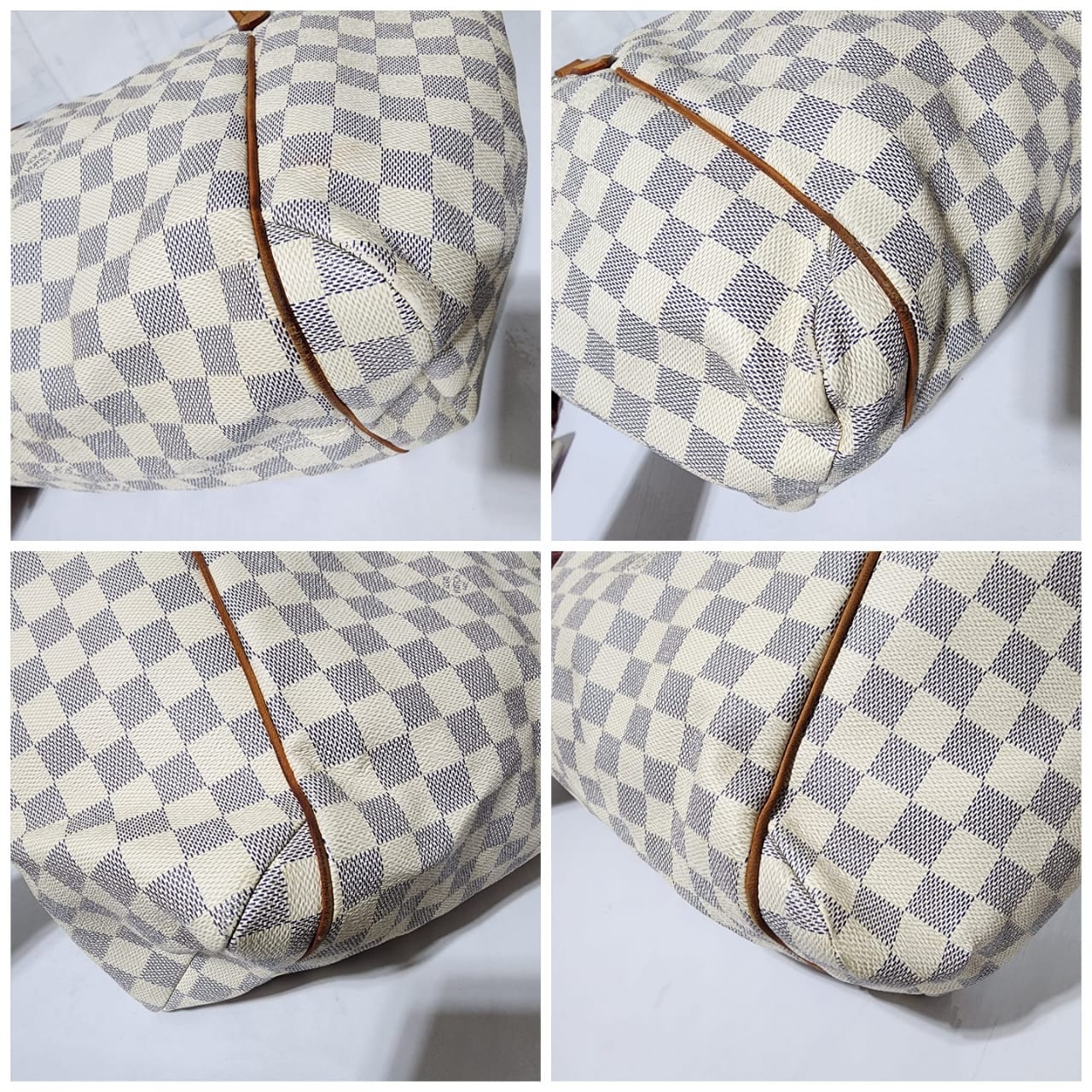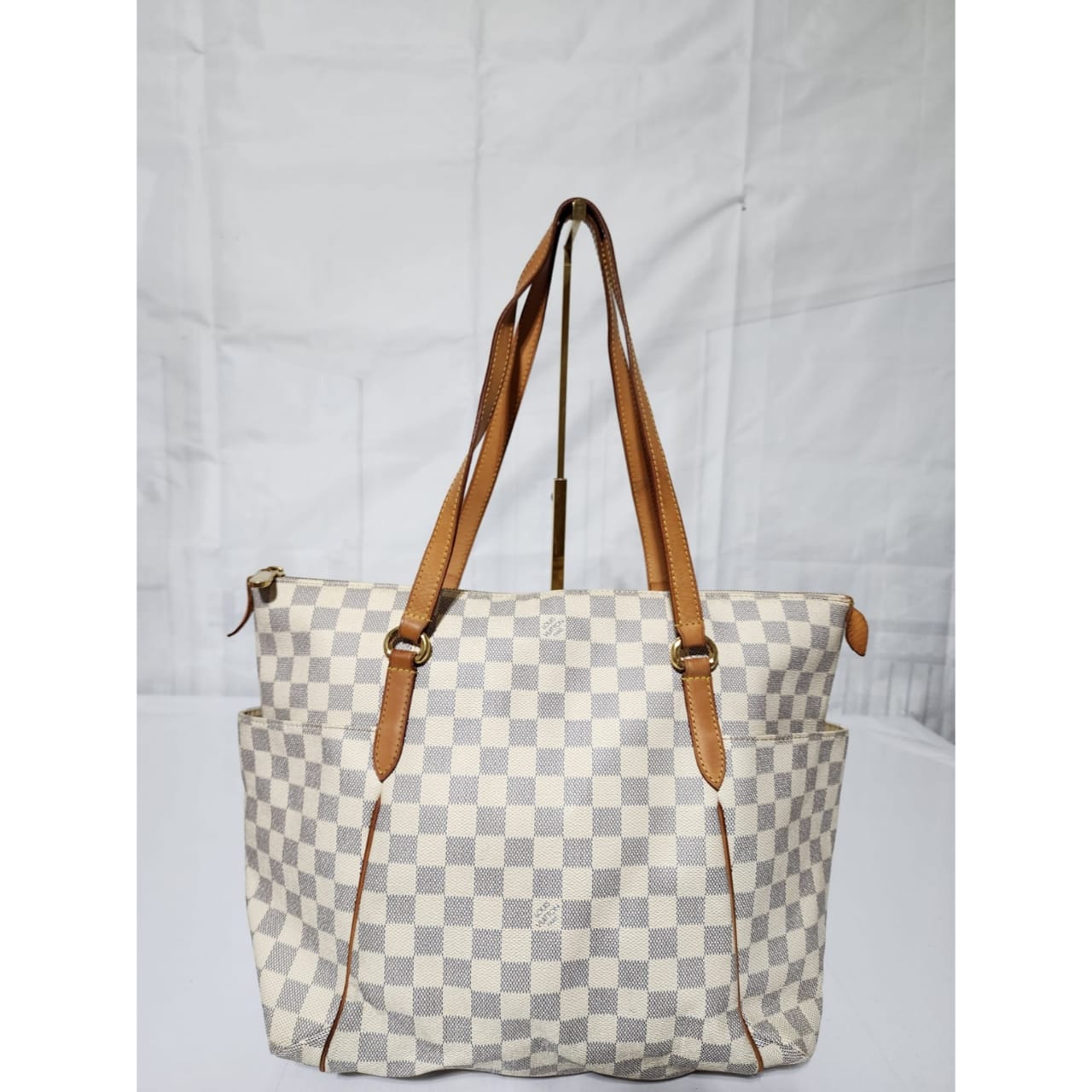 This authentic Louis Vuitton Damier Azur Monogram Totally MM Tote Bag Beige/Grey/Off-white is in it’s good pre-owned condition. The exterior is clean and beautiful. Interior is clean. The vachatte leather shows light honey patina to it. It is in good condition.