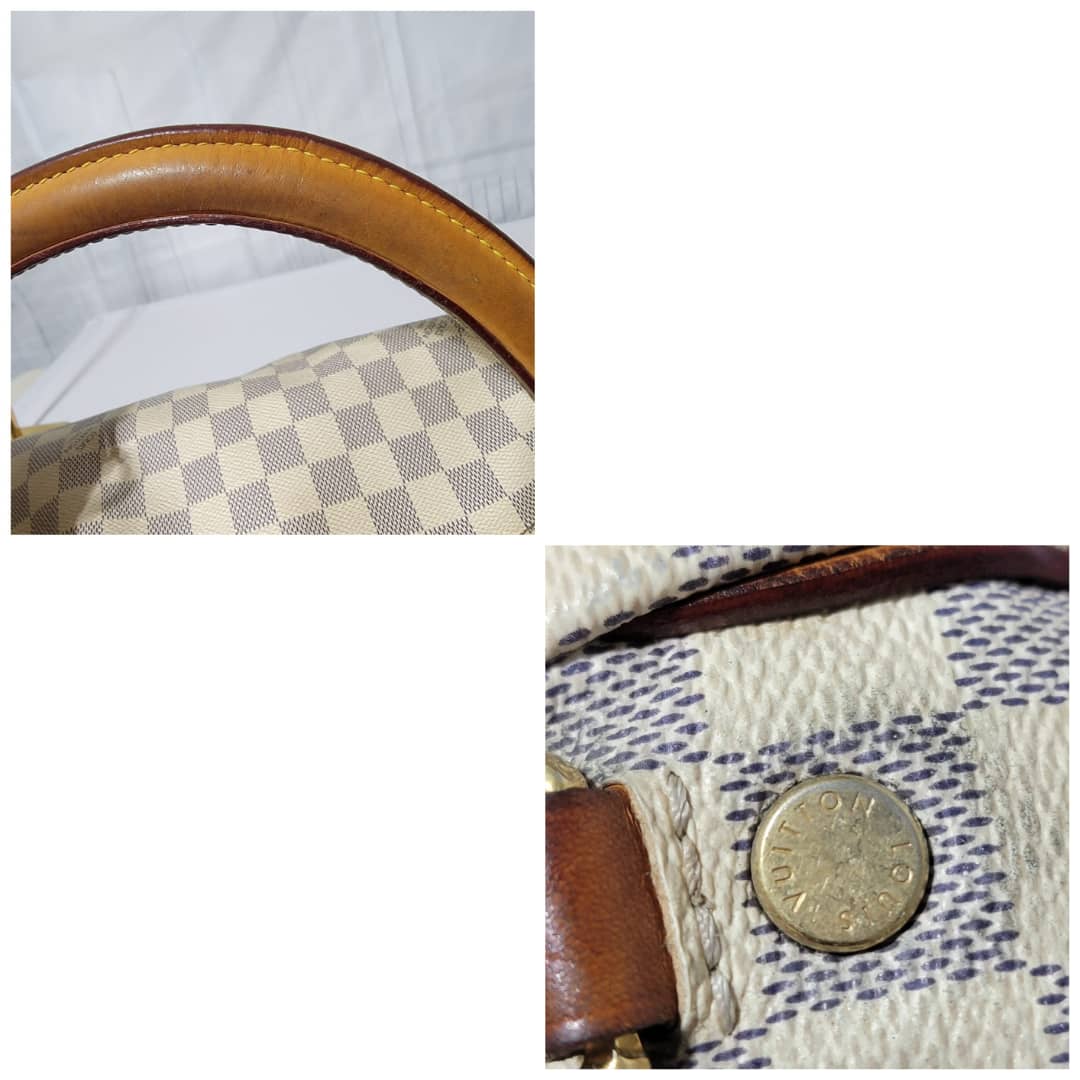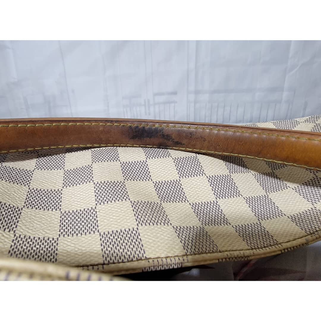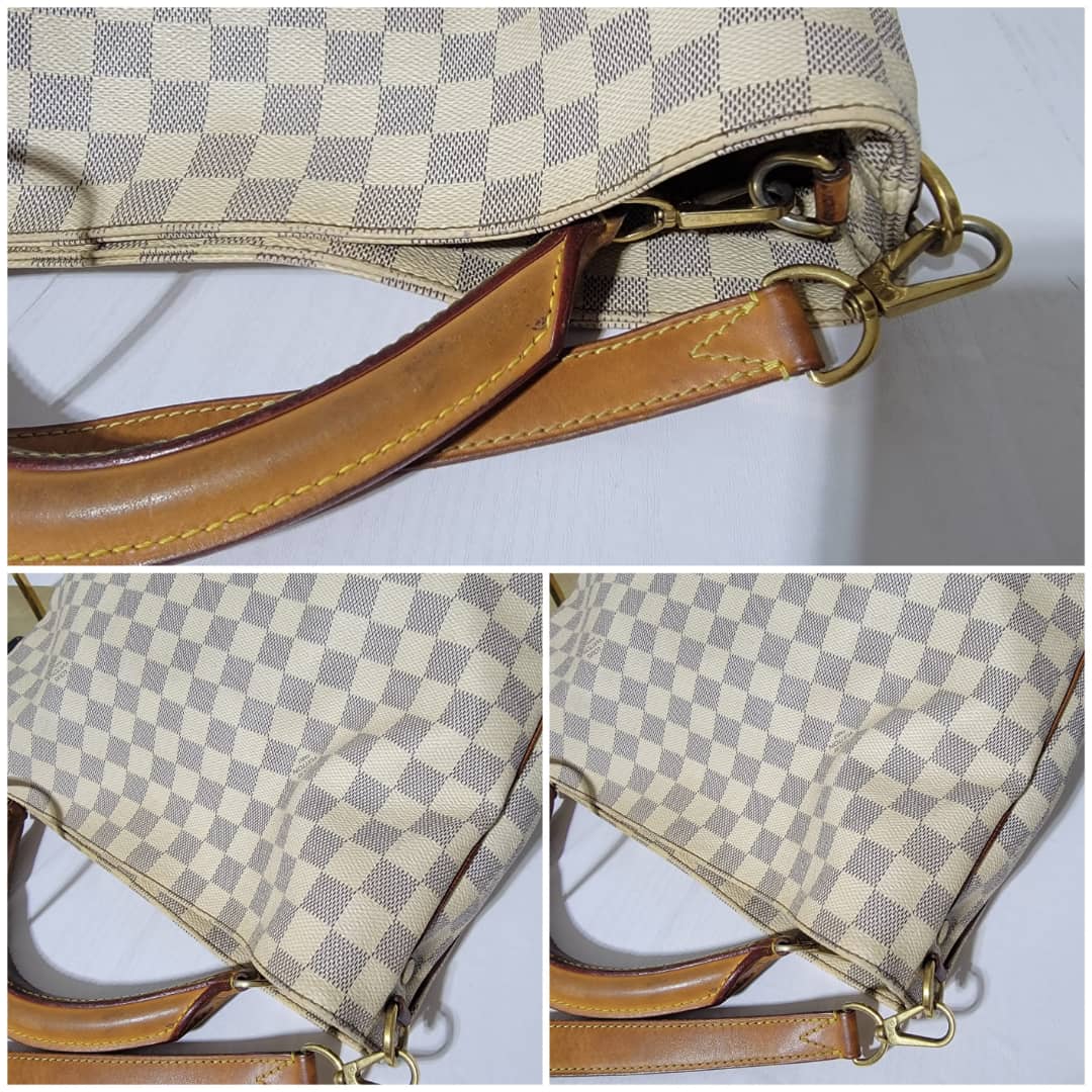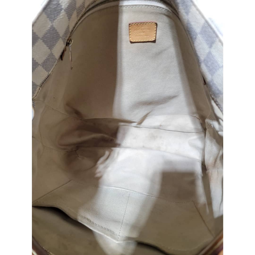 This authentic LOUIS VUITTON Damier Azur Soffi Hobo Satchel Bag is in it’s good pre-owned condition. The exterior coated canvas is clean and beautiful. The interior is clean, it shows little sign of use (Kindly look at pictures above). Gold hardware shows little bit of scratch. The vachatte leather that runs across the bag by the side and the handles and strap shows honey wear patina and little bit of watermark (Kindly look at pictures).