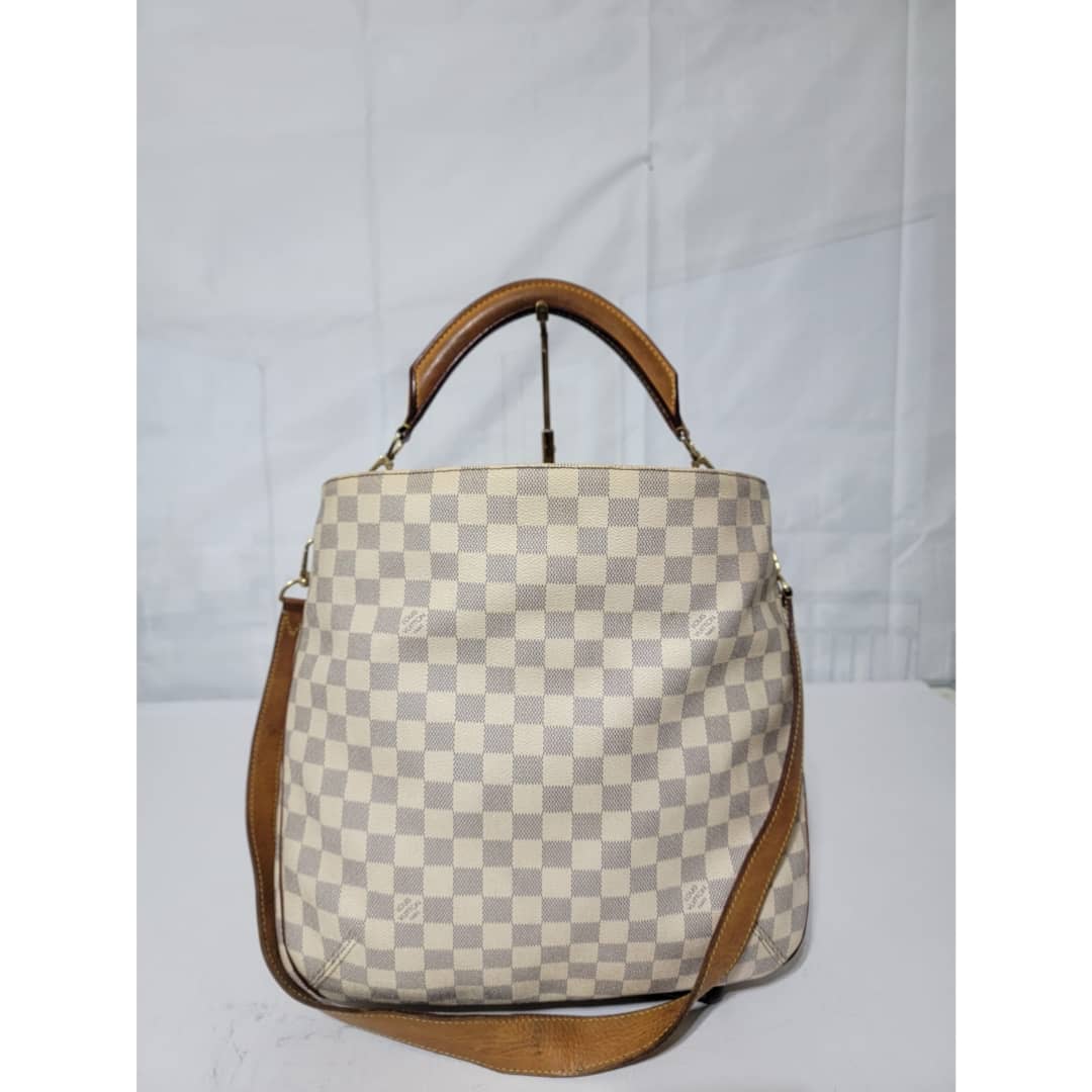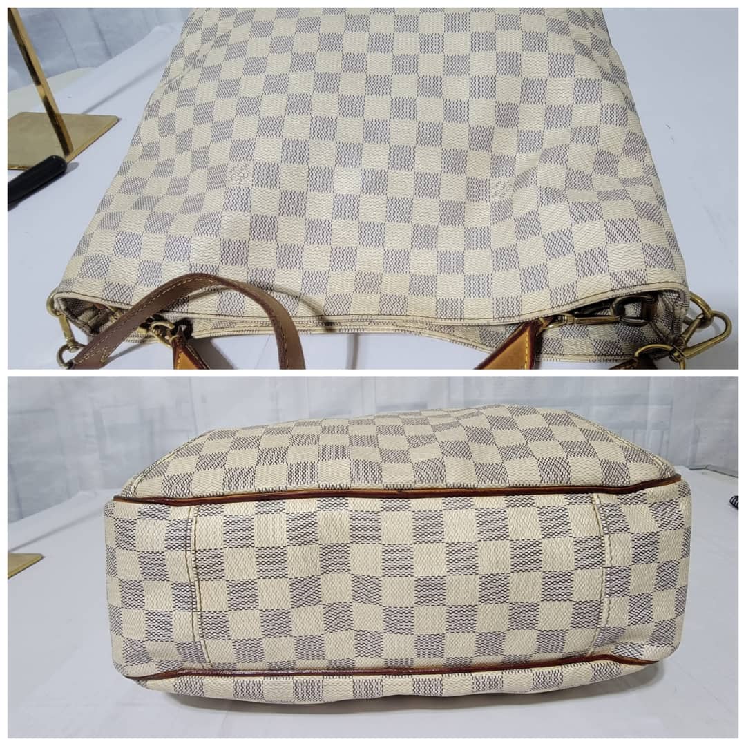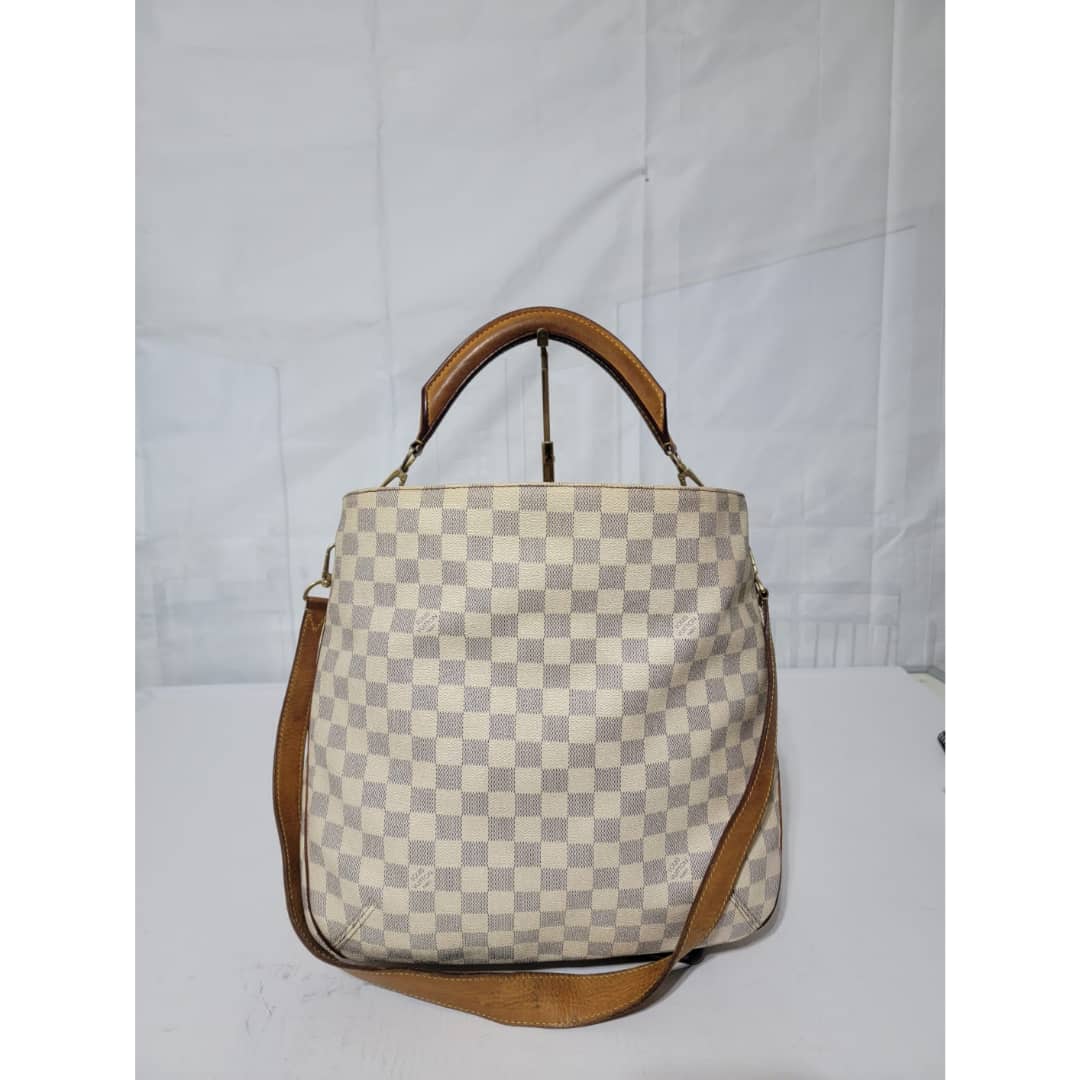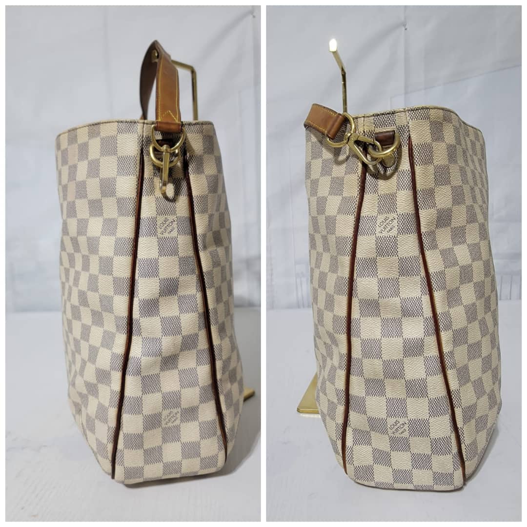 This authentic LOUIS VUITTON Damier Azur Soffi Hobo Satchel Bag is in it’s good pre-owned condition. The exterior coated canvas is clean and beautiful. The interior is clean, it shows little sign of use (Kindly look at pictures above). Gold hardware shows little bit of scratch. The vachatte leather that runs across the bag by the side and the handles and strap shows honey wear patina and little bit of watermark (Kindly look at pictures).