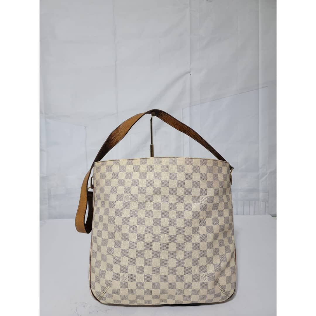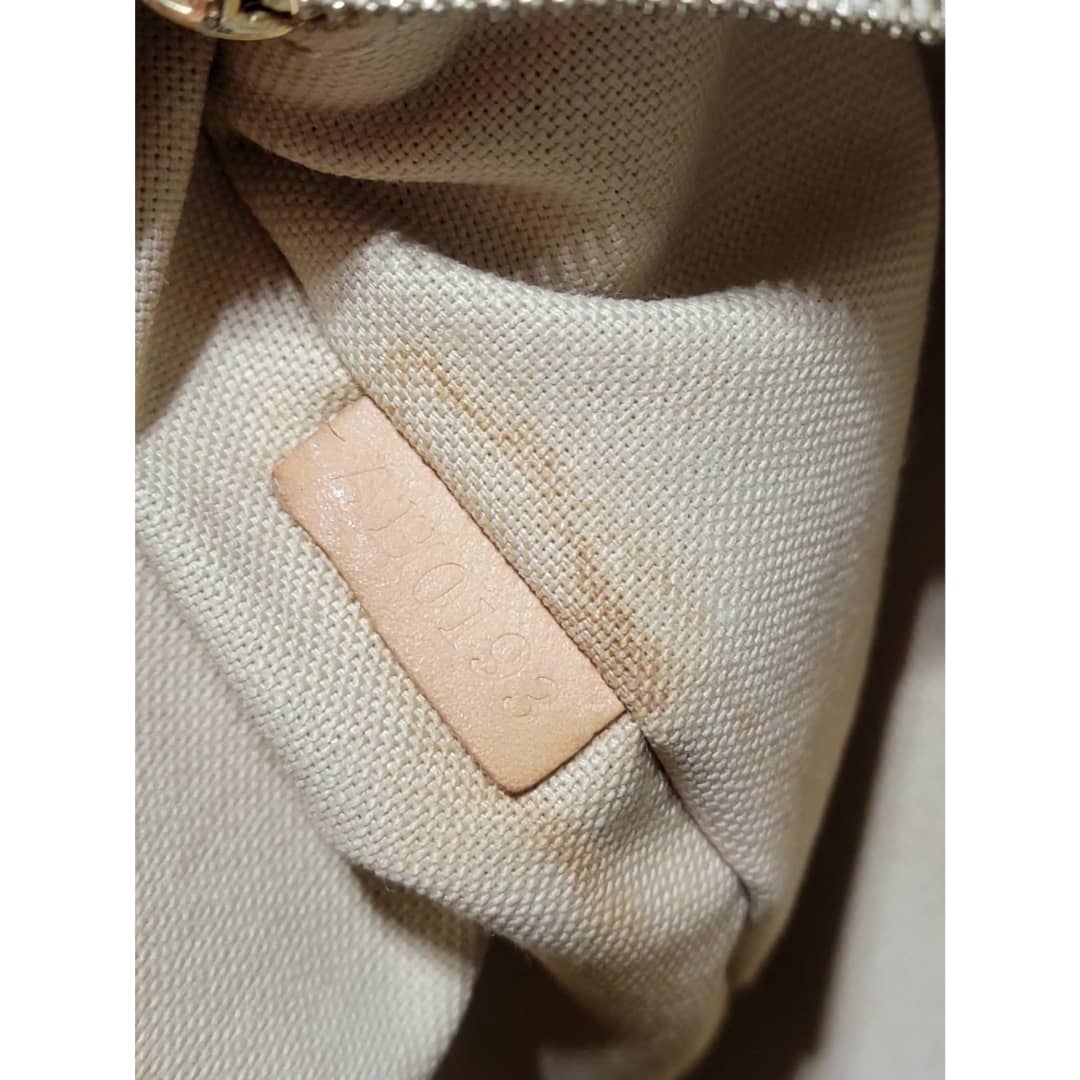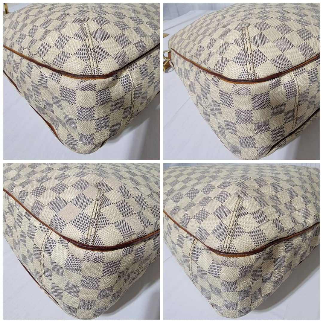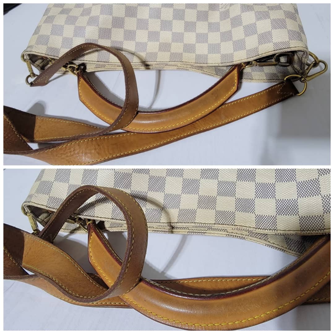 This authentic LOUIS VUITTON Damier Azur Soffi Hobo Satchel Bag is in it’s good pre-owned condition. The exterior coated canvas is clean and beautiful. The interior is clean, it shows little sign of use (Kindly look at pictures above). Gold hardware shows little bit of scratch. The vachatte leather that runs across the bag by the side and the handles and strap shows honey wear patina and little bit of watermark (Kindly look at pictures).